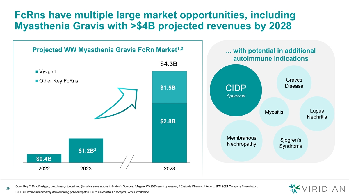 FcRns have multiple large market opportunities, including Myasthenia Gravis with >$4B projected revenues by 2028 1,2 Projected WW Myasthenia Gravis FcRn Market ... with potential in additional autoimmune indications $4.3B Vyvgart Graves Other Key FcRns Disease $1.5B CIDP Approved Lupus Myositis Nephritis $2.8B Membranous Sjogren’s Nephropathy Syndrome 3 $1.2B $0.4B 2022 2023 2028 1 2 3 Other Key FcRns: Rystiggo, batoclimab, nipocalimab (includes sales across indication). Sources: Argenx Q3 2023 earning release., Evaluate Pharma., Argenx JPM 2024 Company Presentation. 29 CIDP = Chronic inflammatory demyelinating polyneuropathy, FcRn = Neonatal Fc receptor, WW = Worldwide.
