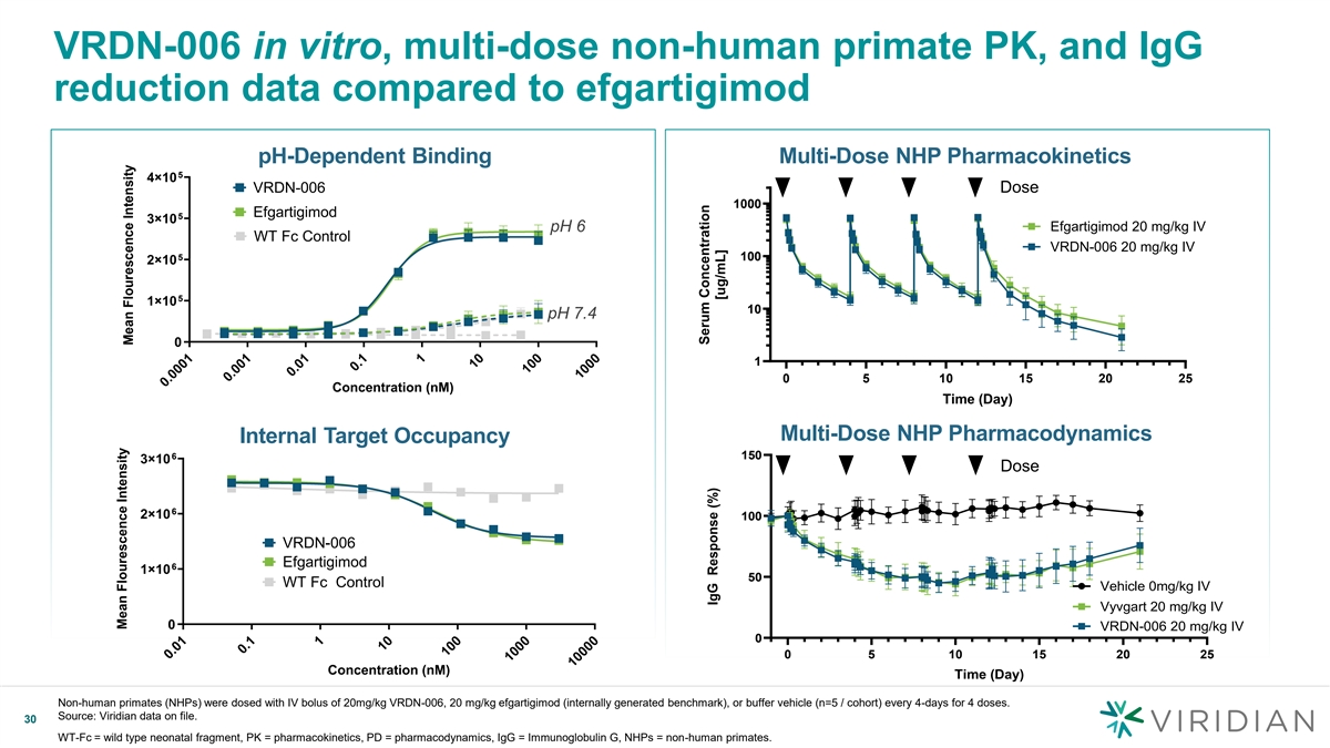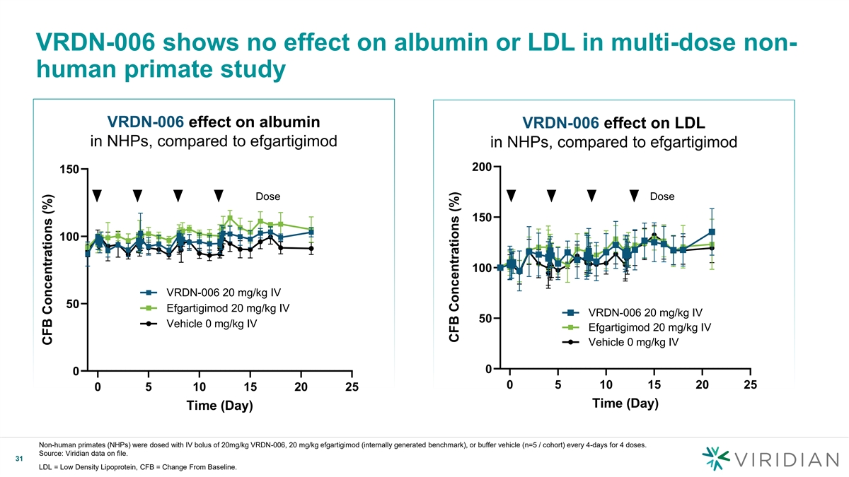 VRDN-006 in vitro, multi-dose non-human primate PK, and IgG reduction data compared to efgartigimod pH-Dependent Binding Multi-Dose NHP Pharmacokinetics 5 4×10 VRDN-006 Dose 1000 Efgartigimod 5 3×10 pH 6 Efgartigimod 20 mg/kg IV WT Fc Control VRDN-006 20 mg/kg IV 5 100 2×10 5 1×10 10 pH 7.4 0 1 0 5 10 15 20 25 Concentration (nM) Time (Day) Multi-Dose NHP Pharmacodynamics Internal Target Occupancy 6 150 3×10 Dose 6 2×10 100 VRDN-006 Efgartigimod 6 1×10 50 WT Fc Control Vehicle 0mg/kg IV Vyvgart 20 mg/kg IV 0 VRDN-006 20 mg/kg IV 0 0 5 10 15 20 25 Concentration (nM) Time (Day) Non-human primates (NHPs) were dosed with IV bolus of 20mg/kg VRDN-006, 20 mg/kg efgartigimod (internally generated benchmark), or buffer vehicle (n=5 / cohort) every 4-days for 4 doses. Source: Viridian data on file. 30 WT-Fc = wild type neonatal fragment, PK = pharmacokinetics, PD = pharmacodynamics, IgG = Immunoglobulin G, NHPs = non-human primates. 0.0001 0.001 0.01 0.1 1 0.01 10 0.1 100 1000 1 10 100 1000 10000 Mean Flourescence Intensity Mean Flourescence Intensity Serum Concentration IgG Response (%) [ug/mL]