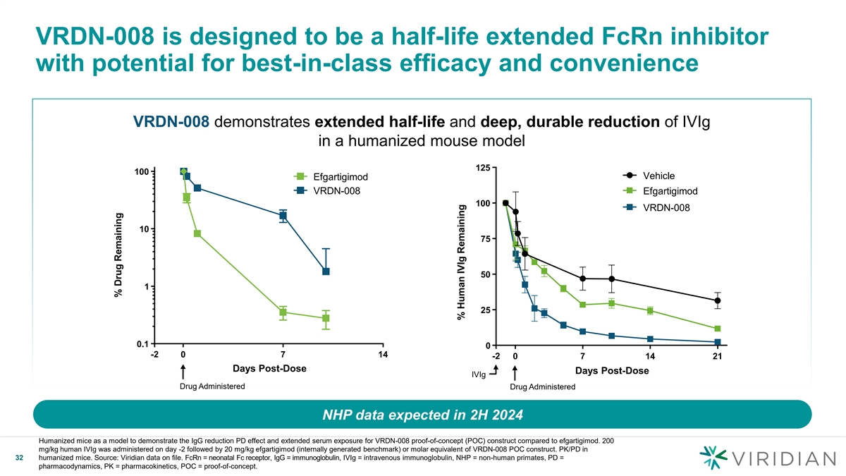 VRDN-008 is designed to be a half-life extended FcRn inhibitor with potential for best-in-class efficacy and convenience VRDN-008 demonstrates extended half-life and deep, durable reduction of IVIg in a humanized mouse model 125 100 Vehicle Efgartigimod VRDN-008 Efgartigimod 100 VRDN-008 10 75 50 1 25 0.1 0 -2 0 7 14 -2 0 7 14 21 Days Post-Dose Days Post-Dose IVIg Drug Administered Drug Administered NHP data expected in 2H 2024 Humanized mice as a model to demonstrate the IgG reduction PD effect and extended serum exposure for VRDN-008 proof-of-concept (POC) construct compared to efgartigimod. 200 mg/kg human IVIg was administered on day -2 followed by 20 mg/kg efgartigimod (internally generated benchmark) or molar equivalent of VRDN-008 POC construct. PK/PD in 32 humanized mice. Source: Viridian data on file. FcRn = neonatal Fc receptor, IgG = immunoglobulin, IVIg = intravenous immunoglobulin, NHP = non-human primates, PD = pharmacodynamics, PK = pharmacokinetics, POC = proof-of-concept. % Drug Remaining % Human IVIg Remaining