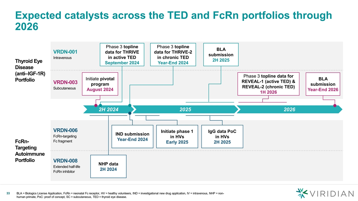 Expected catalysts across the TED and FcRn portfolios through 2026 Phase 3 topline Phase 3 topline BLA VRDN-001 data for THRIVE data for THRIVE-2 submission Intravenous in active TED in chronic TED 2H 2025 Thyroid Eye September 2024 Year-End 2024 Disease (anti–IGF-1R) Phase 3 topline data for Initiate pivotal BLA Portfolio REVEAL-1 (active TED) & VRDN-003 program submission REVEAL-2 (chronic TED) Subcutaneous August 2024 Year-End 2026 1H 2026 2H 2024 2025 2026 VRDN-006 Initiate phase 1 IgG data PoC IND submission FcRn-targeting in HVs in HVs Year-End 2024 Fc fragment FcRn- Early 2025 2H 2025 Targeting Autoimmune Portfolio VRDN-008 NHP data Extended half-life 2H 2024 FcRn inhibitor 33 BLA = Biologics License Application, FcRn = neonatal Fc receptor, HV = healthy volunteers, IND = investigational new drug application, IV = intravenous, NHP = non- human primate, PoC: proof of concept, SC = subcutaneous, TED = thyroid eye disease.