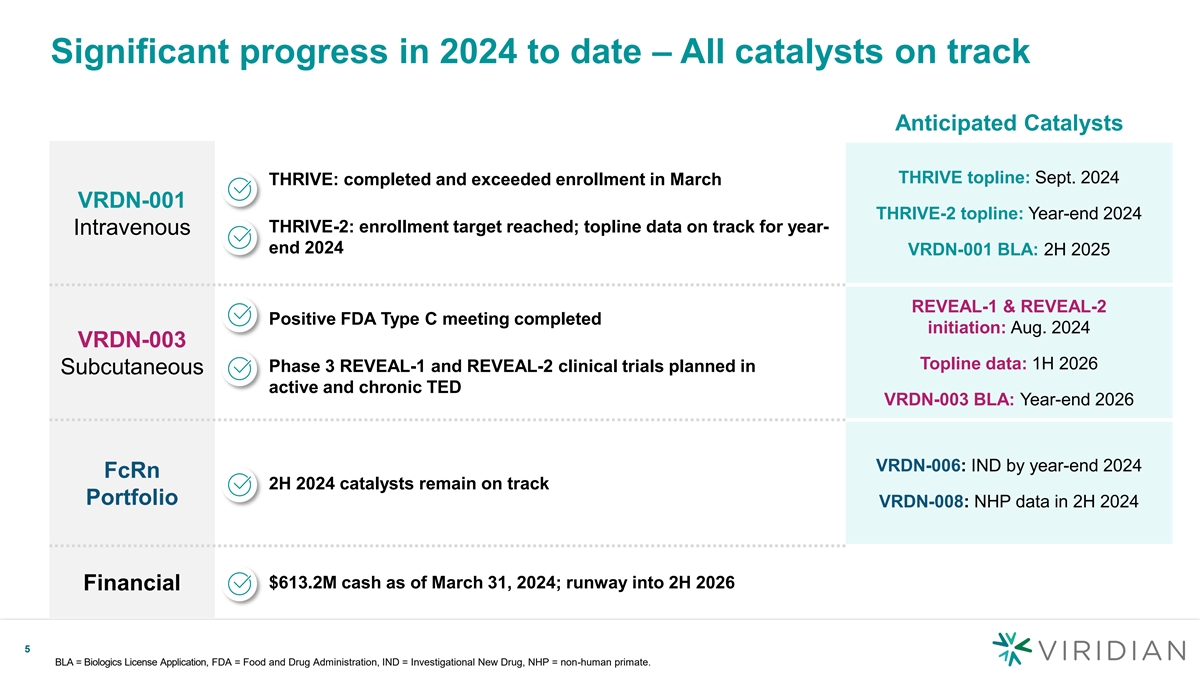 Differentiated pipeline: late-stage Thyroid Eye Disease programs and preclinical FcRn portfolio DISCOVERY PRECLINICAL PHASE 1 PHASE 2 PHASE 3 VRDN-001 Thyroid Eye Intravenous Disease (anti–IGF-1R) On track to Portfolio VRDN-003 initiate Phase 3 Subcutaneous in August 2024 VRDN-006 FcRn-targeting Fc fragment FcRn-Targeting Autoimmune Portfolio VRDN-008 Extended half-life FcRn inhibitor 4 FcRn = neonatal Fc receptor, IGF-1R = insulin-like growth factor-1 receptor, TED = thyroid eye disease.