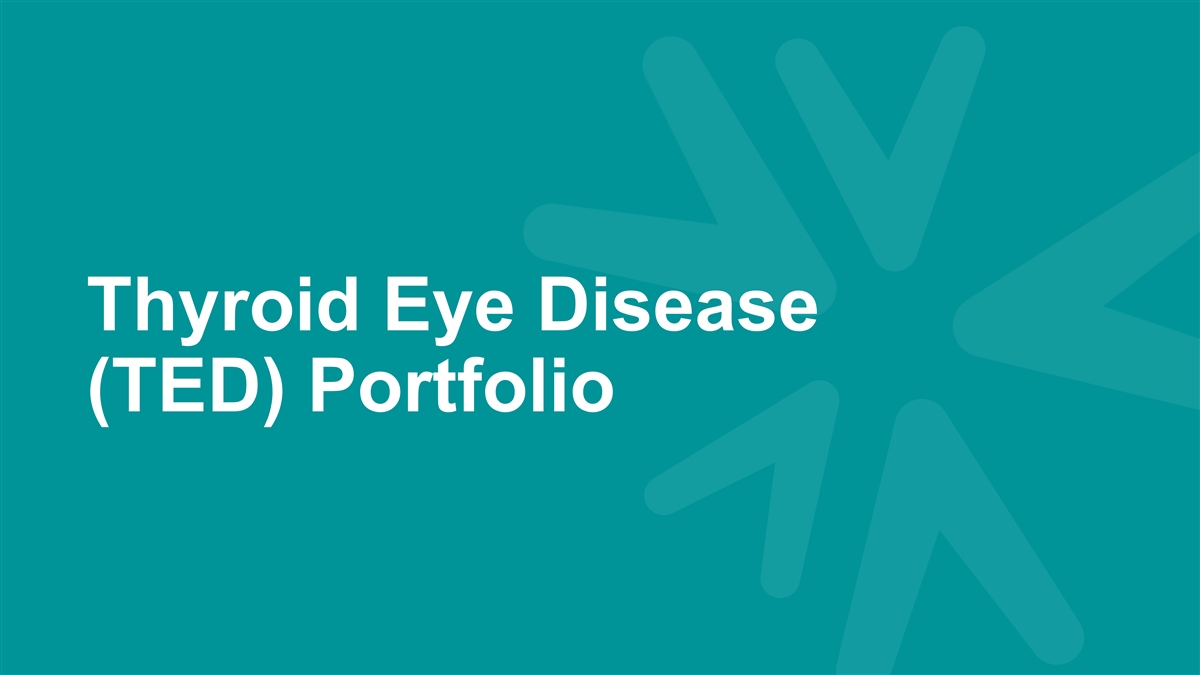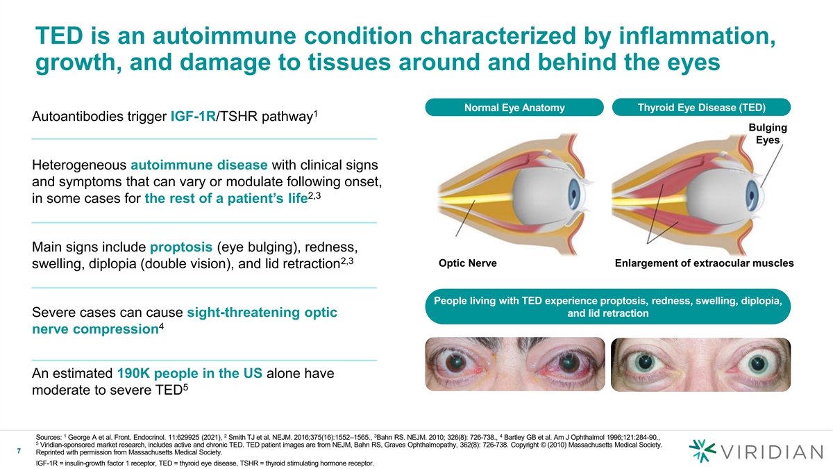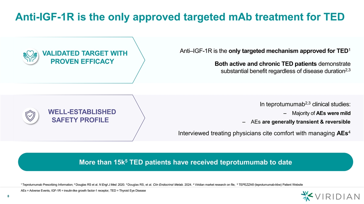 TED is an autoimmune condition characterized by inflammation, growth, and damage to tissues around and behind the eyes Normal Eye Anatomy Thyroid Eye Disease (TED) 1 Autoantibodies trigger IGF-1R/TSHR pathway Bulging Eyes Heterogeneous autoimmune disease with clinical signs and symptoms that can vary or modulate following onset, 2,3 in some cases for the rest of a patient’s life Main signs include proptosis (eye bulging), redness, 2,3 Optic Nerve Enlargement of extraocular muscles swelling, diplopia (double vision), and lid retraction People living with TED experience proptosis, redness, swelling, diplopia, Severe cases can cause sight-threatening optic and lid retraction 4 nerve compression An estimated 190K people in the US alone have 5 moderate to severe TED 1 2 3 4 Sources: George A et al. Front. Endocrinol. 11:629925 (2021), Smith TJ et al. NEJM. 2016;375(16):1552–1565., Bahn RS. NEJM. 2010; 326(8): 726-738., Bartley GB et al. Am J Ophthalmol 1996;121:284-90., 5 Viridian-sponsored market research, includes active and chronic TED. TED patient images are from NEJM, Bahn RS, Graves Ophthalmopathy, 362(8): 726-738. Copyright © (2010) Massachusetts Medical Society. 7 Reprinted with permission from Massachusetts Medical Society. IGF-1R = insulin-growth factor 1 receptor, TED = thyroid eye disease, TSHR = thyroid stimulating hormone receptor.