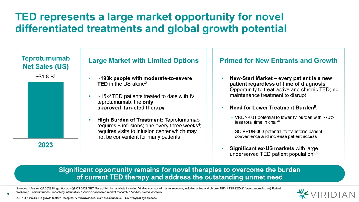 Anti-IGF-1R is the only approved targeted mAb treatment for TED 1 Anti–IGF-1R is the only targeted mechanism approved for TED VALIDATED TARGET WITH PROVEN EFFICACY Both active and chronic TED patients demonstrate 2,3 substantial benefit regardless of disease duration 2,3 In teprotumumab clinical studies: WELL-ESTABLISHED – Majority of AEs were mild SAFETY PROFILE – AEs are generally transient & reversible 4 Interviewed treating physicians cite comfort with managing AEs 5 More than 15k TED patients have received teprotumumab to date 1 2 3 4 5 Teprotumumab Prescribing Information; Douglas RS et al. N Engl J Med. 2020. Douglas RS, et al. Clin Endocrinol Metab. 2024. Viridian market research on file, TEPEZZA® (teprotumumab-trbw) Patient Website AEs = Adverse Events, IGF-1R = insulin-like growth factor-1 receptor, TED = Thyroid Eye Disease 8