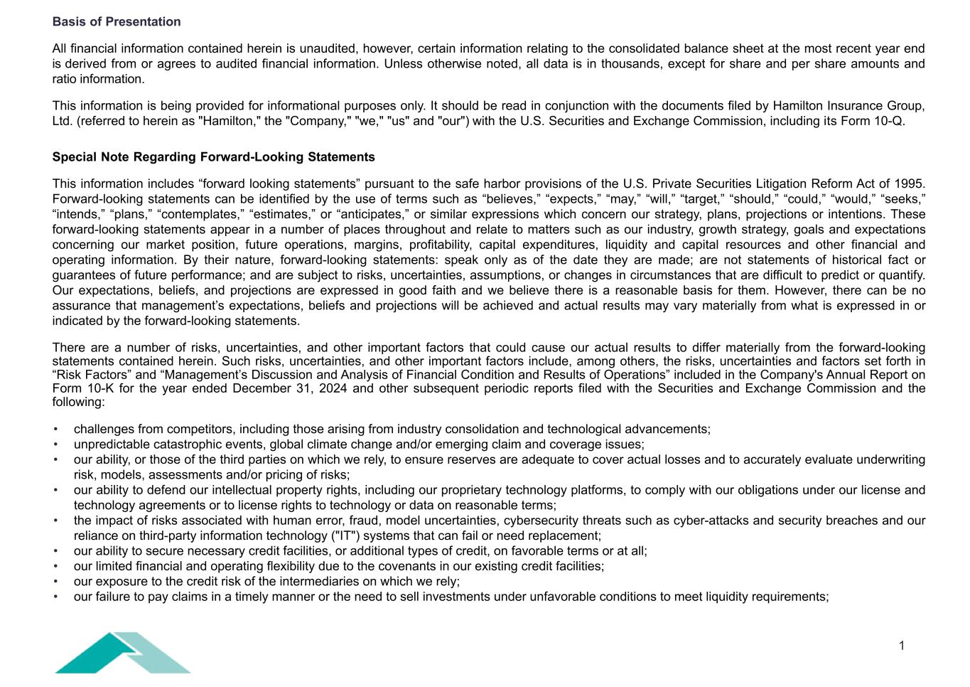 1 Basis of Presentation All financial information contained herein is unaudited, however, certain information relating to the consolidated balance sheet at the most recent year end is derived from or agrees to audited financial information. Unless otherwise noted, all data is in thousands, except for share and per share amounts and ratio information. This information is being provided for informational purposes only. It should be read in conjunction with the documents filed by Hamilton Insurance Group, Ltd. (referred to herein as "Hamilton," the "Company," "we," "us" and "our") with the U.S. Securities and Exchange Commission, including its Form 10-Q. Special Note Regarding Forward-Looking Statements This information includes “forward looking statements” pursuant to the safe harbor provisions of the U.S. Private Securities Litigation Reform Act of 1995. Forward-looking statements can be identified by the use of terms such as “believes,” “expects,” “may,” “will,” “target,” “should,” “could,” “would,” “seeks,” “intends,” “plans,” “contemplates,” “estimates,” or “anticipates,” or similar expressions which concern our strategy, plans, projections or intentions. These forward-looking statements appear in a number of places throughout and relate to matters such as our industry, growth strategy, goals and expectations concerning our market position, future operations, margins, profitability, capital expenditures, liquidity and capital resources and other financial and operating information. By their nature, forward-looking statements: speak only as of the date they are made; are not statements of historical fact or guarantees of future performance; and are subject to risks, uncertainties, assumptions, or changes in circumstances that are difficult to predict or quantify. Our expectations, beliefs, and projections are expressed in good faith and we believe there is a reasonable basis for them. However, there can be no assurance that management’s expectations, beliefs and projections will be achieved and actual results may vary materially from what is expressed in or indicated by the forward-looking statements. There are a number of risks, uncertainties, and other important factors that could cause our actual results to differ materially from the forward-looking statements contained herein. Such risks, uncertainties, and other important factors include, among others, the risks, uncertainties and factors set forth in “Risk Factors” and “Management’s Discussion and Analysis of Financial Condition and Results of Operations” included in the Company's Annual Report on Form 10-K for the year ended December 31, 2024 and other subsequent periodic reports filed with the Securities and Exchange Commission and the following: • challenges from competitors, including those arising from industry consolidation and technological advancements; • unpredictable catastrophic events, global climate change and/or emerging claim and coverage issues; • our ability, or those of the third parties on which we rely, to ensure reserves are adequate to cover actual losses and to accurately evaluate underwriting risk, models, assessments and/or pricing of risks; • our ability to defend our intellectual property rights, including our proprietary technology platforms, to comply with our obligations under our license and technology agreements or to license rights to technology or data on reasonable terms; • the impact of risks associated with human error, fraud, model uncertainties, cybersecurity threats such as cyber-attacks and security breaches and our reliance on third-party information technology ("IT") systems that can fail or need replacement; • our ability to secure necessary credit facilities, or additional types of credit, on favorable terms or at all; • our limited financial and operating flexibility due to the covenants in our existing credit facilities; • our exposure to the credit risk of the intermediaries on which we rely; • our failure to pay claims in a timely manner or the need to sell investments under unfavorable conditions to meet liquidity requirements;