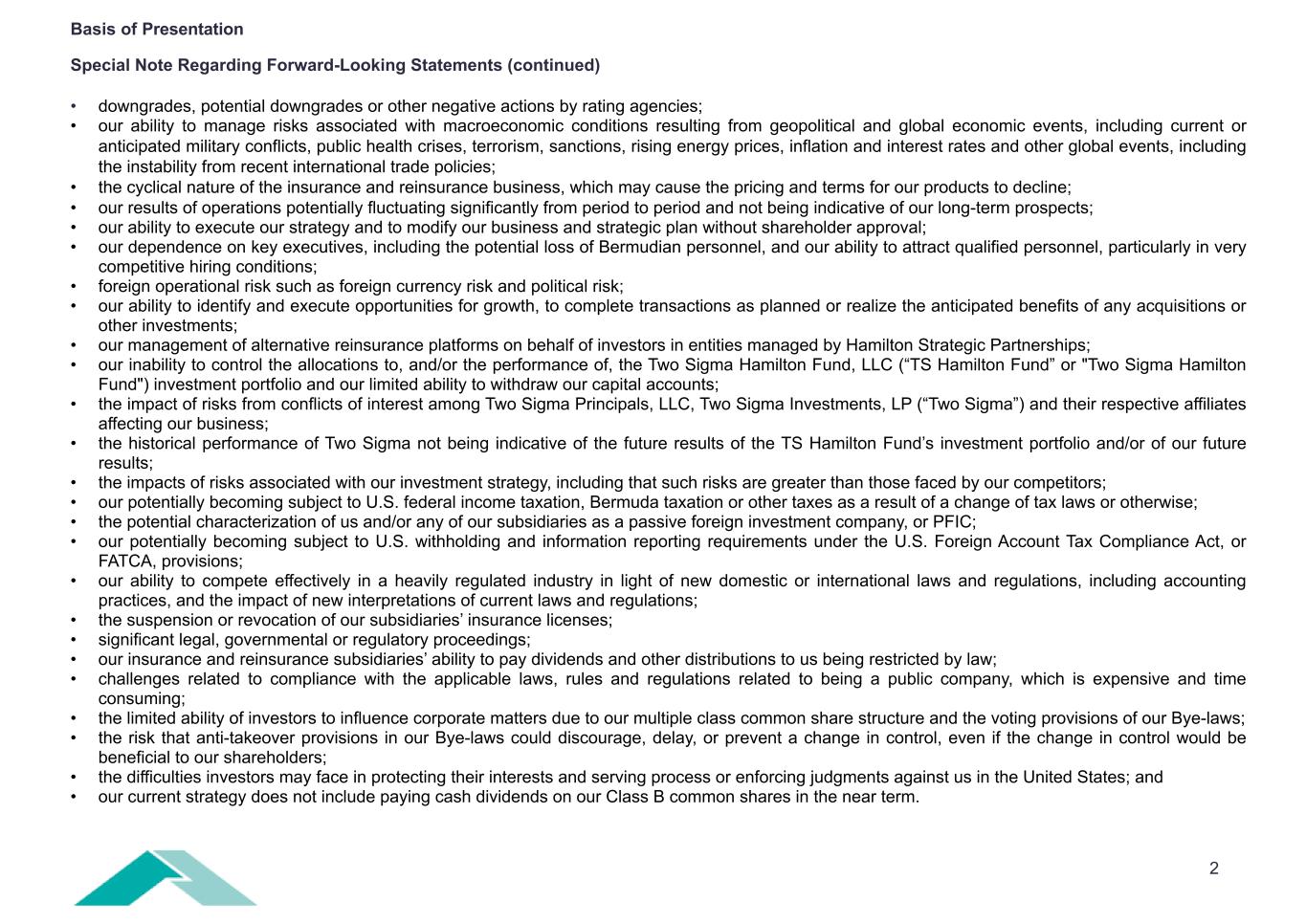 2 Basis of Presentation Special Note Regarding Forward-Looking Statements (continued) • downgrades, potential downgrades or other negative actions by rating agencies; • our ability to manage risks associated with macroeconomic conditions resulting from geopolitical and global economic events, including current or anticipated military conflicts, public health crises, terrorism, sanctions, rising energy prices, inflation and interest rates and other global events, including the instability from recent international trade policies; • the cyclical nature of the insurance and reinsurance business, which may cause the pricing and terms for our products to decline; • our results of operations potentially fluctuating significantly from period to period and not being indicative of our long-term prospects; • our ability to execute our strategy and to modify our business and strategic plan without shareholder approval; • our dependence on key executives, including the potential loss of Bermudian personnel, and our ability to attract qualified personnel, particularly in very competitive hiring conditions; • foreign operational risk such as foreign currency risk and political risk; • our ability to identify and execute opportunities for growth, to complete transactions as planned or realize the anticipated benefits of any acquisitions or other investments; • our management of alternative reinsurance platforms on behalf of investors in entities managed by Hamilton Strategic Partnerships; • our inability to control the allocations to, and/or the performance of, the Two Sigma Hamilton Fund, LLC (“TS Hamilton Fund” or "Two Sigma Hamilton Fund") investment portfolio and our limited ability to withdraw our capital accounts; • the impact of risks from conflicts of interest among Two Sigma Principals, LLC, Two Sigma Investments, LP (“Two Sigma”) and their respective affiliates affecting our business; • the historical performance of Two Sigma not being indicative of the future results of the TS Hamilton Fund’s investment portfolio and/or of our future results; • the impacts of risks associated with our investment strategy, including that such risks are greater than those faced by our competitors; • our potentially becoming subject to U.S. federal income taxation, Bermuda taxation or other taxes as a result of a change of tax laws or otherwise; • the potential characterization of us and/or any of our subsidiaries as a passive foreign investment company, or PFIC; • our potentially becoming subject to U.S. withholding and information reporting requirements under the U.S. Foreign Account Tax Compliance Act, or FATCA, provisions; • our ability to compete effectively in a heavily regulated industry in light of new domestic or international laws and regulations, including accounting practices, and the impact of new interpretations of current laws and regulations; • the suspension or revocation of our subsidiaries’ insurance licenses; • significant legal, governmental or regulatory proceedings; • our insurance and reinsurance subsidiaries’ ability to pay dividends and other distributions to us being restricted by law; • challenges related to compliance with the applicable laws, rules and regulations related to being a public company, which is expensive and time consuming; • the limited ability of investors to influence corporate matters due to our multiple class common share structure and the voting provisions of our Bye-laws; • the risk that anti-takeover provisions in our Bye-laws could discourage, delay, or prevent a change in control, even if the change in control would be beneficial to our shareholders; • the difficulties investors may face in protecting their interests and serving process or enforcing judgments against us in the United States; and • our current strategy does not include paying cash dividends on our Class B common shares in the near term.