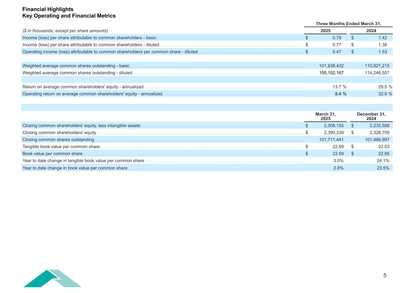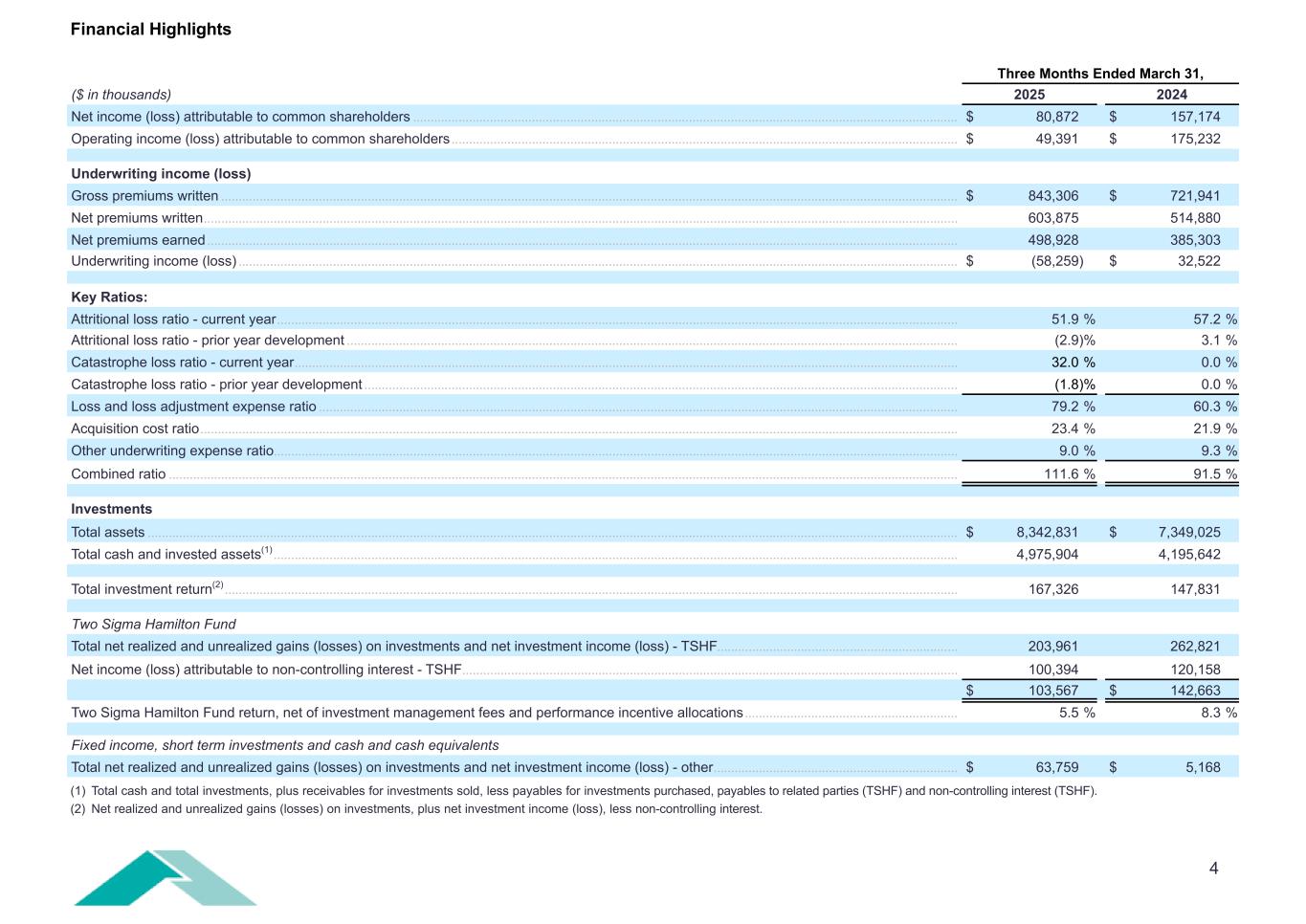 4 Financial Highlights Three Months Ended March 31, ($ in thousands) 2025 2024 Net income (loss) attributable to common shareholders ............................................................................................................................................................ $ 80,872 $ 157,174 Operating income (loss) attributable to common shareholders ................................................................................................................................................. $ 49,391 $ 175,232 Underwriting income (loss) Gross premiums written ................................................................................................................................................................................................................... $ 843,306 $ 721,941 Net premiums written ........................................................................................................................................................................................................................ 603,875 514,880 Net premiums earned ....................................................................................................................................................................................................................... 498,928 385,303 Underwriting income (loss) .............................................................................................................................................................................................................. $ (58,259) $ 32,522 Key Ratios: Attritional loss ratio - current year ................................................................................................................................................................................................... 51.9 % 57.2 % Attritional loss ratio - prior year development ............................................................................................................................................................................... (2.9) % 3.1 % Catastrophe loss ratio - current year .............................................................................................................................................................................................. 32.0 % 0.0 % Catastrophe loss ratio - prior year development .......................................................................................................................................................................... (1.8) % 0.0 % Loss and loss adjustment expense ratio ....................................................................................................................................................................................... 79.2 % 60.3 % Acquisition cost ratio ......................................................................................................................................................................................................................... 23.4 % 21.9 % Other underwriting expense ratio .................................................................................................................................................................................................... 9.0 % 9.3 % Combined ratio .................................................................................................................................................................................................................................. 111.6 % 91.5 % Investments Total assets ........................................................................................................................................................................................................................................ $ 8,342,831 $ 7,349,025 Total cash and invested assets(1) .................................................................................................................................................................................................... 4,975,904 4,195,642 Total investment return(2) .................................................................................................................................................................................................................. 167,326 147,831 Two Sigma Hamilton Fund Total net realized and unrealized gains (losses) on investments and net investment income (loss) - TSHF ..................................................................... 203,961 262,821 Net income (loss) attributable to non-controlling interest - TSHF .............................................................................................................................................. 100,394 120,158 $ 103,567 $ 142,663 Two Sigma Hamilton Fund return, net of investment management fees and performance incentive allocations ............................................................. 5.5 % 8.3 % Fixed income, short term investments and cash and cash equivalents Total net realized and unrealized gains (losses) on investments and net investment income (loss) - other ...................................................................... $ 63,759 $ 5,168 (1) Total cash and total investments, plus receivables for investments sold, less payables for investments purchased, payables to related parties (TSHF) and non-controlling interest (TSHF). (2) Net realized and unrealized gains (losses) on investments, plus net investment income (loss), less non-controlling interest.
