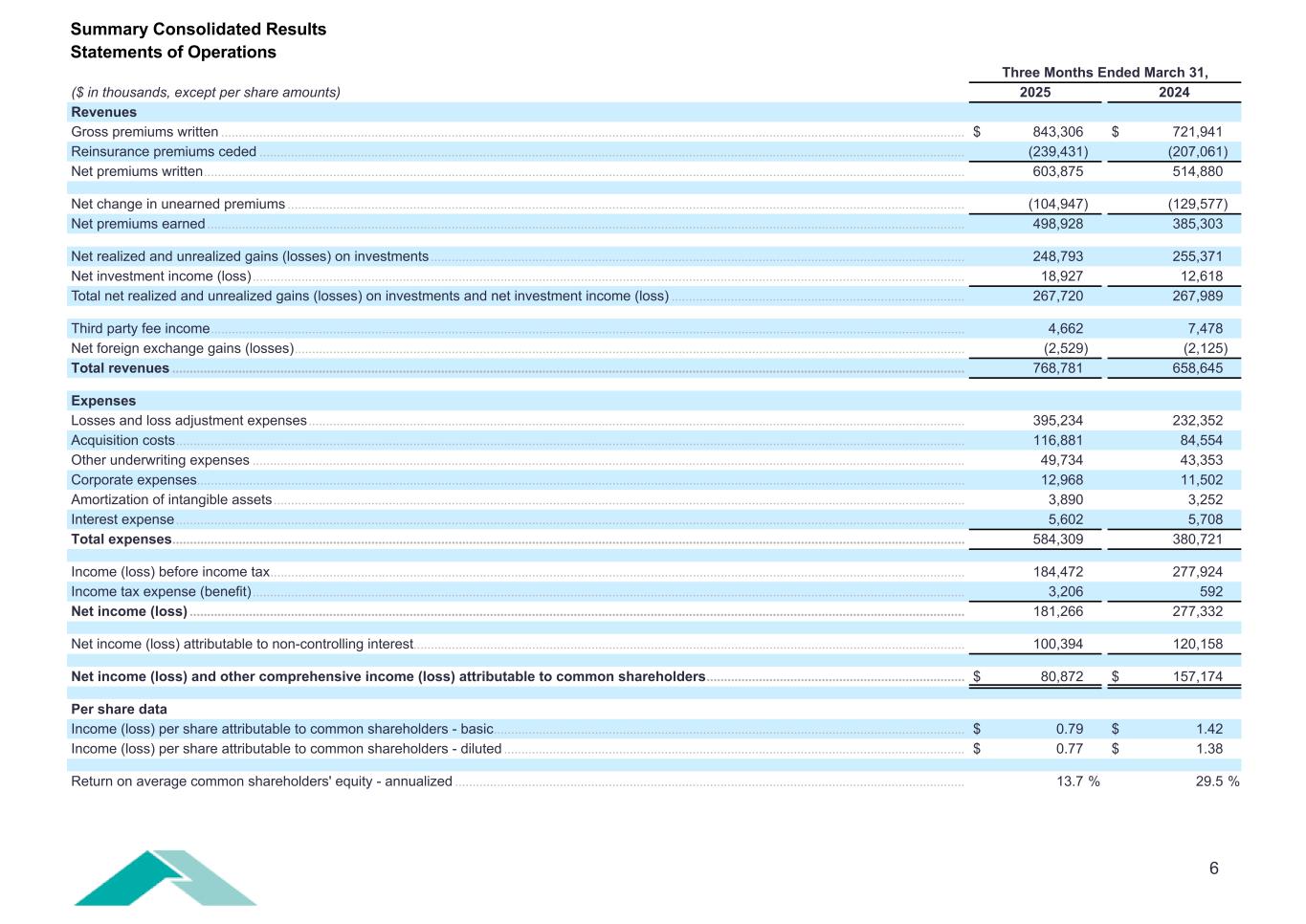 6 Three Months Ended March 31, ($ in thousands, except per share amounts) 2025 2024 Revenues Gross premiums written ..................................................................................................................................................................................................................... $ 843,306 $ 721,941 Reinsurance premiums ceded .......................................................................................................................................................................................................... (239,431) (207,061) Net premiums written .......................................................................................................................................................................................................................... 603,875 514,880 Net change in unearned premiums .................................................................................................................................................................................................. (104,947) (129,577) Net premiums earned ......................................................................................................................................................................................................................... 498,928 385,303 Net realized and unrealized gains (losses) on investments ......................................................................................................................................................... 248,793 255,371 Net investment income (loss) ............................................................................................................................................................................................................ 18,927 12,618 Total net realized and unrealized gains (losses) on investments and net investment income (loss) .................................................................................... 267,720 267,989 Third party fee income ........................................................................................................................................................................................................................ 4,662 7,478 Net foreign exchange gains (losses) ................................................................................................................................................................................................ (2,529) (2,125) Total revenues ................................................................................................................................................................................................................................... 768,781 658,645 Expenses Losses and loss adjustment expenses ............................................................................................................................................................................................ 395,234 232,352 Acquisition costs .................................................................................................................................................................................................................................. 116,881 84,554 Other underwriting expenses ............................................................................................................................................................................................................ 49,734 43,353 Corporate expenses ............................................................................................................................................................................................................................ 12,968 11,502 Amortization of intangible assets ...................................................................................................................................................................................................... 3,890 3,252 Interest expense .................................................................................................................................................................................................................................. 5,602 5,708 Total expenses ................................................................................................................................................................................................................................... 584,309 380,721 Income (loss) before income tax ....................................................................................................................................................................................................... 184,472 277,924 Income tax expense (benefit) ............................................................................................................................................................................................................ 3,206 592 Net income (loss) .............................................................................................................................................................................................................................. 181,266 277,332 Net income (loss) attributable to non-controlling interest .............................................................................................................................................................. 100,394 120,158 Net income (loss) and other comprehensive income (loss) attributable to common shareholders .......................................................................... $ 80,872 $ 157,174 Per share data Income (loss) per share attributable to common shareholders - basic ....................................................................................................................................... $ 0.79 $ 1.42 Income (loss) per share attributable to 