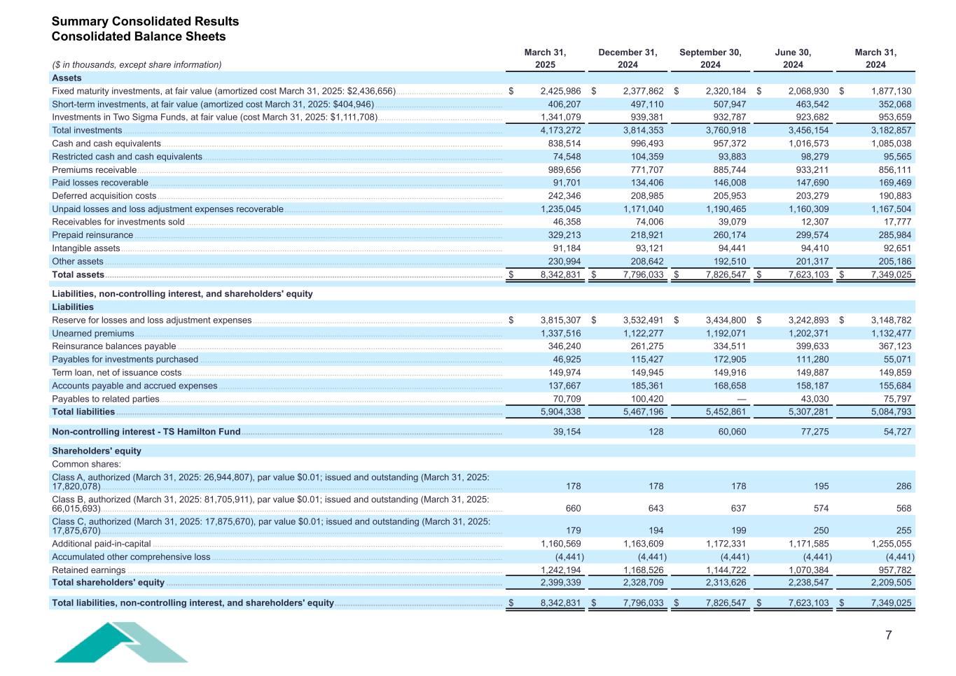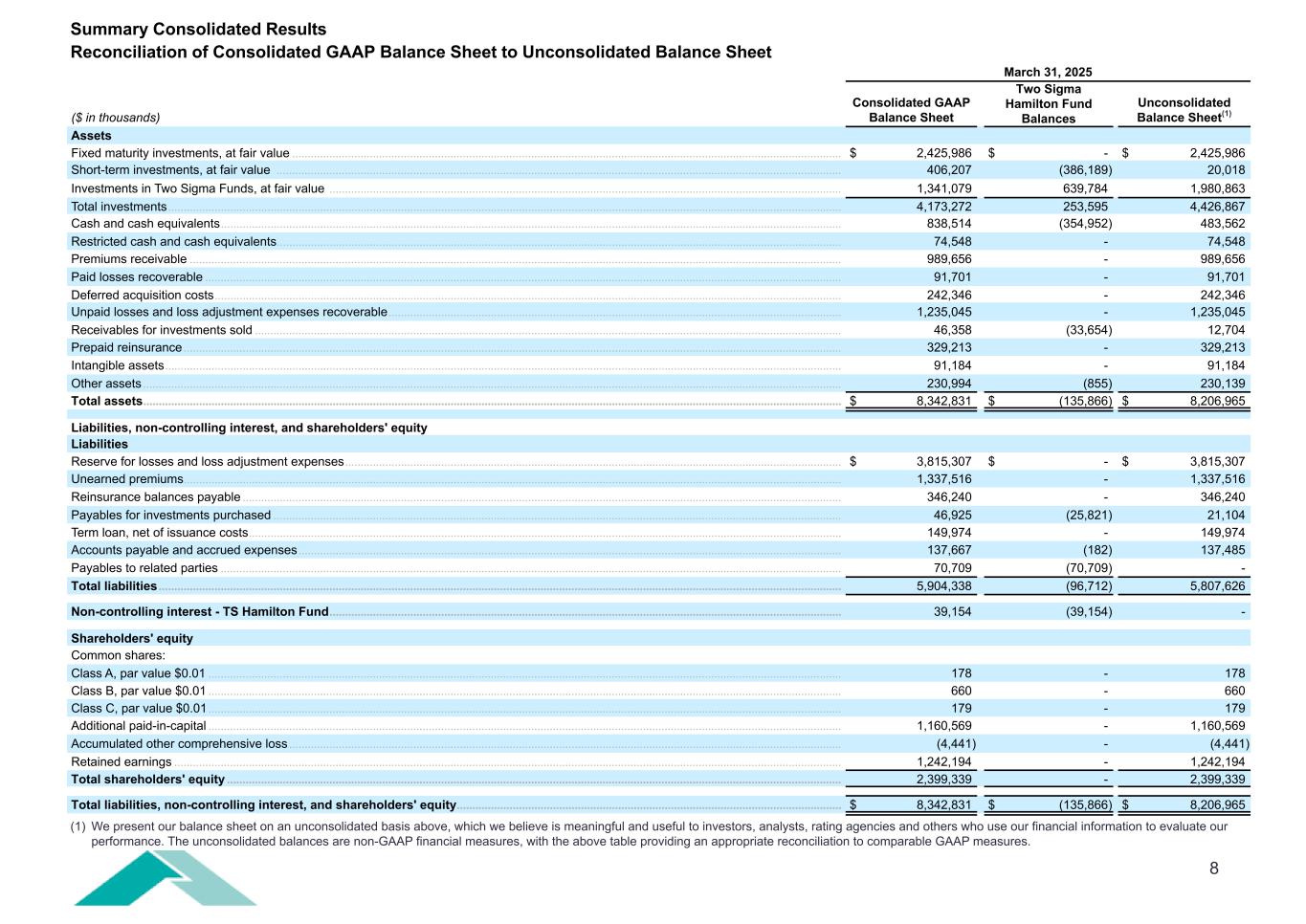 7 March 31, December 31, September 30, June 30, March 31, ($ in thousands, except share information) 2025 2024 2024 2024 2024 Assets Fixed maturity investments, at fair value (amortized cost March 31, 2025: $2,436,656) ............................................... $ 2,425,986 $ 2,377,862 $ 2,320,184 $ 2,068,930 $ 1,877,130 Short-term investments, at fair value (amortized cost March 31, 2025: $404,946) ........................................................ 406,207 497,110 507,947 463,542 352,068 Investments in Two Sigma Funds, at fair value (cost March 31, 2025: $1,111,708) ....................................................... 1,341,079 939,381 932,787 923,682 953,659 Total investments ....................................................................................................................................................................... 4,173,272 3,814,353 3,760,918 3,456,154 3,182,857 Cash and cash equivalents ...................................................................................................................................................... 838,514 996,493 957,372 1,016,573 1,085,038 Restricted cash and cash equivalents .................................................................................................................................... 74,548 104,359 93,883 98,279 95,565 Premiums receivable ................................................................................................................................................................. 989,656 771,707 885,744 933,211 856,111 Paid losses recoverable ........................................................................................................................................................... 91,701 134,406 146,008 147,690 169,469 Deferred acquisition costs ........................................................................................................................................................ 242,346 208,985 205,953 203,279 190,883 Unpaid losses and loss adjustment expenses recoverable ................................................................................................ 1,235,045 1,171,040 1,190,465 1,160,309 1,167,504 Receivables for investments sold ........................................................................................................................................... 46,358 74,006 39,079 12,307 17,777 Prepaid reinsurance .................................................................................................................................................................. 329,213 218,921 260,174 299,574 285,984 Intangible assets ........................................................................................................................................................................ 91,184 93,121 94,441 94,410 92,651 Other assets ............................................................................................................................................................................... 230,994 208,642 192,510 201,317 205,186 Total assets ............................................................................................................................................................................... $ 8,342,831 $ 7,796,033 $ 7,826,547 $ 7,623,103 $ 7,349,025 Liabilities, non-controlling interest, and shareholders' equity Liabilities Reserve for losses and loss adjustment expenses .............................................................................................................. $ 3,815,307 $ 3,532,491 $ 3,434,800 $ 3,242,893 $ 3,148,782 Unearned premiums .................................................................................................................................................................. 1,337,516 1,122,277 1,192,071 1,202,371 1,132,477 Reinsurance balances payable ............................................................................................................................................... 346,240 261,275 334,511 399,633 367,123 Payables for investments purchased ..................................................................................................................................... 46,925 115,427 172,905 111,280 55,071 Term loan, net of issuance costs ............................................................................................................................................. 149,974 149,945 149,916 149,887 149,859 Accounts payable and accrued expenses ............................................................................................................................. 137,667 185,361 168,658 158,187 155,684 Payables to related parties ....................................................................................................................................................... 70,709 100,420 — 43,030 75,797 Total liabilities .......................................................................................................................................................................... 5,904,338 5,467,196 5,452,861 5,307,281 5,084,793 Non-controlling interest - TS Hamilton Fund ................................................................................................................... 39,154 128 60,060 77,275 54,727 Shareholders' equity Common shares: Class A, authorized (March 31, 2025: 26,944,807), par value $0.01; issued and outstanding (March 31, 2025: 17,820,078) ................................................................................................................................................................................. 178 178 178 195 286 Class B, authorized (March 31, 2025: 81,705,911), par value $0.01; issued and outstanding (March 31, 2025: 66,015,693) ................................................................................................................................................................................. 66
