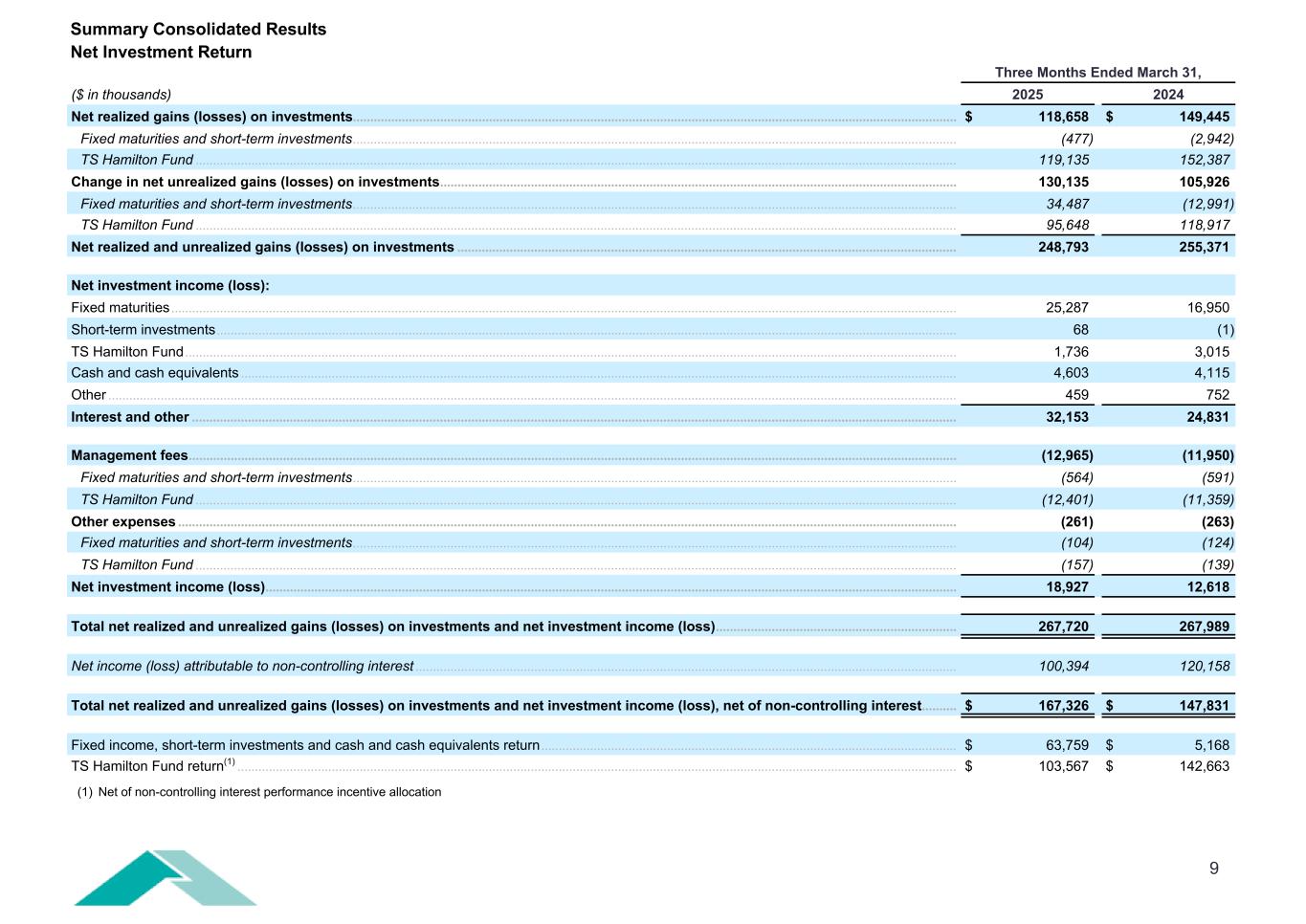 9 Three Months Ended March 31, ($ in thousands) 2025 2024 Net realized gains (losses) on investments ............................................................................................................................................................................. $ 118,658 $ 149,445 Fixed maturities and short-term investments ............................................................................................................................................................................. (477) (2,942) TS Hamilton Fund .......................................................................................................................................................................................................................... 119,135 152,387 Change in net unrealized gains (losses) on investments .................................................................................................................................................... 130,135 105,926 Fixed maturities and short-term investments ............................................................................................................................................................................. 34,487 (12,991) TS Hamilton Fund .......................................................................................................................................................................................................................... 95,648 118,917 Net realized and unrealized gains (losses) on investments ............................................................................................................................................... 248,793 255,371 Net investment income (loss): Fixed maturities ................................................................................................................................................................................................................................. 25,287 16,950 Short-term investments .................................................................................................................................................................................................................... 68 (1) TS Hamilton Fund ............................................................................................................................................................................................................................. 1,736 3,015 Cash and cash equivalents ............................................................................................................................................................................................................. 4,603 4,115 Other ................................................................................................................................................................................................................................................... 459 752 Interest and other ........................................................................................................................................................................................................................... 32,153 24,831 Management fees ............................................................................................................................................................................................................................ (12,965) (11,950) Fixed maturities and short-term investments ............................................................................................................................................................................. (564) (591) TS Hamilton Fund .......................................................................................................................................................................................................................... (12,401) (11,359) Other expenses ............................................................................................................................................................................................................................... (261) (263) Fixed maturities and short-term investments ............................................................................................................................................................................. (104) (124) TS Hamilton Fund .......................................................................................................................................................................................................................... (157) (139) Net investment income (loss) ...................................................................................................................................................................................................... 18,927 12,618 Total net realized and unrealized gains (losses) on investments and net investment income (loss) ..................................................................... 267,720 267,989 Net income (loss) attributable to non-controlling interest ........................................................................................................................................................... 100,394 120,158 Total net realized and unrealized gains (losses) on investments and net investment income (loss), net of non-controlling interest .......... $ 167,326 $ 147,831 Fixed income, short-term investments and cash and cash equivalents return ....................................................................................................................... $ 63,759 $ 5,168 TS Hamilton Fund return(1) .............................................................................................................................................................................................................. $ 103,567 $ 142,663 Summary Cons