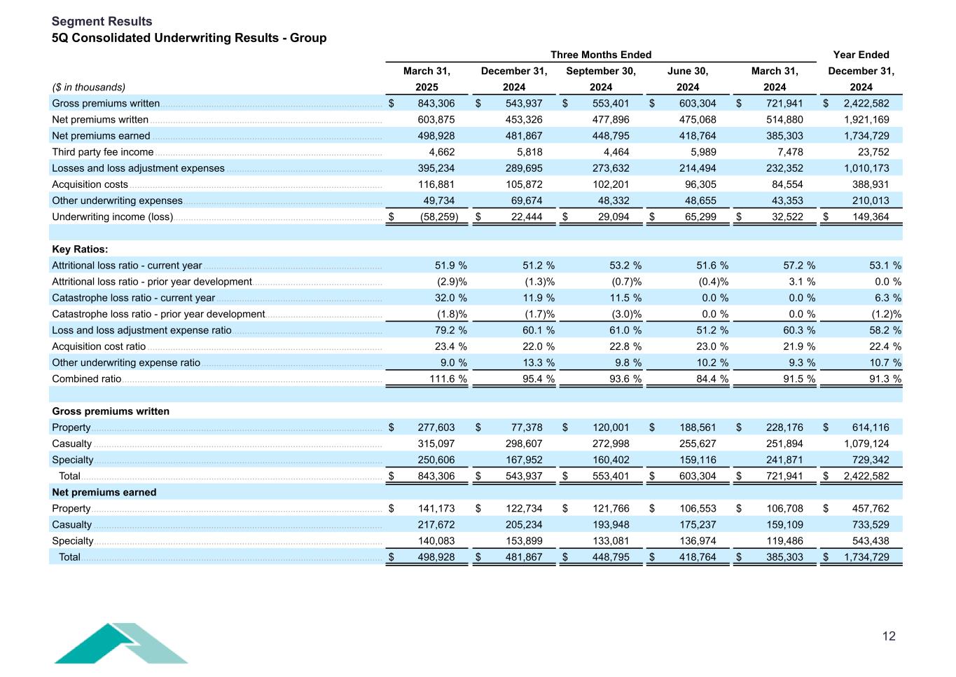 12 Three Months Ended Year Ended March 31, December 31, September 30, June 30, March 31, December 31, ($ in thousands) 2025 2024 2024 2024 2024 2024 Gross premiums written ....................................................................................... $ 843,306 $ 543,937 $ 553,401 $ 603,304 $ 721,941 $ 2,422,582 Net premiums written ........................................................................................... 603,875 453,326 477,896 475,068 514,880 1,921,169 Net premiums earned .......................................................................................... 498,928 481,867 448,795 418,764 385,303 1,734,729 Third party fee income ......................................................................................... 4,662 5,818 4,464 5,989 7,478 23,752 Losses and loss adjustment expenses ............................................................. 395,234 289,695 273,632 214,494 232,352 1,010,173 Acquisition costs ................................................................................................... 116,881 105,872 102,201 96,305 84,554 388,931 Other underwriting expenses .............................................................................. 49,734 69,674 48,332 48,655 43,353 210,013 Underwriting income (loss) .................................................................................. $ (58,259) $ 22,444 $ 29,094 $ 65,299 $ 32,522 $ 149,364 Key Ratios: Attritional loss ratio - current year ...................................................................... 51.9 % 51.2 % 53.2 % 51.6 % 57.2 % 53.1 % Attritional loss ratio - prior year development ................................................... (2.9) % (1.3) % (0.7) % (0.4) % 3.1 % 0.0 % Catastrophe loss ratio - current year ................................................................. 32.0 % 11.9 % 11.5 % 0.0 % 0.0 % 6.3 % Catastrophe loss ratio - prior year development .............................................. (1.8) % (1.7) % (3.0) % 0.0 % 0.0 % (1.2) % Loss and loss adjustment expense ratio ........................................................... 79.2 % 60.1 % 61.0 % 51.2 % 60.3 % 58.2 % Acquisition cost ratio ............................................................................................ 23.4 % 22.0 % 22.8 % 23.0 % 21.9 % 22.4 % Other underwriting expense ratio ....................................................................... 9.0 % 13.3 % 9.8 % 10.2 % 9.3 % 10.7 % Combined ratio ...................................................................................................... 111.6 % 95.4 % 93.6 % 84.4 % 91.5 % 91.3 % Gross premiums written Property .................................................................................................................. $ 277,603 $ 77,378 $ 120,001 $ 188,561 $ 228,176 $ 614,116 Casualty ................................................................................................................. 315,097 298,607 272,998 255,627 251,894 1,079,124 Specialty ................................................................................................................. 250,606 167,952 160,402 159,116 241,871 729,342 Total ...................................................................................................................... $ 843,306 $ 543,937 $ 553,401 $ 603,304 $ 721,941 $ 2,422,582 Net premiums earned Property .................................................................................................................. $ 141,173 $ 122,734 $ 121,766 $ 106,553 $ 106,708 $ 457,762 Casualty ................................................................................................................. 217,672 205,234 193,948 175,237 159,109 733,529 Specialty ................................................................................................................. 140,083 153,899 133,081 136,974 119,486 543,438 Total ...................................................................................................................... $ 498,928 $ 481,867 $ 448,795 $ 418,764 $ 385,303 $ 1,734,729 Segment Results 5Q Consolidated Underwriting Results - Group