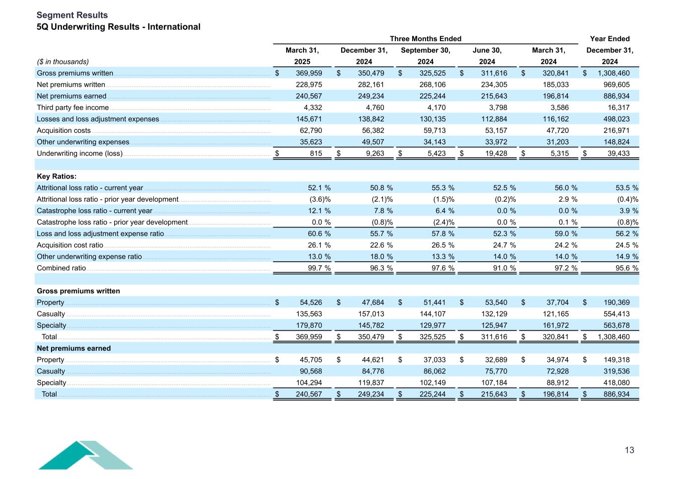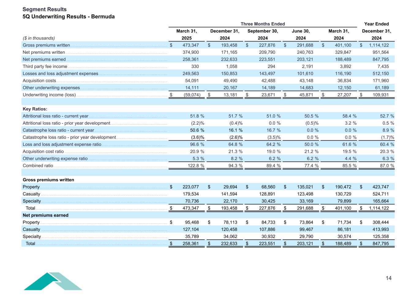 13 Three Months Ended Year Ended March 31, December 31, September 30, June 30, March 31, December 31, ($ in thousands) 2025 2024 2024 2024 2024 2024 Gross premiums written ....................................................................................... $ 369,959 $ 350,479 $ 325,525 $ 311,616 $ 320,841 $ 1,308,460 Net premiums written ........................................................................................... 228,975 282,161 268,106 234,305 185,033 969,605 Net premiums earned .......................................................................................... 240,567 249,234 225,244 215,643 196,814 886,934 Third party fee income ......................................................................................... 4,332 4,760 4,170 3,798 3,586 16,317 Losses and loss adjustment expenses ............................................................. 145,671 138,842 130,135 112,884 116,162 498,023 Acquisition costs ................................................................................................... 62,790 56,382 59,713 53,157 47,720 216,971 Other underwriting expenses .............................................................................. 35,623 49,507 34,143 33,972 31,203 148,824 Underwriting income (loss) .................................................................................. $ 815 $ 9,263 $ 5,423 $ 19,428 $ 5,315 $ 39,433 Key Ratios: Attritional loss ratio - current year ...................................................................... 52.1 % 50.8 % 55.3 % 52.5 % 56.0 % 53.5 % Attritional loss ratio - prior year development ................................................... (3.6) % (2.1) % (1.5) % (0.2) % 2.9 % (0.4) % Catastrophe loss ratio - current year ................................................................. 12.1 % 7.8 % 6.4 % 0.0 % 0.0 % 3.9 % Catastrophe loss ratio - prior year development .............................................. 0.0 % (0.8) % (2.4) % 0.0 % 0.1 % (0.8) % Loss and loss adjustment expense ratio ........................................................... 60.6 % 55.7 % 57.8 % 52.3 % 59.0 % 56.2 % Acquisition cost ratio ............................................................................................ 26.1 % 22.6 % 26.5 % 24.7 % 24.2 % 24.5 % Other underwriting expense ratio ....................................................................... 13.0 % 18.0 % 13.3 % 14.0 % 14.0 % 14.9 % Combined ratio ...................................................................................................... 99.7 % 96.3 % 97.6 % 91.0 % 97.2 % 95.6 % Gross premiums written Property .................................................................................................................. $ 54,526 $ 47,684 $ 51,441 $ 53,540 $ 37,704 $ 190,369 Casualty ................................................................................................................. 135,563 157,013 144,107 132,129 121,165 554,413 Specialty ................................................................................................................. 179,870 145,782 129,977 125,947 161,972 563,678 Total ...................................................................................................................... $ 369,959 $ 350,479 $ 325,525 $ 311,616 $ 320,841 $ 1,308,460 Net premiums earned Property .................................................................................................................. $ 45,705 $ 44,621 $ 37,033 $ 32,689 $ 34,974 $ 149,318 Casualty ................................................................................................................. 90,568 84,776 86,062 75,770 72,928 319,536 Specialty ................................................................................................................. 104,294 119,837 102,149 107,184 88,912 418,080 Total ...................................................................................................................... $ 240,567 $ 249,234 $ 225,244 $ 215,643 $ 196,814 $ 886,934 Segment Results 5Q Underwriting Results - International