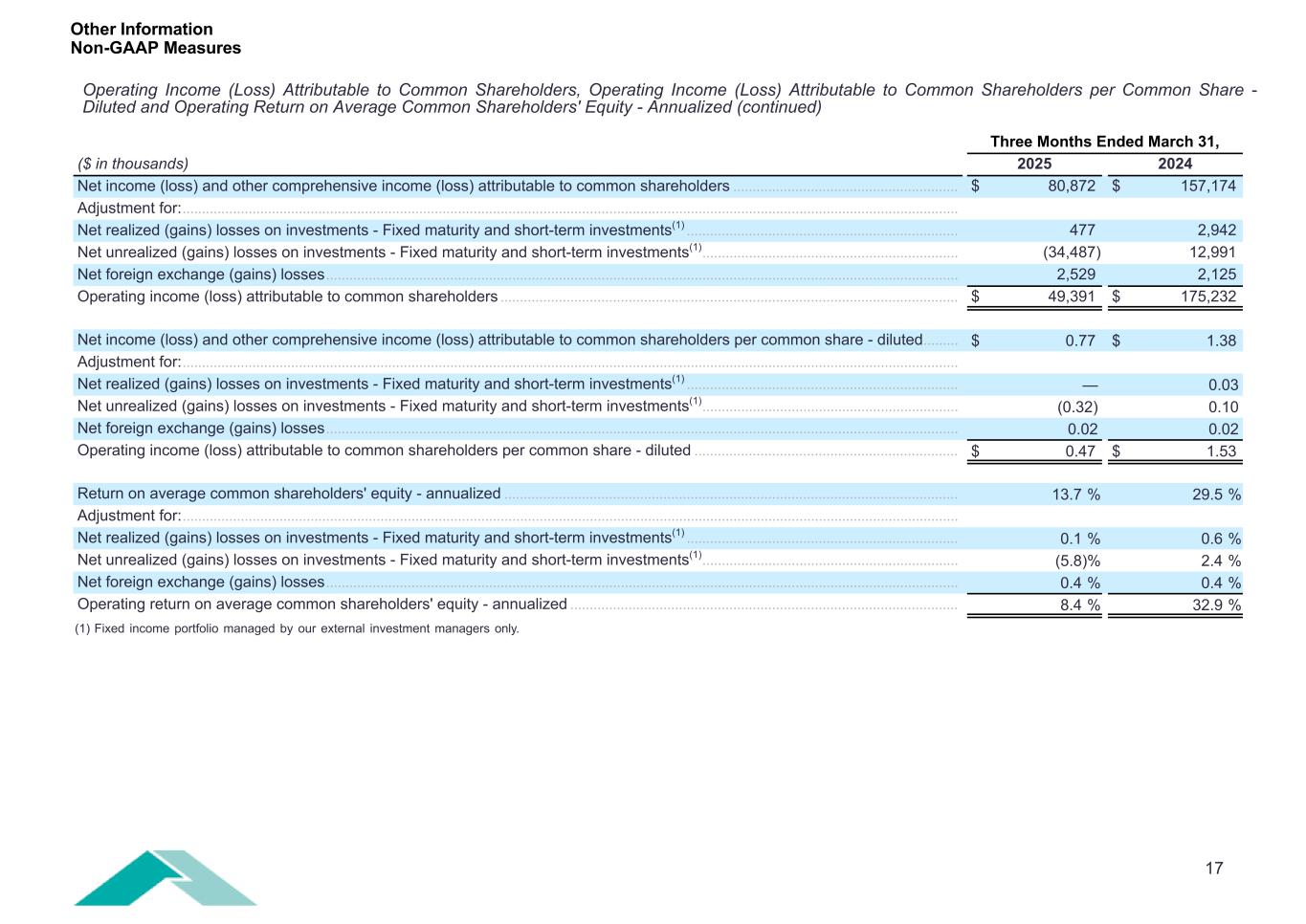 17 Return on average common shareholders' equity - annualized ..................................................................................................................... 13.7 % 29.5 % Adjustment for: ........................................................................................................................................................................................................ Net realized (gains) losses on investments - Fixed maturity and short-term investments(1) ...................................................................... 0.1 % 0.6 % Net unrealized (gains) losses on investments - Fixed maturity and short-term investments(1) .................................................................. (5.8) % 2.4 % Net foreign exchange (gains) losses ................................................................................................................................................................... 0.4 % 0.4 % Operating return on average common shareholders' equity - annualized .................................................................................................... 8.4 % 32.9 % Other Information Non-GAAP Measures Net income (loss) and other comprehensive income (loss) attributable to common shareholders per common share - diluted ......... $ 0.77 $ 1.38 Adjustment for: ........................................................................................................................................................................................................ Net realized (gains) losses on investments - Fixed maturity and short-term investments(1) ...................................................................... — 0.03 Net unrealized (gains) losses on investments - Fixed maturity and short-term investments(1) .................................................................. (0.32) 0.10 Net foreign exchange (gains) losses ................................................................................................................................................................... 0.02 0.02 Operating income (loss) attributable to common shareholders per common share - diluted .................................................................... $ 0.47 $ 1.53 Three Months Ended March 31, ($ in thousands) 2025 2024 Net income (loss) and other comprehensive income (loss) attributable to common shareholders .......................................................... $ 80,872 $ 157,174 Adjustment for: ........................................................................................................................................................................................................ Net realized (gains) losses on investments - Fixed maturity and short-term investments(1) ...................................................................... 477 2,942 Net unrealized (gains) losses on investments - Fixed maturity and short-term investments(1) .................................................................. (34,487) 12,991 Net foreign exchange (gains) losses ................................................................................................................................................................... 2,529 2,125 Operating income (loss) attributable to common shareholders ...................................................................................................................... $ 49,391 $ 175,232 Operating Income (Loss) Attributable to Common Shareholders, Operating Income (Loss) Attributable to Common Shareholders per Common Share - Diluted and Operating Return on Average Common Shareholders' Equity - Annualized (continued) (1) Fixed income portfolio managed by our external investment managers only.