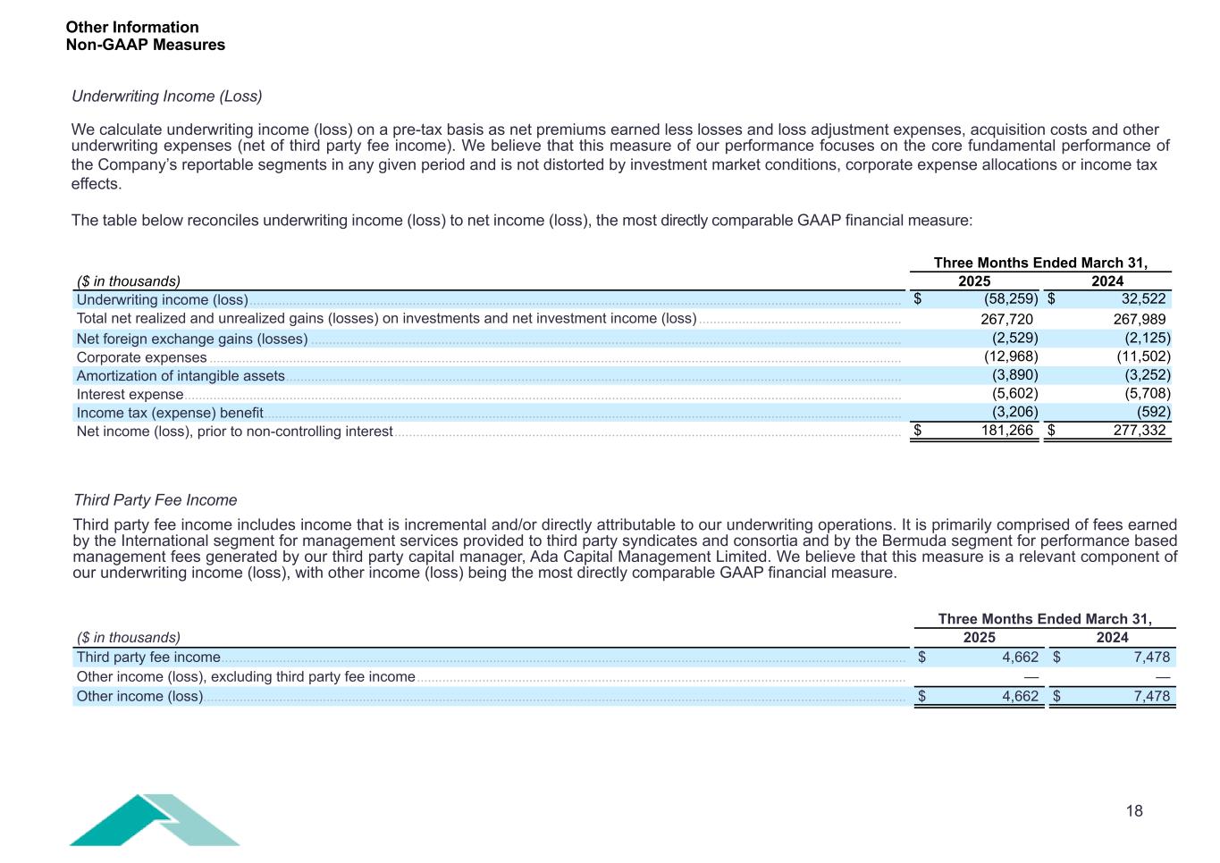 18 Underwriting Income (Loss) We calculate underwriting income (loss) on a pre-tax basis as net premiums earned less losses and loss adjustment expenses, acquisition costs and other underwriting expenses (net of third party fee income). We believe that this measure of our performance focuses on the core fundamental performance of the Company’s reportable segments in any given period and is not distorted by investment market conditions, corporate expense allocations or income tax effects. The table below reconciles underwriting income (loss) to net income (loss), the most directly comparable GAAP financial measure: Three Months Ended March 31, ($ in thousands) 2025 2024 Underwriting income (loss) .................................................................................................................................................................................... $ (58,259) $ 32,522 Total net realized and unrealized gains (losses) on investments and net investment income (loss) ........................................................ 267,720 267,989 Net foreign exchange gains (losses) ................................................................................................................................................................... (2,529) (2,125) Corporate expenses ............................................................................................................................................................................................... (12,968) (11,502) Amortization of intangible assets .......................................................................................................................................................................... (3,890) (3,252) Interest expense ...................................................................................................................................................................................................... (5,602) (5,708) Income tax (expense) benefit ................................................................................................................................................................................ (3,206) (592) Net income (loss), prior to non-controlling interest ............................................................................................................................................ $ 181,266 $ 277,332 Other Information Non-GAAP Measures Third Party Fee Income Third party fee income includes income that is incremental and/or directly attributable to our underwriting operations. It is primarily comprised of fees earned by the International segment for management services provided to third party syndicates and consortia and by the Bermuda segment for performance based management fees generated by our third party capital manager, Ada Capital Management Limited. We believe that this measure is a relevant component of our underwriting income (loss), with other income (loss) being the most directly comparable GAAP financial measure. Three Months Ended March 31, ($ in thousands) 2025 2024 Third party fee income ............................................................................................................................................................................................. $ 4,662 $ 7,478 Other income (loss), excluding third party fee income ....................................................................................................................................... — — Other income (loss) .................................................................................................................................................................................................. $ 4,662 $ 7,478