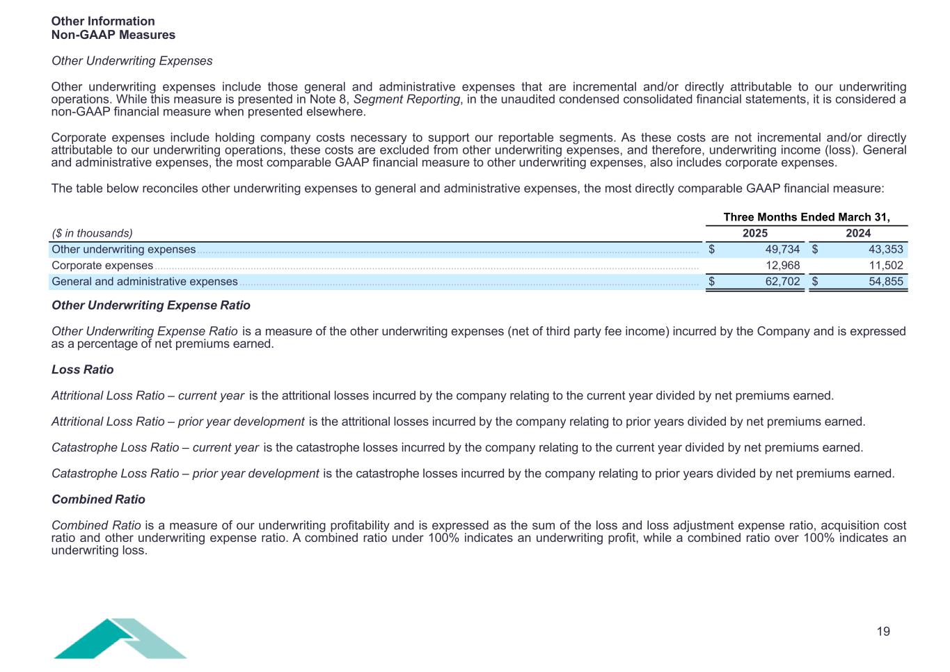 19 Three Months Ended March 31, ($ in thousands) 2025 2024 Other underwriting expenses .................................................................................................................................................................................. $ 49,734 $ 43,353 Corporate expenses ................................................................................................................................................................................................. 12,968 11,502 General and administrative expenses ................................................................................................................................................................... $ 62,702 $ 54,855 Other Information Non-GAAP Measures Other Underwriting Expenses Other underwriting expenses include those general and administrative expenses that are incremental and/or directly attributable to our underwriting operations. While this measure is presented in Note 8, Segment Reporting, in the unaudited condensed consolidated financial statements, it is considered a non-GAAP financial measure when presented elsewhere. Corporate expenses include holding company costs necessary to support our reportable segments. As these costs are not incremental and/or directly attributable to our underwriting operations, these costs are excluded from other underwriting expenses, and therefore, underwriting income (loss). General and administrative expenses, the most comparable GAAP financial measure to other underwriting expenses, also includes corporate expenses. The table below reconciles other underwriting expenses to general and administrative expenses, the most directly comparable GAAP financial measure: Other Underwriting Expense Ratio Other Underwriting Expense Ratio is a measure of the other underwriting expenses (net of third party fee income) incurred by the Company and is expressed as a percentage of net premiums earned. Loss Ratio Attritional Loss Ratio – current year is the attritional losses incurred by the company relating to the current year divided by net premiums earned. Attritional Loss Ratio – prior year development is the attritional losses incurred by the company relating to prior years divided by net premiums earned. Catastrophe Loss Ratio – current year is the catastrophe losses incurred by the company relating to the current year divided by net premiums earned. Catastrophe Loss Ratio – prior year development is the catastrophe losses incurred by the company relating to prior years divided by net premiums earned. Combined Ratio Combined Ratio is a measure of our underwriting profitability and is expressed as the sum of the loss and loss adjustment expense ratio, acquisition cost ratio and other underwriting expense ratio. A combined ratio under 100% indicates an underwriting profit, while a combined ratio over 100% indicates an underwriting loss.