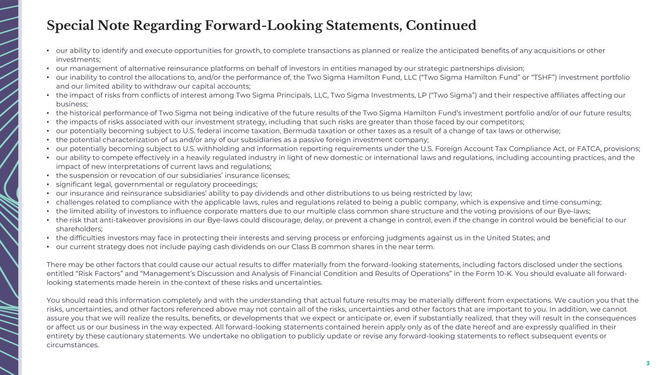 3 • our ability to identify and execute opportunities for growth, to complete transactions as planned or realize the anticipated benefits of any acquisitions or other investments; • our management of alternative reinsurance platforms on behalf of investors in entities managed by our strategic partnerships division; • our inability to control the allocations to, and/or the performance of, the Two Sigma Hamilton Fund, LLC (“Two Sigma Hamilton Fund” or “TSHF”) investment portfolio and our limited ability to withdraw our capital accounts; • the impact of risks from conflicts of interest among Two Sigma Principals, LLC, Two Sigma Investments, LP (“Two Sigma”) and their respective affiliates affecting our business; • the historical performance of Two Sigma not being indicative of the future results of the Two Sigma Hamilton Fund’s investment portfolio and/or of our future results; • the impacts of risks associated with our investment strategy, including that such risks are greater than those faced by our competitors; • our potentially becoming subject to U.S. federal income taxation, Bermuda taxation or other taxes as a result of a change of tax laws or otherwise; • the potential characterization of us and/or any of our subsidiaries as a passive foreign investment company; • our potentially becoming subject to U.S. withholding and information reporting requirements under the U.S. Foreign Account Tax Compliance Act, or FATCA, provisions; • our ability to compete effectively in a heavily regulated industry in light of new domestic or international laws and regulations, including accounting practices, and the impact of new interpretations of current laws and regulations; • the suspension or revocation of our subsidiaries’ insurance licenses; • significant legal, governmental or regulatory proceedings; • our insurance and reinsurance subsidiaries’ ability to pay dividends and other distributions to us being restricted by law; • challenges related to compliance with the applicable laws, rules and regulations related to being a public company, which is expensive and time consuming; • the limited ability of investors to influence corporate matters due to our multiple class common share structure and the voting provisions of our Bye-laws; • the risk that anti-takeover provisions in our Bye-laws could discourage, delay, or prevent a change in control, even if the change in control would be beneficial to our shareholders; • the difficulties investors may face in protecting their interests and serving process or enforcing judgments against us in the United States; and • our current strategy does not include paying cash dividends on our Class B common shares in the near term. There may be other factors that could cause our actual results to differ materially from the forward-looking statements, including factors disclosed under the sections entitled “Risk Factors” and “Management’s Discussion and Analysis of Financial Condition and Results of Operations” in the Form 10-K. You should evaluate all forward- looking statements made herein in the context of these risks and uncertainties. You should read this information completely and with the understanding that actual future results may be materially different from expectations. We caution you that the risks, uncertainties, and other factors referenced above may not contain all of the risks, uncertainties and other factors that are important to you. In addition, we cannot assure you that we will realize the results, benefits, or developments that we expect or anticipate or, even if substantially realized, that they will result in the consequences or affect us or our business in the way expected. All forward-looking statements contained herein apply only as of the date hereof and are expressly qualified in their entirety by these cautionary statements. We undertake no obligation to publicly update or revise any forward-looking statements to reflect subsequent events or circumstances. Special Note Regarding Forward-Looking Statements, Continued