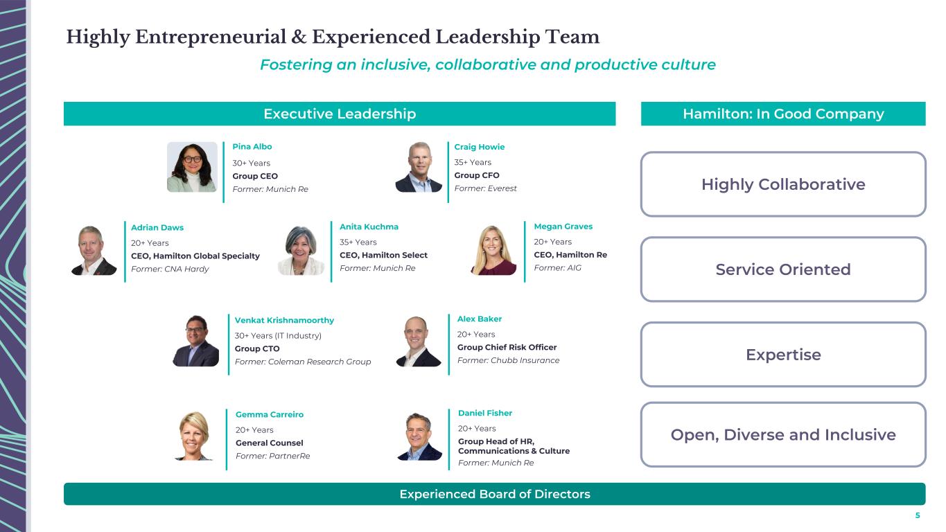 5 Highly Entrepreneurial & Experienced Leadership Team Gemma Carreiro 20+ Years General Counsel Former: PartnerRe Pina Albo 30+ Years Group CEO Former: Munich Re Megan Graves 20+ Years CEO, Hamilton Re Former: AIG Venkat Krishnamoorthy 30+ Years (IT Industry) Group CTO Former: Coleman Research Group Craig Howie 35+ Years Group CFO Former: Everest Anita Kuchma 35+ Years CEO, Hamilton Select Former: Munich Re Alex Baker 20+ Years Group Chief Risk Officer Former: Chubb Insurance Adrian Daws 20+ Years CEO, Hamilton Global Specialty Former: CNA Hardy Daniel Fisher 20+ Years Group Head of HR, Communications & Culture Former: Munich Re Executive Leadership Hamilton: In Good Company Fostering an inclusive, collaborative and productive culture Highly Collaborative Service Oriented Open, Diverse and Inclusive Expertise Experienced Board of Directors