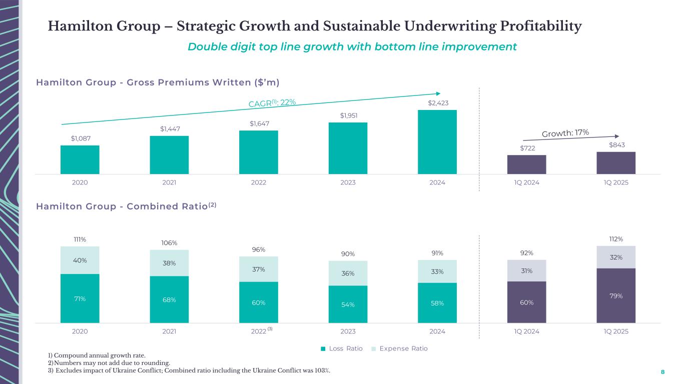7 Insurance 53% Reinsurance 47% Insurance / Reinsurance Casualty 45% Specialty 30% Property 25% Class of Business International 54% Bermuda 46% Business Segments 2024 Gross Premiums Written of $2.4 Billion Global Presence Bermuda Ireland United Kingdom United States Diversified and Well Scaled Underwriting Platforms Facilitate Cycle Management Diversified by Insurance / Reinsurance, Class of Business, and Segment / Geography