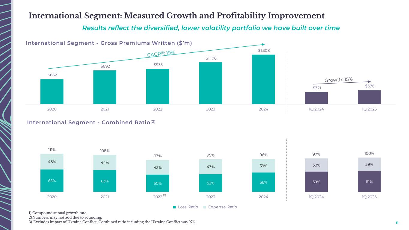 10 International Segment: Market Leading Writer of Specialty (Re)Insurance Business Specialty insurance products written in Lloyd’s, Hamilton Insurance DAC, HMGA Americas & Hamilton Select 15% 42% 43% Property Casualty Specialty 2024 GPW Business Mix 88% 12% Insurance Reinsurance $1.3B Hamilton Select $117m / 9% Hamilton Global Specialty ▪ Lloyd’s Syndicate 4000 and Hamilton Insurance DAC (Ireland) ▪ Ability to offer both Lloyd’s and company paper increases access to business ▪ Longstanding client & broker relationships fuel growth in core E&S markets ▪ $1.2 billion of gross premiums written in 2024 ▪ Limited legacy exposures prior to 2019 Hamilton Select ▪ U.S. domiciled carrier specializing in SME hard to place, E&S lines of business Highlights