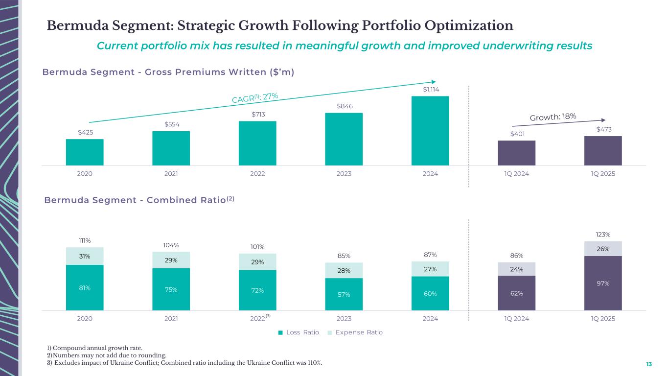 12 Bermuda Segment: Well Diversified Writer of Property, Casualty and Specialty Classes Underwriting-focused operation with strong foundation to capture growth opportunities 38% 47% 15% Property Casualty Specialty 12% 88% Insurance Reinsurance 2024 GPW Business Mix $1.1B Hamilton Re ▪ Established, scaled and scalable platform with broad, diversified client base ▪ Demonstrated underwriting profitability through portfolio optimization and thoughtful cycle management ▪ Strategic growth enhanced by diversified product offering: property, casualty and specialty ▪ Reinsurance business written both by Bermuda and US underwriting teams ▪ Clear, consistent appetite and responsive service rewarded by clients and brokers ▪ Data-driven approach supports underwriting and operational efficiencies Highlights