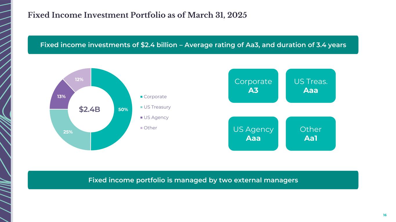 15 Two Sigma Hamilton FundFixed Income PortfolioA B Preservation of Capital 1 Liquidity 2 Diversification 3 Attractive Returns 4 Risk Management & Governance 5 ✓ Aa3 average credit quality 100% investment grade ✓ Highly liquid ✓ Market sector diversification ✓ 4.3% book yield 3/31/2025 ✓ Investment guidelines from Investment Committee ✓ Low correlation to equity markets; long- term positive returns ✓ Redeemable within 5 days ✓ 7 unique investment vehicles ✓ 12.9% annualized return since inception (2014) ✓ Hold lesser of $1.8B or 60% of Hamilton net tangible assets in TSHF; arms- length IMA with Two Sigma Investment Strategy Review - $5.0 Billion Investment Portfolio as of March 31, 2025 Fixed Income, Short-Term and Cash 60% / $3.0B Two Sigma Hamilton Fund 40% / $2.0B