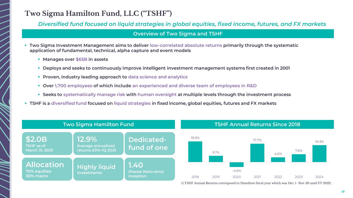 17 Overview of Two Sigma and TSHF Diversified fund focused on liquid strategies in global equities, fixed income, futures, and FX markets ▪ Two Sigma Investment Management aims to deliver low-correlated absolute returns primarily through the systematic application of fundamental, technical, alpha capture and event models ▪ Manages over $65B in assets ▪ Deploys and seeks to continuously improve intelligent investment management systems first created in 2001 ▪ Proven, industry leading approach to data science and analytics ▪ Over 1,700 employees of which include an experienced and diverse team of employees in R&D ▪ Seeks to systematically manage risk with human oversight at multiple levels through the investment process ▪ TSHF is a diversified fund focused on liquid strategies in fixed income, global equities, futures and FX markets Two Sigma Hamilton Fund $2.0B TSHF as of March 31, 2025 12.9% Average annualized returns 2014-1Q 2025 Dedicated- fund of one Allocation 70% equities 30% macro Highly liquid Investments TSHF Annual Returns Since 2018 Two Sigma Hamilton Fund, LLC (“TSHF”) 1.40 Sharpe Ratio since inception 19.9% 6.1% -4.6% 17.7% 4.6% 7.6% 16.3% 2018 2019 2020 2021 2022 2023 2024 1) TSHF Annual Returns correspond to Hamilton fiscal year which was Dec 1- Nov 30 until FY 2022.