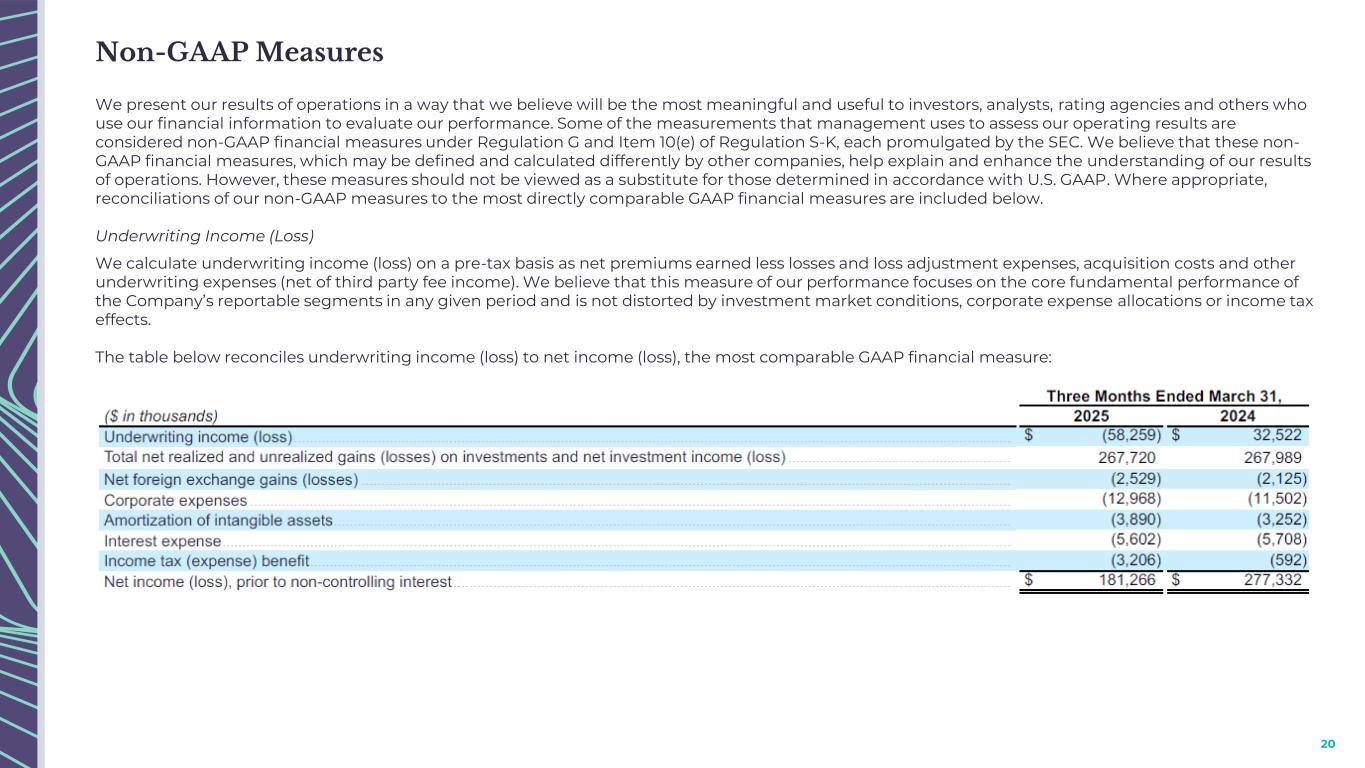 20 Non-GAAP Measures We present our results of operations in a way that we believe will be the most meaningful and useful to investors, analysts, rating agencies and others who use our financial information to evaluate our performance. Some of the measurements that management uses to assess our operating results are considered non-GAAP financial measures under Regulation G and Item 10(e) of Regulation S-K, each promulgated by the SEC. We believe that these non- GAAP financial measures, which may be defined and calculated differently by other companies, help explain and enhance the understanding of our results of operations. However, these measures should not be viewed as a substitute for those determined in accordance with U.S. GAAP. Where appropriate, reconciliations of our non-GAAP measures to the most directly comparable GAAP financial measures are included below. Underwriting Income (Loss) We calculate underwriting income (loss) on a pre-tax basis as net premiums earned less losses and loss adjustment expenses, acquisition costs and other underwriting expenses (net of third party fee income). We believe that this measure of our performance focuses on the core fundamental performance of the Company’s reportable segments in any given period and is not distorted by investment market conditions, corporate expense allocations or income tax effects. The table below reconciles underwriting income (loss) to net income (loss), the most comparable GAAP financial measure: