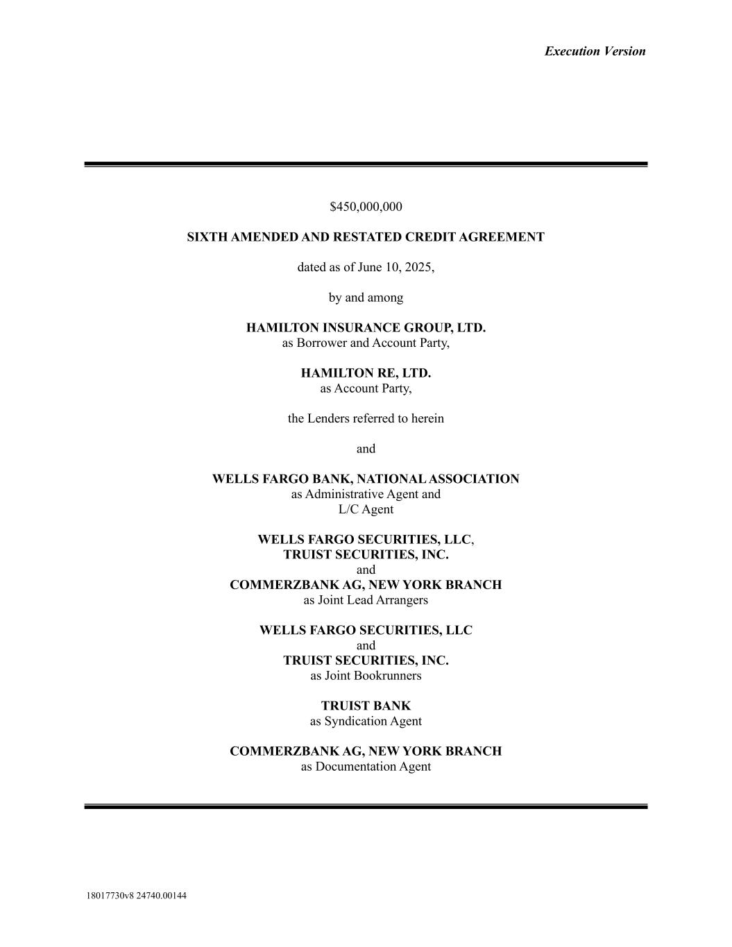 18017730v8 24740.00144 Execution Version $450,000,000 SIXTH AMENDED AND RESTATED CREDIT AGREEMENT dated as of June 10, 2025, by and among HAMILTON INSURANCE GROUP, LTD. as Borrower and Account Party, HAMILTON RE, LTD. as Account Party, the Lenders referred to herein and WELLS FARGO BANK, NATIONAL ASSOCIATION as Administrative Agent and L/C Agent WELLS FARGO SECURITIES, LLC, TRUIST SECURITIES, INC. and COMMERZBANK AG, NEW YORK BRANCH as Joint Lead Arrangers WELLS FARGO SECURITIES, LLC and TRUIST SECURITIES, INC. as Joint Bookrunners TRUIST BANK as Syndication Agent COMMERZBANK AG, NEW YORK BRANCH as Documentation Agent
