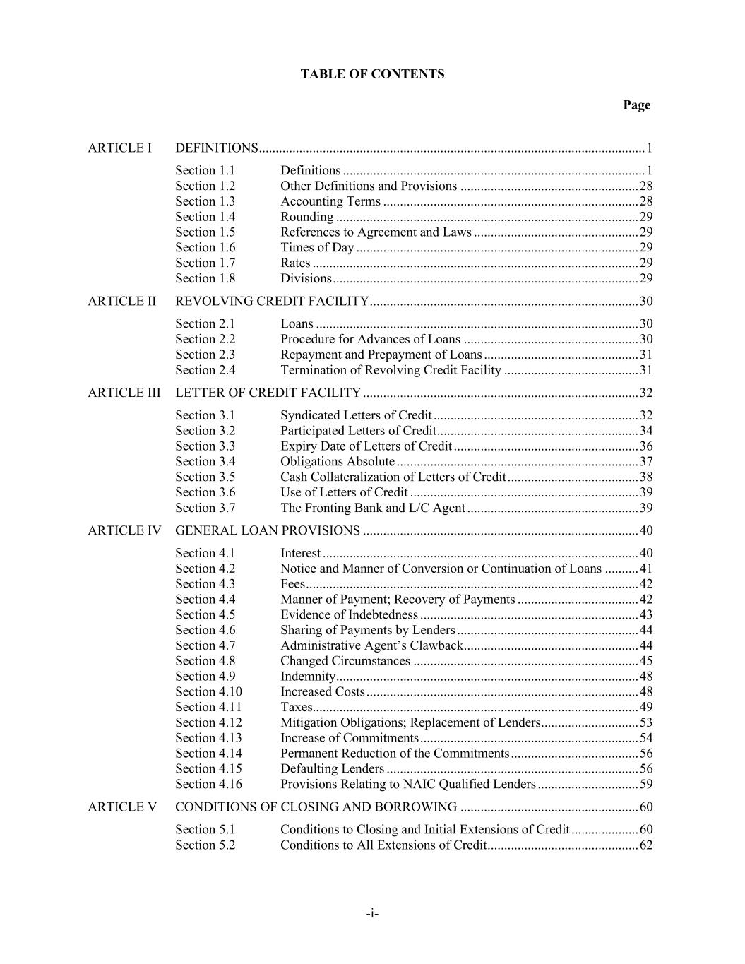 TABLE OF CONTENTS Page -i- ARTICLE I DEFINITIONS ................................................................................................................... 1 Section 1.1 Definitions .......................................................................................... 1 Section 1.2 Other Definitions and Provisions ..................................................... 28 Section 1.3 Accounting Terms ............................................................................ 28 Section 1.4 Rounding .......................................................................................... 29 Section 1.5 References to Agreement and Laws ................................................. 29 Section 1.6 Times of Day .................................................................................... 29 Section 1.7 Rates ................................................................................................. 29 Section 1.8 Divisions ........................................................................................... 29 ARTICLE II REVOLVING CREDIT FACILITY................................................................................ 30 Section 2.1 Loans ................................................................................................ 30 Section 2.2 Procedure for Advances of Loans .................................................... 30 Section 2.3 Repayment and Prepayment of Loans .............................................. 31 Section 2.4 Termination of Revolving Credit Facility ........................................ 31 ARTICLE III LETTER OF CREDIT FACILITY .................................................................................. 32 Section 3.1 Syndicated Letters of Credit ............................................................. 32 Section 3.2 Participated Letters of Credit ............................................................ 34 Section 3.3 Expiry Date of Letters of Credit ....................................................... 36 Section 3.4 Obligations Absolute ........................................................................ 37 Section 3.5 Cash Collateralization of Letters of Credit ....................................... 38 Section 3.6 Use of Letters of Credit .................................................................... 39 Section 3.7 The Fronting Bank and L/C Agent ................................................... 39 ARTICLE IV GENERAL LOAN PROVISIONS .................................................................................. 40 Section 4.1 Interest .............................................................................................. 40 Section 4.2 Notice and Manner of Conversion or Continuation of Loans .......... 41 Section 4.3 Fees ................................................................................................... 42 Section 4.4 Manner of Payment; Recovery of Payments .................................... 42 Section 4.5 Evidence of Indebtedness ................................................................. 43 Section 4.6 Sharing of Payments by Lenders ...................................................... 44 Section 4.7 Administrative Agent’s Clawback .................................................... 44 Section 4.8 Changed Circumstances ................................................................... 45 Section 4.9 Indemnity .......................................................................................... 48 Section 4.10 Increased Costs ................................................................................. 48 Section 4.11 Taxes................................................................................................. 49 Section 4.12 Mitigation Obligations; Replacement of Lenders ............................. 53 Section 4.13 Increase of Commitments ................................................................. 54 Section 4.14 Permanent Reduction of the Commitments ...................................... 56 Section 4.15 Defaulting Lenders ........................................................................... 56 Section 4.16 Provisions Relating to NAIC Qualified Lenders .............................. 59 ARTICLE V CONDITIONS OF CLOSING AND BORROWING ..................................................... 60 Section 5.1 Conditions to Closing and Initial Extensions of Credit .................... 60 Section 5.2 Conditions to All Extensions of Credit ............................................. 62