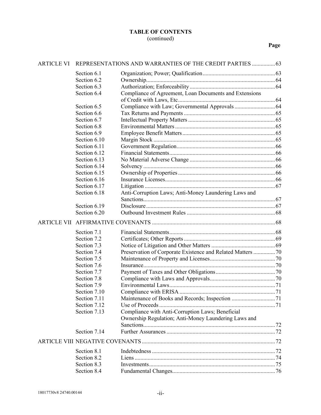 18017730v8 24740.00144 TABLE OF CONTENTS (continued) Page -ii- ARTICLE VI REPRESENTATIONS AND WARRANTIES OF THE CREDIT PARTIES ................ 63 Section 6.1 Organization; Power; Qualification .................................................. 63 Section 6.2 Ownership ......................................................................................... 64 Section 6.3 Authorization; Enforceability ........................................................... 64 Section 6.4 Compliance of Agreement, Loan Documents and Extensions of Credit with Laws, Etc ................................................................... 64 Section 6.5 Compliance with Law; Governmental Approvals ............................ 64 Section 6.6 Tax Returns and Payments ............................................................... 65 Section 6.7 Intellectual Property Matters ............................................................ 65 Section 6.8 Environmental Matters ..................................................................... 65 Section 6.9 Employee Benefit Matters ................................................................ 65 Section 6.10 Margin Stock .................................................................................... 65 Section 6.11 Government Regulation .................................................................... 66 Section 6.12 Financial Statements ......................................................................... 66 Section 6.13 No Material Adverse Change ........................................................... 66 Section 6.14 Solvency ........................................................................................... 66 Section 6.15 Ownership of Properties ................................................................... 66 Section 6.16 Insurance Licenses ............................................................................ 66 Section 6.17 Litigation .......................................................................................... 67 Section 6.18 Anti-Corruption Laws; Anti-Money Laundering Laws and Sanctions ........................................................................................... 67 Section 6.19 Disclosure ......................................................................................... 67 Section 6.20 Outbound Investment Rules ............................................................. 68 ARTICLE VII AFFIRMATIVE COVENANTS ..................................................................................... 68 Section 7.1 Financial Statements ......................................................................... 68 Section 7.2 Certificates; Other Reports ............................................................... 69 Section 7.3 Notice of Litigation and Other Matters ............................................ 69 Section 7.4 Preservation of Corporate Existence and Related Matters ............... 70 Section 7.5 Maintenance of Property and Licenses ............................................. 70 Section 7.6 Insurance ........................................................................................... 70 Section 7.7 Payment of Taxes and Other Obligations ......................................... 70 Section 7.8 Compliance with Laws and Approvals ............................................. 70 Section 7.9 Environmental Laws ......................................................................... 71 Section 7.10 Compliance with ERISA .................................................................. 71 Section 7.11 Maintenance of Books and Records; Inspection .............................. 71 Section 7.12 Use of Proceeds ................................................................................ 71 Section 7.13 Compliance with Anti-Corruption Laws; Beneficial Ownership Regulation; Anti-Money Laundering Laws and Sanctions ........................................................................................... 72 Section 7.14 Further Assurances ........................................................................... 72 ARTICLE VIII NEGATIVE COVENANTS ............................................................................................ 72 Section 8.1 Indebtedness ..................................................................................... 72 Section 8.2 Liens ................................................................................................. 74 Section 8.3 Investments ....................................................................................... 75 Section 8.4 Fundamental Changes....................................................................... 76