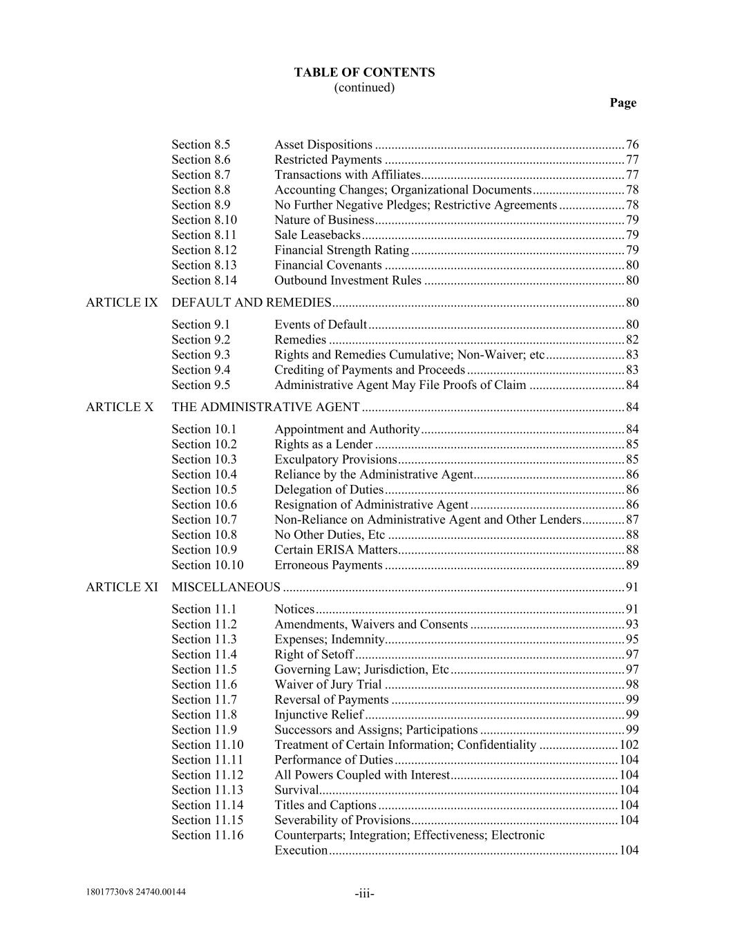 18017730v8 24740.00144 TABLE OF CONTENTS (continued) Page -iii- Section 8.5 Asset Dispositions ............................................................................ 76 Section 8.6 Restricted Payments ......................................................................... 77 Section 8.7 Transactions with Affiliates .............................................................. 77 Section 8.8 Accounting Changes; Organizational Documents ............................ 78 Section 8.9 No Further Negative Pledges; Restrictive Agreements .................... 78 Section 8.10 Nature of Business ............................................................................ 79 Section 8.11 Sale Leasebacks ................................................................................ 79 Section 8.12 Financial Strength Rating ................................................................. 79 Section 8.13 Financial Covenants ......................................................................... 80 Section 8.14 Outbound Investment Rules ............................................................. 80 ARTICLE IX DEFAULT AND REMEDIES ......................................................................................... 80 Section 9.1 Events of Default .............................................................................. 80 Section 9.2 Remedies .......................................................................................... 82 Section 9.3 Rights and Remedies Cumulative; Non-Waiver; etc ........................ 83 Section 9.4 Crediting of Payments and Proceeds ................................................ 83 Section 9.5 Administrative Agent May File Proofs of Claim ............................. 84 ARTICLE X THE ADMINISTRATIVE AGENT ................................................................................ 84 Section 10.1 Appointment and Authority .............................................................. 84 Section 10.2 Rights as a Lender ............................................................................ 85 Section 10.3 Exculpatory Provisions ..................................................................... 85 Section 10.4 Reliance by the Administrative Agent .............................................. 86 Section 10.5 Delegation of Duties ......................................................................... 86 Section 10.6 Resignation of Administrative Agent ............................................... 86 Section 10.7 Non-Reliance on Administrative Agent and Other Lenders ............. 87 Section 10.8 No Other Duties, Etc ........................................................................ 88 Section 10.9 Certain ERISA Matters ..................................................................... 88 Section 10.10 Erroneous Payments ......................................................................... 89 ARTICLE XI MISCELLANEOUS ........................................................................................................ 91 Section 11.1 Notices .............................................................................................. 91 Section 11.2 Amendments, Waivers and Consents ............................................... 93 Section 11.3 Expenses; Indemnity......................................................................... 95 Section 11.4 Right of Setoff .................................................................................. 97 Section 11.5 Governing Law; Jurisdiction, Etc ..................................................... 97 Section 11.6 Waiver of Jury Trial ......................................................................... 98 Section 11.7 Reversal of Payments ....................................................................... 99 Section 11.8 Injunctive Relief ............................................................................... 99 Section 11.9 Successors and Assigns; Participations ............................................ 99 Section 11.10 Treatment of Certain Information; Confidentiality ........................ 102 Section 11.11 Performance of Duties .................................................................... 104 Section 11.12 All Powers Coupled with Interest ................................................... 104 Section 11.13 Survival........................................................................................... 104 Section 11.14 Titles and Captions ......................................................................... 104 Section 11.15 Severability of Provisions ............................................................... 104 Section 11.16 Counterparts; Integration; Effectiveness; Electronic Execution ........................................................................................ 104