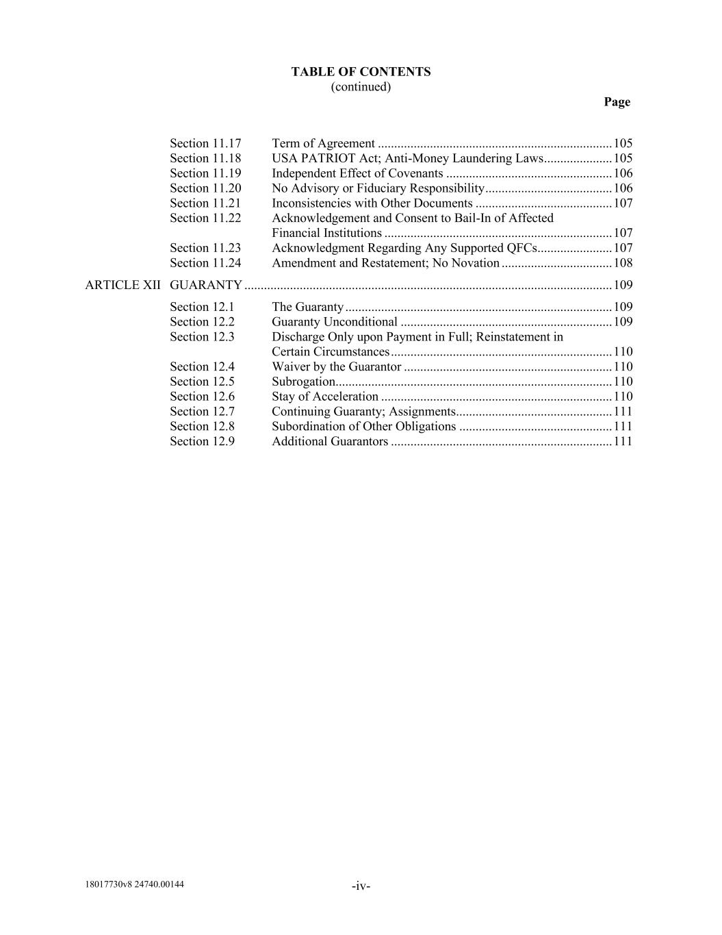18017730v8 24740.00144 TABLE OF CONTENTS (continued) Page -iv- Section 11.17 Term of Agreement ........................................................................ 105 Section 11.18 USA PATRIOT Act; Anti-Money Laundering Laws ..................... 105 Section 11.19 Independent Effect of Covenants ................................................... 106 Section 11.20 No Advisory or Fiduciary Responsibility ....................................... 106 Section 11.21 Inconsistencies with Other Documents .......................................... 107 Section 11.22 Acknowledgement and Consent to Bail-In of Affected Financial Institutions ...................................................................... 107 Section 11.23 Acknowledgment Regarding Any Supported QFCs ....................... 107 Section 11.24 Amendment and Restatement; No Novation .................................. 108 ARTICLE XII GUARANTY ................................................................................................................. 109 Section 12.1 The Guaranty .................................................................................. 109 Section 12.2 Guaranty Unconditional ................................................................. 109 Section 12.3 Discharge Only upon Payment in Full; Reinstatement in Certain Circumstances .................................................................... 110 Section 12.4 Waiver by the Guarantor ................................................................ 110 Section 12.5 Subrogation ..................................................................................... 110 Section 12.6 Stay of Acceleration ....................................................................... 110 Section 12.7 Continuing Guaranty; Assignments ................................................ 111 Section 12.8 Subordination of Other Obligations ............................................... 111 Section 12.9 Additional Guarantors .................................................................... 111