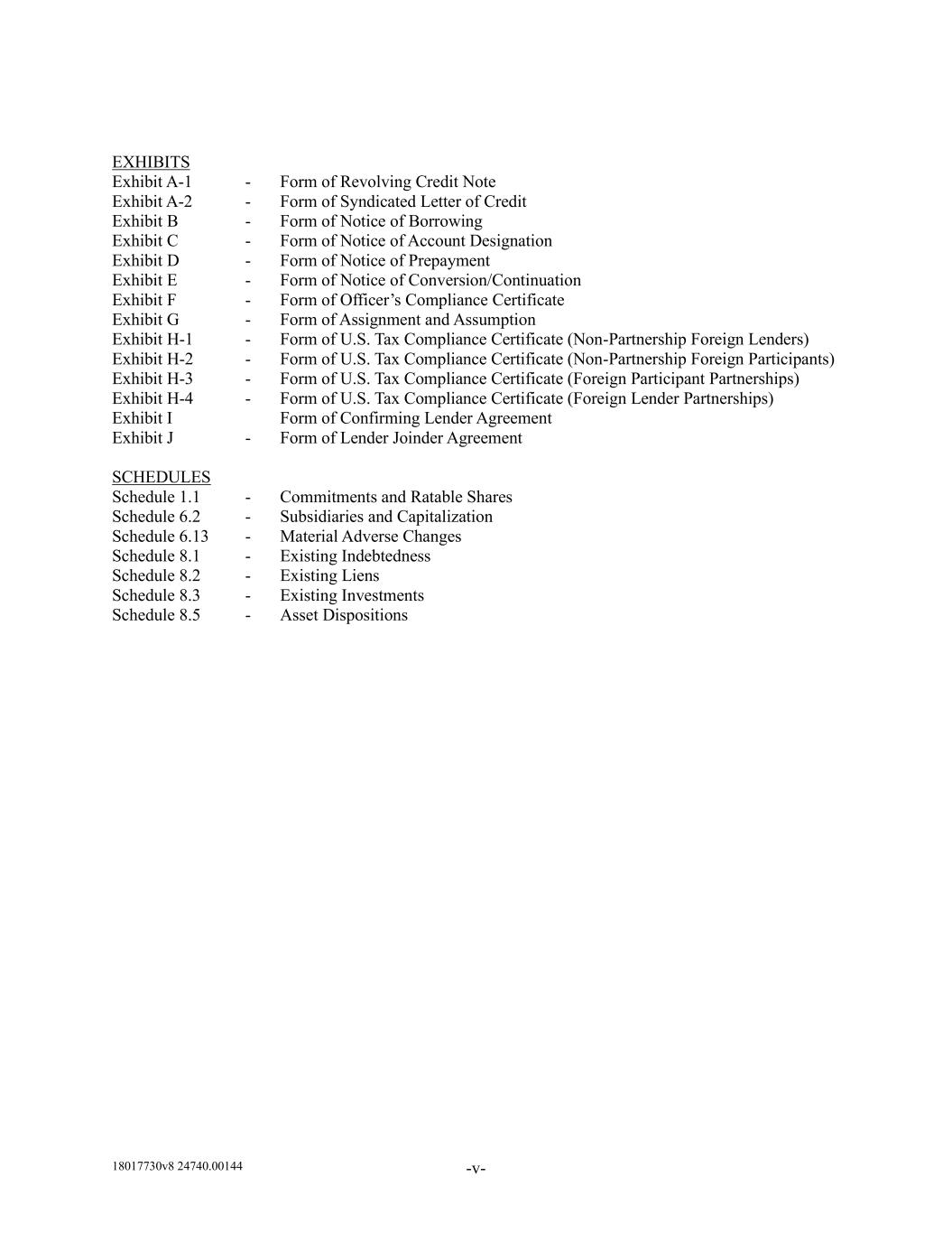 18017730v8 24740.00144 -v- EXHIBITS Exhibit A-1 - Form of Revolving Credit Note Exhibit A-2 - Form of Syndicated Letter of Credit Exhibit B - Form of Notice of Borrowing Exhibit C - Form of Notice of Account Designation Exhibit D - Form of Notice of Prepayment Exhibit E - Form of Notice of Conversion/Continuation Exhibit F - Form of Officer’s Compliance Certificate Exhibit G - Form of Assignment and Assumption Exhibit H-1 - Form of U.S. Tax Compliance Certificate (Non-Partnership Foreign Lenders) Exhibit H-2 - Form of U.S. Tax Compliance Certificate (Non-Partnership Foreign Participants) Exhibit H-3 - Form of U.S. Tax Compliance Certificate (Foreign Participant Partnerships) Exhibit H-4 - Form of U.S. Tax Compliance Certificate (Foreign Lender Partnerships) Exhibit I Form of Confirming Lender Agreement Exhibit J - Form of Lender Joinder Agreement SCHEDULES Schedule 1.1 - Commitments and Ratable Shares Schedule 6.2 - Subsidiaries and Capitalization Schedule 6.13 - Material Adverse Changes Schedule 8.1 - Existing Indebtedness Schedule 8.2 - Existing Liens Schedule 8.3 - Existing Investments Schedule 8.5 - Asset Dispositions
