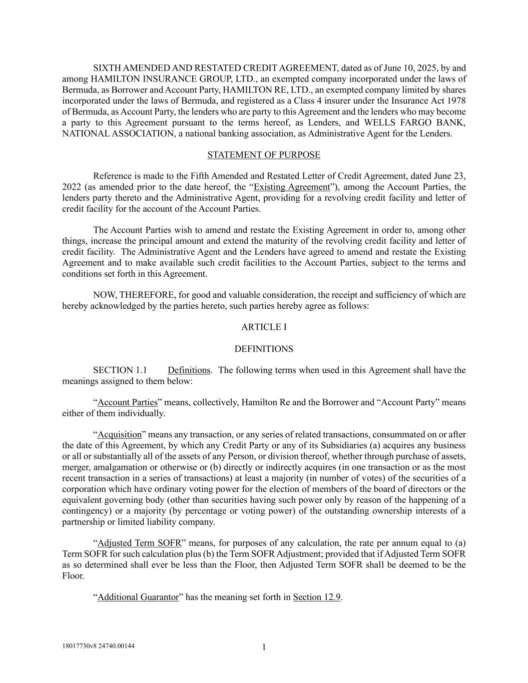 18017730v8 24740.00144 1 SIXTH AMENDED AND RESTATED CREDIT AGREEMENT, dated as of June 10, 2025, by and among HAMILTON INSURANCE GROUP, LTD., an exempted company incorporated under the laws of Bermuda, as Borrower and Account Party, HAMILTON RE, LTD., an exempted company limited by shares incorporated under the laws of Bermuda, and registered as a Class 4 insurer under the Insurance Act 1978 of Bermuda, as Account Party, the lenders who are party to this Agreement and the lenders who may become a party to this Agreement pursuant to the terms hereof, as Lenders, and WELLS FARGO BANK, NATIONAL ASSOCIATION, a national banking association, as Administrative Agent for the Lenders. STATEMENT OF PURPOSE Reference is made to the Fifth Amended and Restated Letter of Credit Agreement, dated June 23, 2022 (as amended prior to the date hereof, the “Existing Agreement”), among the Account Parties, the lenders party thereto and the Administrative Agent, providing for a revolving credit facility and letter of credit facility for the account of the Account Parties. The Account Parties wish to amend and restate the Existing Agreement in order to, among other things, increase the principal amount and extend the maturity of the revolving credit facility and letter of credit facility. The Administrative Agent and the Lenders have agreed to amend and restate the Existing Agreement and to make available such credit facilities to the Account Parties, subject to the terms and conditions set forth in this Agreement. NOW, THEREFORE, for good and valuable consideration, the receipt and sufficiency of which are hereby acknowledged by the parties hereto, such parties hereby agree as follows: ARTICLE I DEFINITIONS SECTION 1.1 Definitions. The following terms when used in this Agreement shall have the meanings assigned to them below: “Account Parties” means, collectively, Hamilton Re and the Borrower and “Account Party” means either of them individually. “Acquisition” means any transaction, or any series of related transactions, consummated on or after the date of this Agreement, by which any Credit Party or any of its Subsidiaries (a) acquires any business or all or substantially all of the assets of any Person, or division thereof, whether through purchase of assets, merger, amalgamation or otherwise or (b) directly or indirectly acquires (in one transaction or as the most recent transaction in a series of transactions) at least a majority (in number of votes) of the securities of a corporation which have ordinary voting power for the election of members of the board of directors or the equivalent governing body (other than securities having such power only by reason of the happening of a contingency) or a majority (by percentage or voting power) of the outstanding ownership interests of a partnership or limited liability company. “Adjusted Term SOFR” means, for purposes of any calculation, the rate per annum equal to (a) Term SOFR for such calculation plus (b) the Term SOFR Adjustment; provided that if Adjusted Term SOFR as so determined shall ever be less than the Floor, then Adjusted Term SOFR shall be deemed to be the Floor. “Additional Guarantor” has the meaning set forth in Section 12.9.