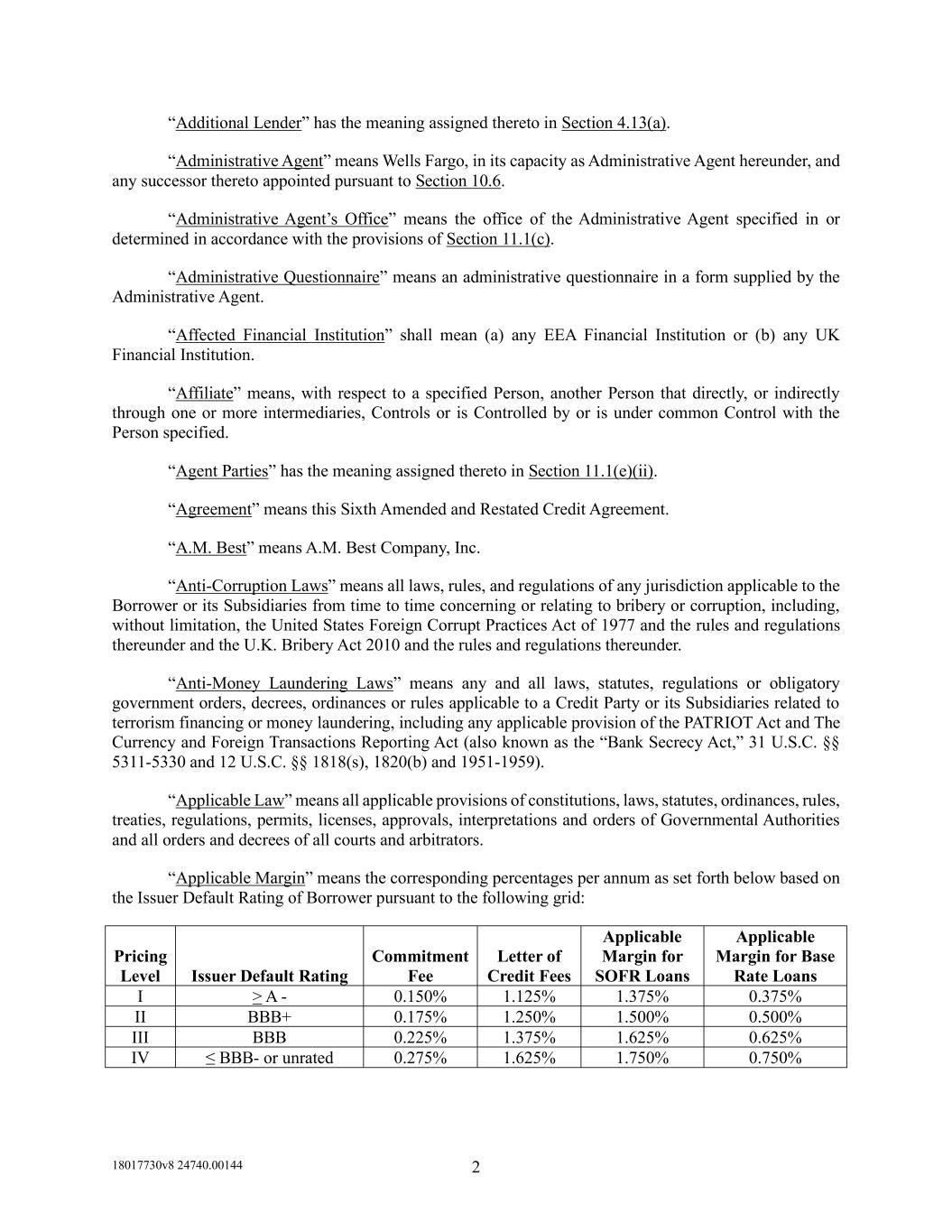 18017730v8 24740.00144 2 “Additional Lender” has the meaning assigned thereto in Section 4.13(a). “Administrative Agent” means Wells Fargo, in its capacity as Administrative Agent hereunder, and any successor thereto appointed pursuant to Section 10.6. “Administrative Agent’s Office” means the office of the Administrative Agent specified in or determined in accordance with the provisions of Section 11.1(c). “Administrative Questionnaire” means an administrative questionnaire in a form supplied by the Administrative Agent. “Affected Financial Institution” shall mean (a) any EEA Financial Institution or (b) any UK Financial Institution. “Affiliate” means, with respect to a specified Person, another Person that directly, or indirectly through one or more intermediaries, Controls or is Controlled by or is under common Control with the Person specified. “Agent Parties” has the meaning assigned thereto in Section 11.1(e)(ii). “Agreement” means this Sixth Amended and Restated Credit Agreement. “A.M. Best” means A.M. Best Company, Inc. “Anti-Corruption Laws” means all laws, rules, and regulations of any jurisdiction applicable to the Borrower or its Subsidiaries from time to time concerning or relating to bribery or corruption, including, without limitation, the United States Foreign Corrupt Practices Act of 1977 and the rules and regulations thereunder and the U.K. Bribery Act 2010 and the rules and regulations thereunder. “Anti-Money Laundering Laws” means any and all laws, statutes, regulations or obligatory government orders, decrees, ordinances or rules applicable to a Credit Party or its Subsidiaries related to terrorism financing or money laundering, including any applicable provision of the PATRIOT Act and The Currency and Foreign Transactions Reporting Act (also known as the “Bank Secrecy Act,” 31 U.S.C. §§ 5311-5330 and 12 U.S.C. §§ 1818(s), 1820(b) and 1951-1959). “Applicable Law” means all applicable provisions of constitutions, laws, statutes, ordinances, rules, treaties, regulations, permits, licenses, approvals, interpretations and orders of Governmental Authorities and all orders and decrees of all courts and arbitrators. “Applicable Margin” means the corresponding percentages per annum as set forth below based on the Issuer Default Rating of Borrower pursuant to the following grid: Pricing Level Issuer Default Rating Commitment Fee Letter of Credit Fees Applicable Margin for SOFR Loans Applicable Margin for Base Rate Loans I > A - 0.150% 1.125% 1.375% 0.375% II BBB+ 0.175% 1.250% 1.500% 0.500% III BBB 0.225% 1.375% 1.625% 0.625% IV ≤ BBB- or unrated 0.275% 1.625% 1.750% 0.750%