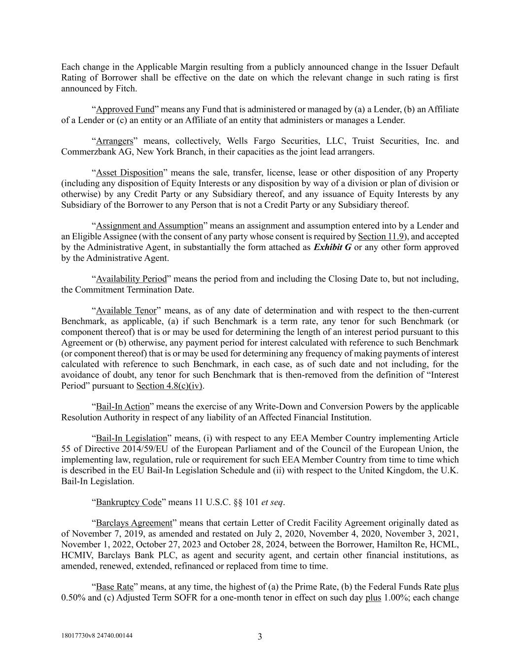 18017730v8 24740.00144 3 Each change in the Applicable Margin resulting from a publicly announced change in the Issuer Default Rating of Borrower shall be effective on the date on which the relevant change in such rating is first announced by Fitch. “Approved Fund” means any Fund that is administered or managed by (a) a Lender, (b) an Affiliate of a Lender or (c) an entity or an Affiliate of an entity that administers or manages a Lender. “Arrangers” means, collectively, Wells Fargo Securities, LLC, Truist Securities, Inc. and Commerzbank AG, New York Branch, in their capacities as the joint lead arrangers. “Asset Disposition” means the sale, transfer, license, lease or other disposition of any Property (including any disposition of Equity Interests or any disposition by way of a division or plan of division or otherwise) by any Credit Party or any Subsidiary thereof, and any issuance of Equity Interests by any Subsidiary of the Borrower to any Person that is not a Credit Party or any Subsidiary thereof. “Assignment and Assumption” means an assignment and assumption entered into by a Lender and an Eligible Assignee (with the consent of any party whose consent is required by Section 11.9), and accepted by the Administrative Agent, in substantially the form attached as Exhibit G or any other form approved by the Administrative Agent. “Availability Period” means the period from and including the Closing Date to, but not including, the Commitment Termination Date. “Available Tenor” means, as of any date of determination and with respect to the then-current Benchmark, as applicable, (a) if such Benchmark is a term rate, any tenor for such Benchmark (or component thereof) that is or may be used for determining the length of an interest period pursuant to this Agreement or (b) otherwise, any payment period for interest calculated with reference to such Benchmark (or component thereof) that is or may be used for determining any frequency of making payments of interest calculated with reference to such Benchmark, in each case, as of such date and not including, for the avoidance of doubt, any tenor for such Benchmark that is then-removed from the definition of “Interest Period” pursuant to Section 4.8(c)(iv). “Bail-In Action” means the exercise of any Write-Down and Conversion Powers by the applicable Resolution Authority in respect of any liability of an Affected Financial Institution. “Bail-In Legislation” means, (i) with respect to any EEA Member Country implementing Article 55 of Directive 2014/59/EU of the European Parliament and of the Council of the European Union, the implementing law, regulation, rule or requirement for such EEA Member Country from time to time which is described in the EU Bail-In Legislation Schedule and (ii) with respect to the United Kingdom, the U.K. Bail-In Legislation. “Bankruptcy Code” means 11 U.S.C. §§ 101 et seq. “Barclays Agreement” means that certain Letter of Credit Facility Agreement originally dated as of November 7, 2019, as amended and restated on July 2, 2020, November 4, 2020, November 3, 2021, November 1, 2022, October 27, 2023 and October 28, 2024, between the Borrower, Hamilton Re, HCML, HCMIV, Barclays Bank PLC, as agent and security agent, and certain other financial institutions, as amended, renewed, extended, refinanced or replaced from time to time. “Base Rate” means, at any time, the highest of (a) the Prime Rate, (b) the Federal Funds Rate plus 0.50% and (c) Adjusted Term SOFR for a one-month tenor in effect on such day plus 1.00%; each change