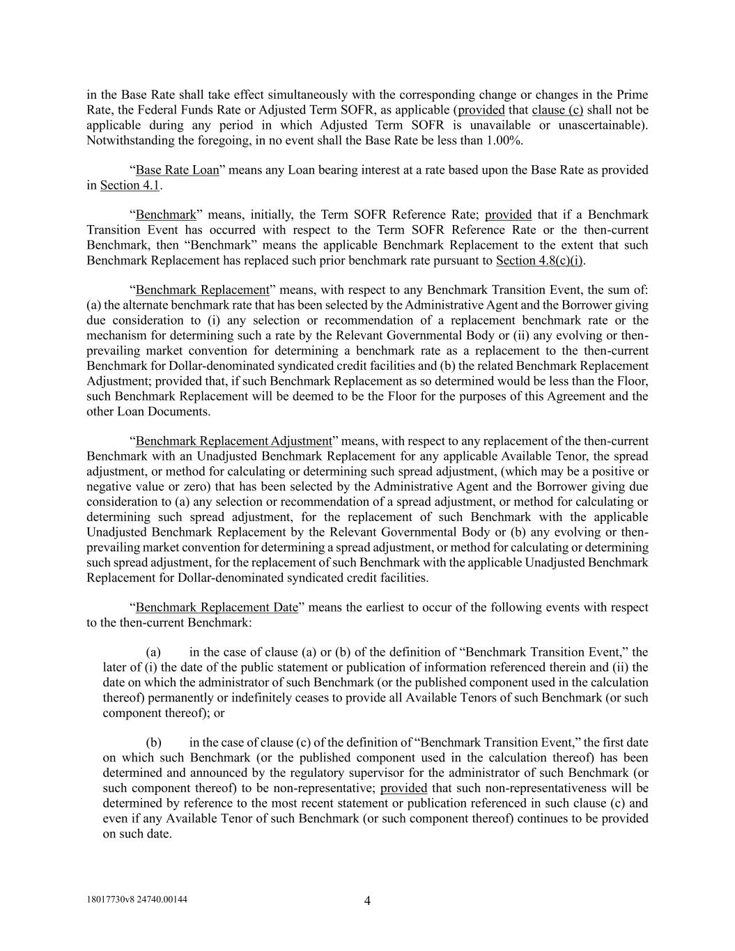 18017730v8 24740.00144 4 in the Base Rate shall take effect simultaneously with the corresponding change or changes in the Prime Rate, the Federal Funds Rate or Adjusted Term SOFR, as applicable (provided that clause (c) shall not be applicable during any period in which Adjusted Term SOFR is unavailable or unascertainable). Notwithstanding the foregoing, in no event shall the Base Rate be less than 1.00%. “Base Rate Loan” means any Loan bearing interest at a rate based upon the Base Rate as provided in Section 4.1. “Benchmark” means, initially, the Term SOFR Reference Rate; provided that if a Benchmark Transition Event has occurred with respect to the Term SOFR Reference Rate or the then-current Benchmark, then “Benchmark” means the applicable Benchmark Replacement to the extent that such Benchmark Replacement has replaced such prior benchmark rate pursuant to Section 4.8(c)(i). “Benchmark Replacement” means, with respect to any Benchmark Transition Event, the sum of: (a) the alternate benchmark rate that has been selected by the Administrative Agent and the Borrower giving due consideration to (i) any selection or recommendation of a replacement benchmark rate or the mechanism for determining such a rate by the Relevant Governmental Body or (ii) any evolving or then- prevailing market convention for determining a benchmark rate as a replacement to the then-current Benchmark for Dollar-denominated syndicated credit facilities and (b) the related Benchmark Replacement Adjustment; provided that, if such Benchmark Replacement as so determined would be less than the Floor, such Benchmark Replacement will be deemed to be the Floor for the purposes of this Agreement and the other Loan Documents. “Benchmark Replacement Adjustment” means, with respect to any replacement of the then-current Benchmark with an Unadjusted Benchmark Replacement for any applicable Available Tenor, the spread adjustment, or method for calculating or determining such spread adjustment, (which may be a positive or negative value or zero) that has been selected by the Administrative Agent and the Borrower giving due consideration to (a) any selection or recommendation of a spread adjustment, or method for calculating or determining such spread adjustment, for the replacement of such Benchmark with the applicable Unadjusted Benchmark Replacement by the Relevant Governmental Body or (b) any evolving or then- prevailing market convention for determining a spread adjustment, or method for calculating or determining such spread adjustment, for the replacement of such Benchmark with the applicable Unadjusted Benchmark Replacement for Dollar-denominated syndicated credit facilities. “Benchmark Replacement Date” means the earliest to occur of the following events with respect to the then-current Benchmark: (a) in the case of clause (a) or (b) of the definition of “Benchmark Transition Event,” the later of (i) the date of the public statement or publication of information referenced therein and (ii) the date on which the administrator of such Benchmark (or the published component used in the calculation thereof) permanently or indefinitely ceases to provide all Available Tenors of such Benchmark (or such component thereof); or (b) in the case of clause (c) of the definition of “Benchmark Transition Event,” the first date on which such Benchmark (or the published component used in the calculation thereof) has been determined and announced by the regulatory supervisor for the administrator of such Benchmark (or such component thereof) to be non-representative; provided that such non-representativeness will be determined by reference to the most recent statement or publication referenced in such clause (c) and even if any Available Tenor of such Benchmark (or such component thereof) continues to be provided on such date.