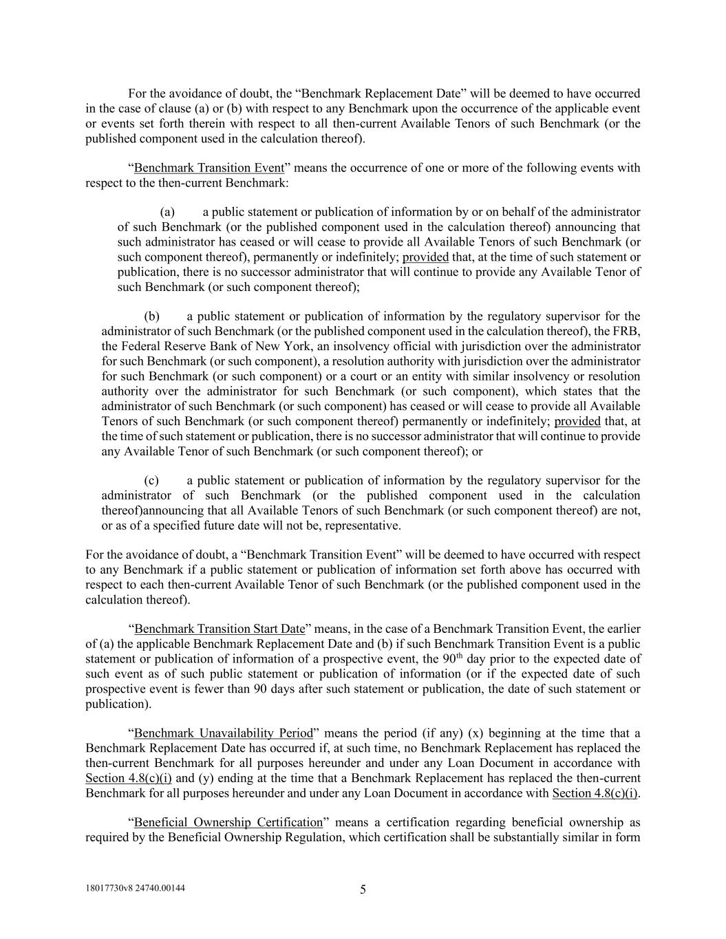 18017730v8 24740.00144 5 For the avoidance of doubt, the “Benchmark Replacement Date” will be deemed to have occurred in the case of clause (a) or (b) with respect to any Benchmark upon the occurrence of the applicable event or events set forth therein with respect to all then-current Available Tenors of such Benchmark (or the published component used in the calculation thereof). “Benchmark Transition Event” means the occurrence of one or more of the following events with respect to the then-current Benchmark: (a) a public statement or publication of information by or on behalf of the administrator of such Benchmark (or the published component used in the calculation thereof) announcing that such administrator has ceased or will cease to provide all Available Tenors of such Benchmark (or such component thereof), permanently or indefinitely; provided that, at the time of such statement or publication, there is no successor administrator that will continue to provide any Available Tenor of such Benchmark (or such component thereof); (b) a public statement or publication of information by the regulatory supervisor for the administrator of such Benchmark (or the published component used in the calculation thereof), the FRB, the Federal Reserve Bank of New York, an insolvency official with jurisdiction over the administrator for such Benchmark (or such component), a resolution authority with jurisdiction over the administrator for such Benchmark (or such component) or a court or an entity with similar insolvency or resolution authority over the administrator for such Benchmark (or such component), which states that the administrator of such Benchmark (or such component) has ceased or will cease to provide all Available Tenors of such Benchmark (or such component thereof) permanently or indefinitely; provided that, at the time of such statement or publication, there is no successor administrator that will continue to provide any Available Tenor of such Benchmark (or such component thereof); or (c) a public statement or publication of information by the regulatory supervisor for the administrator of such Benchmark (or the published component used in the calculation thereof)announcing that all Available Tenors of such Benchmark (or such component thereof) are not, or as of a specified future date will not be, representative. For the avoidance of doubt, a “Benchmark Transition Event” will be deemed to have occurred with respect to any Benchmark if a public statement or publication of information set forth above has occurred with respect to each then-current Available Tenor of such Benchmark (or the published component used in the calculation thereof). “Benchmark Transition Start Date” means, in the case of a Benchmark Transition Event, the earlier of (a) the applicable Benchmark Replacement Date and (b) if such Benchmark Transition Event is a public statement or publication of information of a prospective event, the 90th day prior to the expected date of such event as of such public statement or publication of information (or if the expected date of such prospective event is fewer than 90 days after such statement or publication, the date of such statement or publication). “Benchmark Unavailability Period” means the period (if any) (x) beginning at the time that a Benchmark Replacement Date has occurred if, at such time, no Benchmark Replacement has replaced the then-current Benchmark for all purposes hereunder and under any Loan Document in accordance with Section 4.8(c)(i) and (y) ending at the time that a Benchmark Replacement has replaced the then-current Benchmark for all purposes hereunder and under any Loan Document in accordance with Section 4.8(c)(i). “Beneficial Ownership Certification” means a certification regarding beneficial ownership as required by the Beneficial Ownership Regulation, which certification shall be substantially similar in form