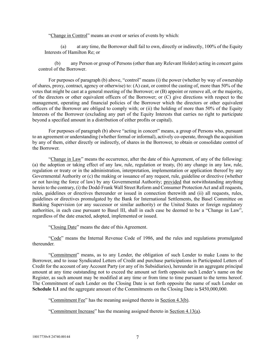 18017730v8 24740.00144 7 “Change in Control” means an event or series of events by which: (a) at any time, the Borrower shall fail to own, directly or indirectly, 100% of the Equity Interests of Hamilton Re; or (b) any Person or group of Persons (other than any Relevant Holder) acting in concert gains control of the Borrower. For purposes of paragraph (b) above, “control” means (i) the power (whether by way of ownership of shares, proxy, contract, agency or otherwise) to: (A) cast, or control the casting of, more than 50% of the votes that might be cast at a general meeting of the Borrower; or (B) appoint or remove all, or the majority, of the directors or other equivalent officers of the Borrower; or (C) give directions with respect to the management, operating and financial policies of the Borrower which the directors or other equivalent officers of the Borrower are obliged to comply with; or (ii) the holding of more than 50% of the Equity Interests of the Borrower (excluding any part of the Equity Interests that carries no right to participate beyond a specified amount in a distribution of either profits or capital). For purposes of paragraph (b) above “acting in concert” means, a group of Persons who, pursuant to an agreement or understanding (whether formal or informal), actively co-operate, through the acquisition by any of them, either directly or indirectly, of shares in the Borrower, to obtain or consolidate control of the Borrower. “Change in Law” means the occurrence, after the date of this Agreement, of any of the following: (a) the adoption or taking effect of any law, rule, regulation or treaty, (b) any change in any law, rule, regulation or treaty or in the administration, interpretation, implementation or application thereof by any Governmental Authority or (c) the making or issuance of any request, rule, guideline or directive (whether or not having the force of law) by any Governmental Authority; provided that notwithstanding anything herein to the contrary, (i) the Dodd-Frank Wall Street Reform and Consumer Protection Act and all requests, rules, guidelines or directives thereunder or issued in connection therewith and (ii) all requests, rules, guidelines or directives promulgated by the Bank for International Settlements, the Basel Committee on Banking Supervision (or any successor or similar authority) or the United States or foreign regulatory authorities, in each case pursuant to Basel III, shall in each case be deemed to be a “Change in Law”, regardless of the date enacted, adopted, implemented or issued. “Closing Date” means the date of this Agreement. “Code” means the Internal Revenue Code of 1986, and the rules and regulations promulgated thereunder. “Commitment” means, as to any Lender, the obligation of such Lender to make Loans to the Borrower, and to issue Syndicated Letters of Credit and purchase participations in Participated Letters of Credit for the account of any Account Party (or any of its Subsidiaries), hereunder in an aggregate principal amount at any time outstanding not to exceed the amount set forth opposite such Lender’s name on the Register, as such amount may be modified at any time or from time to time pursuant to the terms hereof. The Commitment of each Lender on the Closing Date is set forth opposite the name of such Lender on Schedule 1.1 and the aggregate amount of the Commitments on the Closing Date is $450,000,000. “Commitment Fee” has the meaning assigned thereto in Section 4.3(b). “Commitment Increase” has the meaning assigned thereto in Section 4.13(a).
