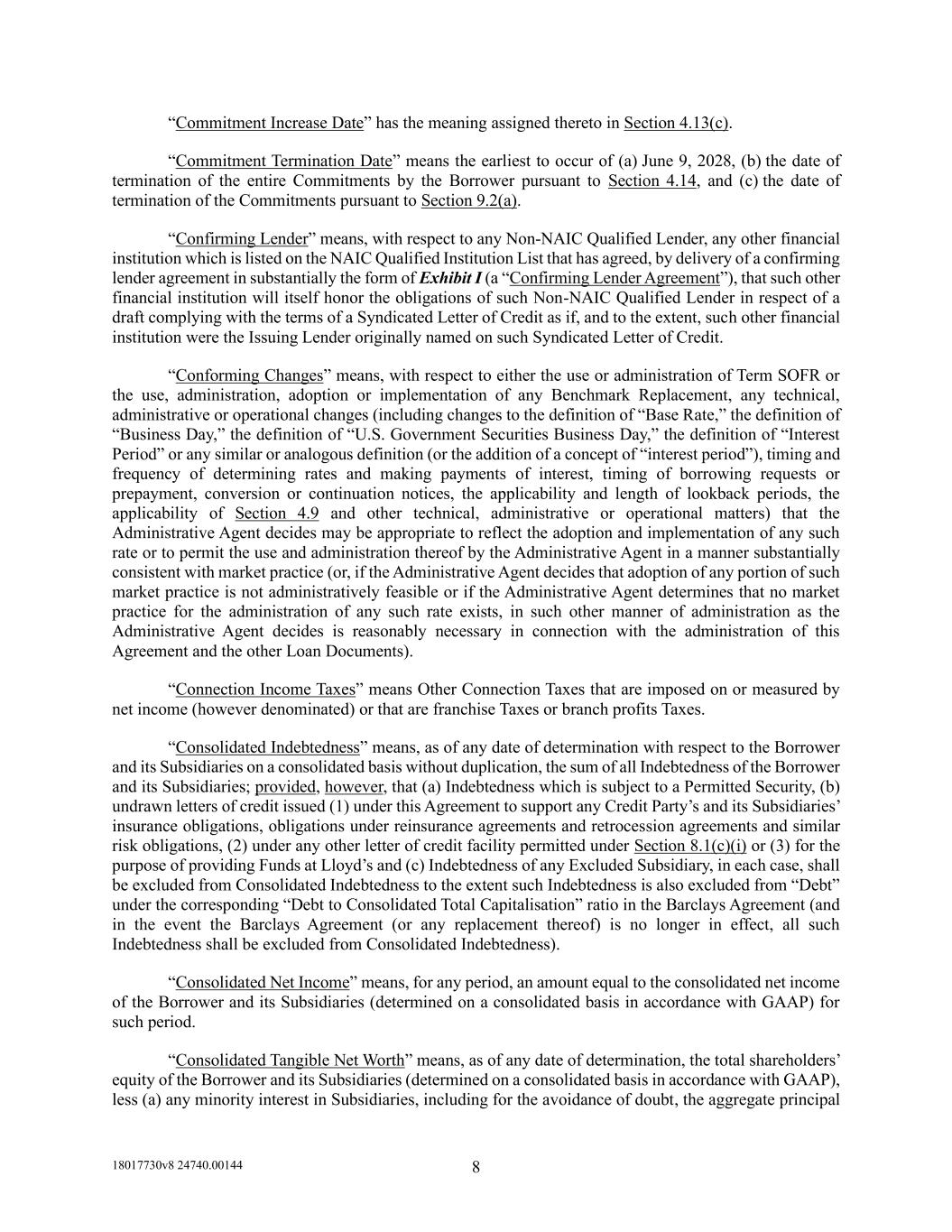 18017730v8 24740.00144 8 “Commitment Increase Date” has the meaning assigned thereto in Section 4.13(c). “Commitment Termination Date” means the earliest to occur of (a) June 9, 2028, (b) the date of termination of the entire Commitments by the Borrower pursuant to Section 4.14, and (c) the date of termination of the Commitments pursuant to Section 9.2(a). “Confirming Lender” means, with respect to any Non-NAIC Qualified Lender, any other financial institution which is listed on the NAIC Qualified Institution List that has agreed, by delivery of a confirming lender agreement in substantially the form of Exhibit I (a “Confirming Lender Agreement”), that such other financial institution will itself honor the obligations of such Non-NAIC Qualified Lender in respect of a draft complying with the terms of a Syndicated Letter of Credit as if, and to the extent, such other financial institution were the Issuing Lender originally named on such Syndicated Letter of Credit. “Conforming Changes” means, with respect to either the use or administration of Term SOFR or the use, administration, adoption or implementation of any Benchmark Replacement, any technical, administrative or operational changes (including changes to the definition of “Base Rate,” the definition of “Business Day,” the definition of “U.S. Government Securities Business Day,” the definition of “Interest Period” or any similar or analogous definition (or the addition of a concept of “interest period”), timing and frequency of determining rates and making payments of interest, timing of borrowing requests or prepayment, conversion or continuation notices, the applicability and length of lookback periods, the applicability of Section 4.9 and other technical, administrative or operational matters) that the Administrative Agent decides may be appropriate to reflect the adoption and implementation of any such rate or to permit the use and administration thereof by the Administrative Agent in a manner substantially consistent with market practice (or, if the Administrative Agent decides that adoption of any portion of such market practice is not administratively feasible or if the Administrative Agent determines that no market practice for the administration of any such rate exists, in such other manner of administration as the Administrative Agent decides is reasonably necessary in connection with the administration of this Agreement and the other Loan Documents). “Connection Income Taxes” means Other Connection Taxes that are imposed on or measured by net income (however denominated) or that are franchise Taxes or branch profits Taxes. “Consolidated Indebtedness” means, as of any date of determination with respect to the Borrower and its Subsidiaries on a consolidated basis without duplication, the sum of all Indebtedness of the Borrower and its Subsidiaries; provided, however, that (a) Indebtedness which is subject to a Permitted Security, (b) undrawn letters of credit issued (1) under this Agreement to support any Credit Party’s and its Subsidiaries’ insurance obligations, obligations under reinsurance agreements and retrocession agreements and similar risk obligations, (2) under any other letter of credit facility permitted under Section 8.1(c)(i) or (3) for the purpose of providing Funds at Lloyd’s and (c) Indebtedness of any Excluded Subsidiary, in each case, shall be excluded from Consolidated Indebtedness to the extent such Indebtedness is also excluded from “Debt” under the corresponding “Debt to Consolidated Total Capitalisation” ratio in the Barclays Agreement (and in the event the Barclays Agreement (or any replacement thereof) is no longer in effect, all such Indebtedness shall be excluded from Consolidated Indebtedness). “Consolidated Net Income” means, for any period, an amount equal to the consolidated net income of the Borrower and its Subsidiaries (determined on a consolidated basis in accordance with GAAP) for such period. “Consolidated Tangible Net Worth” means, as of any date of determination, the total shareholders’ equity of the Borrower and its Subsidiaries (determined on a consolidated basis in accordance with GAAP), less (a) any minority interest in Subsidiaries, including for the avoidance of doubt, the aggregate principal