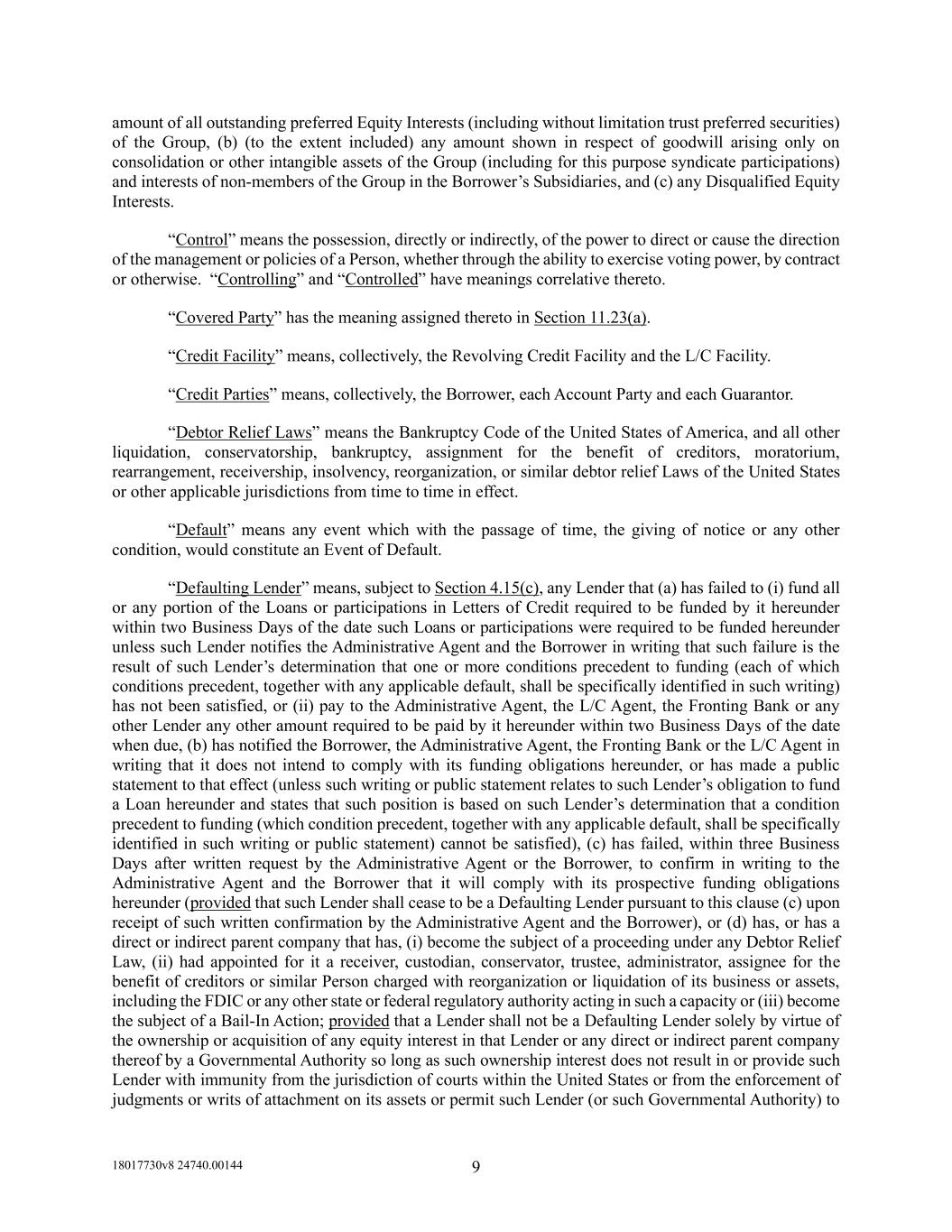 18017730v8 24740.00144 9 amount of all outstanding preferred Equity Interests (including without limitation trust preferred securities) of the Group, (b) (to the extent included) any amount shown in respect of goodwill arising only on consolidation or other intangible assets of the Group (including for this purpose syndicate participations) and interests of non-members of the Group in the Borrower’s Subsidiaries, and (c) any Disqualified Equity Interests. “Control” means the possession, directly or indirectly, of the power to direct or cause the direction of the management or policies of a Person, whether through the ability to exercise voting power, by contract or otherwise. “Controlling” and “Controlled” have meanings correlative thereto. “Covered Party” has the meaning assigned thereto in Section 11.23(a). “Credit Facility” means, collectively, the Revolving Credit Facility and the L/C Facility. “Credit Parties” means, collectively, the Borrower, each Account Party and each Guarantor. “Debtor Relief Laws” means the Bankruptcy Code of the United States of America, and all other liquidation, conservatorship, bankruptcy, assignment for the benefit of creditors, moratorium, rearrangement, receivership, insolvency, reorganization, or similar debtor relief Laws of the United States or other applicable jurisdictions from time to time in effect. “Default” means any event which with the passage of time, the giving of notice or any other condition, would constitute an Event of Default. “Defaulting Lender” means, subject to Section 4.15(c), any Lender that (a) has failed to (i) fund all or any portion of the Loans or participations in Letters of Credit required to be funded by it hereunder within two Business Days of the date such Loans or participations were required to be funded hereunder unless such Lender notifies the Administrative Agent and the Borrower in writing that such failure is the result of such Lender’s determination that one or more conditions precedent to funding (each of which conditions precedent, together with any applicable default, shall be specifically identified in such writing) has not been satisfied, or (ii) pay to the Administrative Agent, the L/C Agent, the Fronting Bank or any other Lender any other amount required to be paid by it hereunder within two Business Days of the date when due, (b) has notified the Borrower, the Administrative Agent, the Fronting Bank or the L/C Agent in writing that it does not intend to comply with its funding obligations hereunder, or has made a public statement to that effect (unless such writing or public statement relates to such Lender’s obligation to fund a Loan hereunder and states that such position is based on such Lender’s determination that a condition precedent to funding (which condition precedent, together with any applicable default, shall be specifically identified in such writing or public statement) cannot be satisfied), (c) has failed, within three Business Days after written request by the Administrative Agent or the Borrower, to confirm in writing to the Administrative Agent and the Borrower that it will comply with its prospective funding obligations hereunder (provided that such Lender shall cease to be a Defaulting Lender pursuant to this clause (c) upon receipt of such written confirmation by the Administrative Agent and the Borrower), or (d) has, or has a direct or indirect parent company that has, (i) become the subject of a proceeding under any Debtor Relief Law, (ii) had appointed for it a receiver, custodian, conservator, trustee, administrator, assignee for the benefit of creditors or similar Person charged with reorganization or liquidation of its business or assets, including the FDIC or any other state or federal regulatory authority acting in such a capacity or (iii) become the subject of a Bail-In Action; provided that a Lender shall not be a Defaulting Lender solely by virtue of the ownership or acquisition of any equity interest in that Lender or any direct or indirect parent company thereof by a Governmental Authority so long as such ownership interest does not result in or provide such Lender with immunity from the jurisdiction of courts within the United States or from the enforcement of judgments or writs of attachment on its assets or permit such Lender (or such Governmental Authority) to
