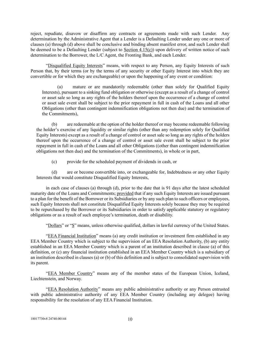 18017730v8 24740.00144 10 reject, repudiate, disavow or disaffirm any contracts or agreements made with such Lender. Any determination by the Administrative Agent that a Lender is a Defaulting Lender under any one or more of clauses (a) through (d) above shall be conclusive and binding absent manifest error, and such Lender shall be deemed to be a Defaulting Lender (subject to Section 4.15(c)) upon delivery of written notice of such determination to the Borrower, the L/C Agent, the Fronting Bank, and each Lender. “Disqualified Equity Interests” means, with respect to any Person, any Equity Interests of such Person that, by their terms (or by the terms of any security or other Equity Interest into which they are convertible or for which they are exchangeable) or upon the happening of any event or condition: (a) mature or are mandatorily redeemable (other than solely for Qualified Equity Interests), pursuant to a sinking fund obligation or otherwise (except as a result of a change of control or asset sale so long as any rights of the holders thereof upon the occurrence of a change of control or asset sale event shall be subject to the prior repayment in full in cash of the Loans and all other Obligations (other than contingent indemnification obligations not then due) and the termination of the Commitments), (b) are redeemable at the option of the holder thereof or may become redeemable following the holder’s exercise of any liquidity or similar rights (other than any redemption solely for Qualified Equity Interests) except as a result of a change of control or asset sale so long as any rights of the holders thereof upon the occurrence of a change of control or asset sale event shall be subject to the prior repayment in full in cash of the Loans and all other Obligations ((other than contingent indemnification obligations not then due) and the termination of the Commitments), in whole or in part, (c) provide for the scheduled payment of dividends in cash, or (d) are or become convertible into, or exchangeable for, Indebtedness or any other Equity Interests that would constitute Disqualified Equity Interests, in each case of clauses (a) through (d), prior to the date that is 91 days after the latest scheduled maturity date of the Loans and Commitments; provided that if any such Equity Interests are issued pursuant to a plan for the benefit of the Borrower or its Subsidiaries or by any such plan to such officers or employees, such Equity Interests shall not constitute Disqualified Equity Interests solely because they may be required to be repurchased by the Borrower or its Subsidiaries in order to satisfy applicable statutory or regulatory obligations or as a result of such employee’s termination, death or disability. “Dollars” or “$” means, unless otherwise qualified, dollars in lawful currency of the United States. “EEA Financial Institution” means (a) any credit institution or investment firm established in any EEA Member Country which is subject to the supervision of an EEA Resolution Authority, (b) any entity established in an EEA Member Country which is a parent of an institution described in clause (a) of this definition, or (c) any financial institution established in an EEA Member Country which is a subsidiary of an institution described in clauses (a) or (b) of this definition and is subject to consolidated supervision with its parent. “EEA Member Country” means any of the member states of the European Union, Iceland, Liechtenstein, and Norway. “EEA Resolution Authority” means any public administrative authority or any Person entrusted with public administrative authority of any EEA Member Country (including any delegee) having responsibility for the resolution of any EEA Financial Institution.