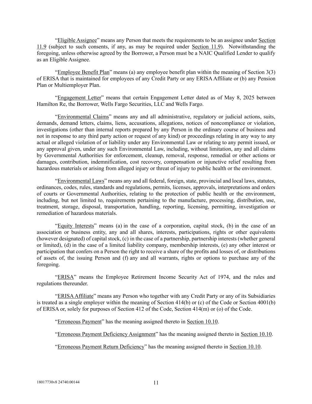 18017730v8 24740.00144 11 “Eligible Assignee” means any Person that meets the requirements to be an assignee under Section 11.9 (subject to such consents, if any, as may be required under Section 11.9). Notwithstanding the foregoing, unless otherwise agreed by the Borrower, a Person must be a NAIC Qualified Lender to qualify as an Eligible Assignee. “Employee Benefit Plan” means (a) any employee benefit plan within the meaning of Section 3(3) of ERISA that is maintained for employees of any Credit Party or any ERISA Affiliate or (b) any Pension Plan or Multiemployer Plan. “Engagement Letter” means that certain Engagement Letter dated as of May 8, 2025 between Hamilton Re, the Borrower, Wells Fargo Securities, LLC and Wells Fargo. “Environmental Claims” means any and all administrative, regulatory or judicial actions, suits, demands, demand letters, claims, liens, accusations, allegations, notices of noncompliance or violation, investigations (other than internal reports prepared by any Person in the ordinary course of business and not in response to any third party action or request of any kind) or proceedings relating in any way to any actual or alleged violation of or liability under any Environmental Law or relating to any permit issued, or any approval given, under any such Environmental Law, including, without limitation, any and all claims by Governmental Authorities for enforcement, cleanup, removal, response, remedial or other actions or damages, contribution, indemnification, cost recovery, compensation or injunctive relief resulting from hazardous materials or arising from alleged injury or threat of injury to public health or the environment. “Environmental Laws” means any and all federal, foreign, state, provincial and local laws, statutes, ordinances, codes, rules, standards and regulations, permits, licenses, approvals, interpretations and orders of courts or Governmental Authorities, relating to the protection of public health or the environment, including, but not limited to, requirements pertaining to the manufacture, processing, distribution, use, treatment, storage, disposal, transportation, handling, reporting, licensing, permitting, investigation or remediation of hazardous materials. “Equity Interests” means (a) in the case of a corporation, capital stock, (b) in the case of an association or business entity, any and all shares, interests, participations, rights or other equivalents (however designated) of capital stock, (c) in the case of a partnership, partnership interests (whether general or limited), (d) in the case of a limited liability company, membership interests, (e) any other interest or participation that confers on a Person the right to receive a share of the profits and losses of, or distributions of assets of, the issuing Person and (f) any and all warrants, rights or options to purchase any of the foregoing. “ERISA” means the Employee Retirement Income Security Act of 1974, and the rules and regulations thereunder. “ERISA Affiliate” means any Person who together with any Credit Party or any of its Subsidiaries is treated as a single employer within the meaning of Section 414(b) or (c) of the Code or Section 4001(b) of ERISA or, solely for purposes of Section 412 of the Code, Section 414(m) or (o) of the Code. “Erroneous Payment” has the meaning assigned thereto in Section 10.10. “Erroneous Payment Deficiency Assignment” has the meaning assigned thereto in Section 10.10. “Erroneous Payment Return Deficiency” has the meaning assigned thereto in Section 10.10.