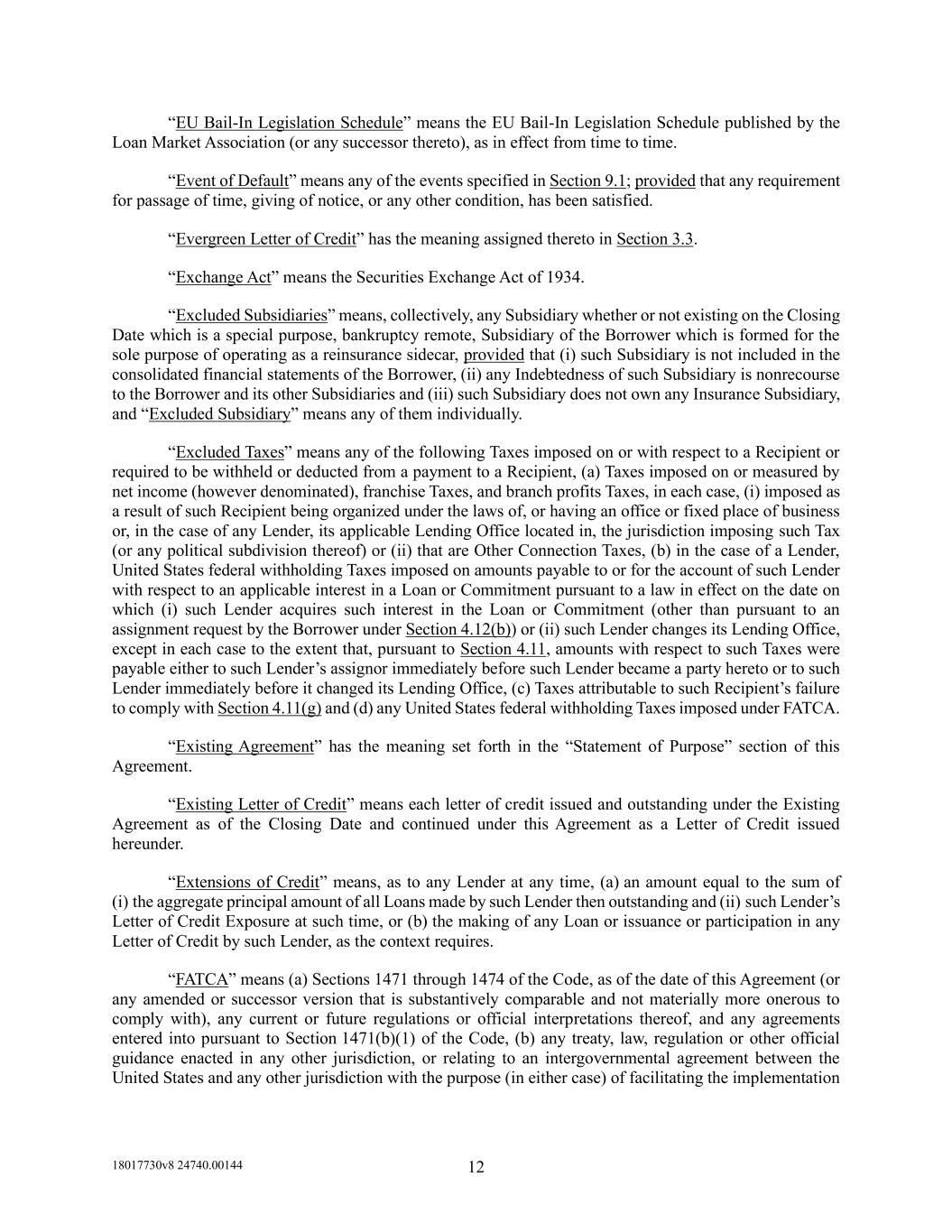 18017730v8 24740.00144 12 “EU Bail-In Legislation Schedule” means the EU Bail-In Legislation Schedule published by the Loan Market Association (or any successor thereto), as in effect from time to time. “Event of Default” means any of the events specified in Section 9.1; provided that any requirement for passage of time, giving of notice, or any other condition, has been satisfied. “Evergreen Letter of Credit” has the meaning assigned thereto in Section 3.3. “Exchange Act” means the Securities Exchange Act of 1934. “Excluded Subsidiaries” means, collectively, any Subsidiary whether or not existing on the Closing Date which is a special purpose, bankruptcy remote, Subsidiary of the Borrower which is formed for the sole purpose of operating as a reinsurance sidecar, provided that (i) such Subsidiary is not included in the consolidated financial statements of the Borrower, (ii) any Indebtedness of such Subsidiary is nonrecourse to the Borrower and its other Subsidiaries and (iii) such Subsidiary does not own any Insurance Subsidiary, and “Excluded Subsidiary” means any of them individually. “Excluded Taxes” means any of the following Taxes imposed on or with respect to a Recipient or required to be withheld or deducted from a payment to a Recipient, (a) Taxes imposed on or measured by net income (however denominated), franchise Taxes, and branch profits Taxes, in each case, (i) imposed as a result of such Recipient being organized under the laws of, or having an office or fixed place of business or, in the case of any Lender, its applicable Lending Office located in, the jurisdiction imposing such Tax (or any political subdivision thereof) or (ii) that are Other Connection Taxes, (b) in the case of a Lender, United States federal withholding Taxes imposed on amounts payable to or for the account of such Lender with respect to an applicable interest in a Loan or Commitment pursuant to a law in effect on the date on which (i) such Lender acquires such interest in the Loan or Commitment (other than pursuant to an assignment request by the Borrower under Section 4.12(b)) or (ii) such Lender changes its Lending Office, except in each case to the extent that, pursuant to Section 4.11, amounts with respect to such Taxes were payable either to such Lender’s assignor immediately before such Lender became a party hereto or to such Lender immediately before it changed its Lending Office, (c) Taxes attributable to such Recipient’s failure to comply with Section 4.11(g) and (d) any United States federal withholding Taxes imposed under FATCA. “Existing Agreement” has the meaning set forth in the “Statement of Purpose” section of this Agreement. “Existing Letter of Credit” means each letter of credit issued and outstanding under the Existing Agreement as of the Closing Date and continued under this Agreement as a Letter of Credit issued hereunder. “Extensions of Credit” means, as to any Lender at any time, (a) an amount equal to the sum of (i) the aggregate principal amount of all Loans made by such Lender then outstanding and (ii) such Lender’s Letter of Credit Exposure at such time, or (b) the making of any Loan or issuance or participation in any Letter of Credit by such Lender, as the context requires. “FATCA” means (a) Sections 1471 through 1474 of the Code, as of the date of this Agreement (or any amended or successor version that is substantively comparable and not materially more onerous to comply with), any current or future regulations or official interpretations thereof, and any agreements entered into pursuant to Section 1471(b)(1) of the Code, (b) any treaty, law, regulation or other official guidance enacted in any other jurisdiction, or relating to an intergovernmental agreement between the United States and any other jurisdiction with the purpose (in either case) of facilitating the implementation