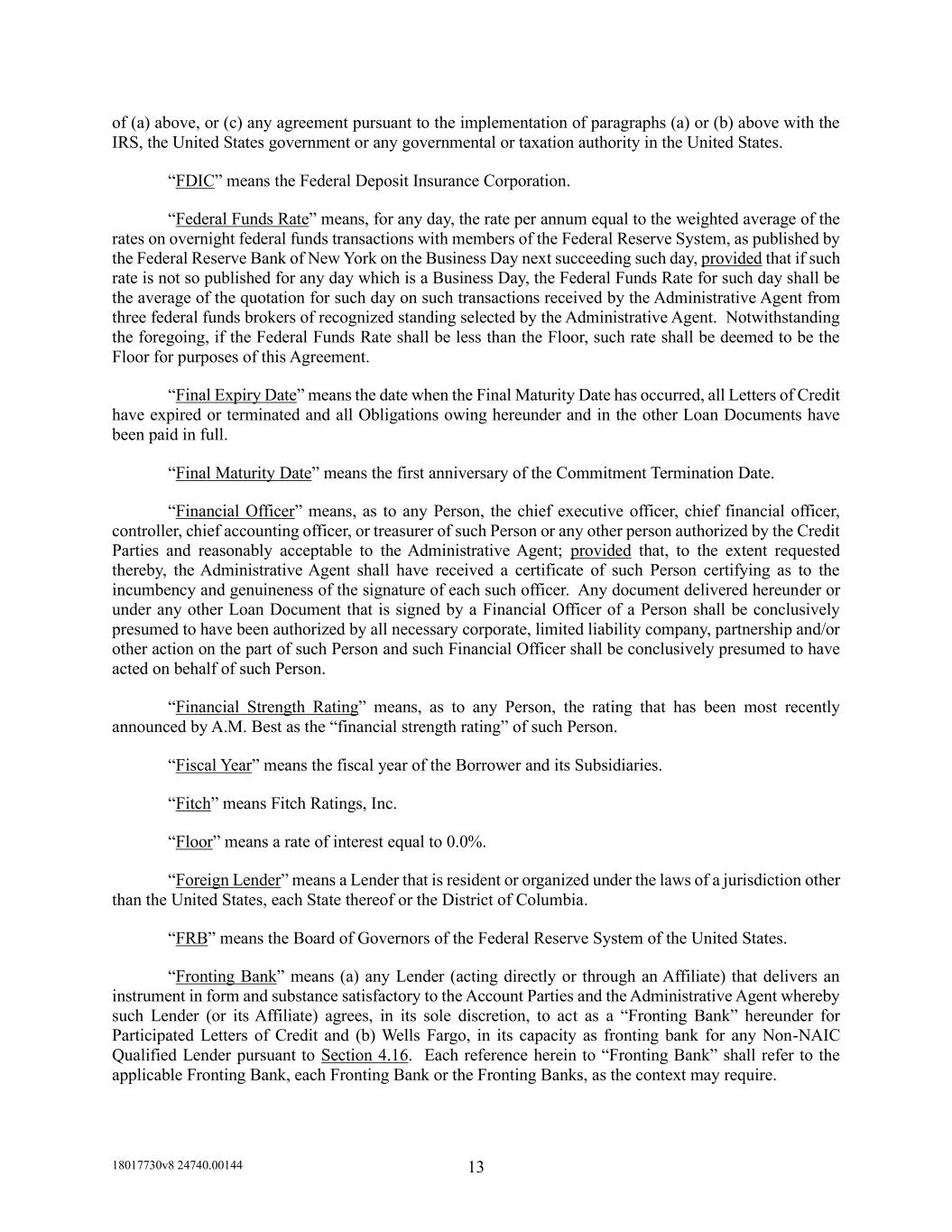 18017730v8 24740.00144 13 of (a) above, or (c) any agreement pursuant to the implementation of paragraphs (a) or (b) above with the IRS, the United States government or any governmental or taxation authority in the United States. “FDIC” means the Federal Deposit Insurance Corporation. “Federal Funds Rate” means, for any day, the rate per annum equal to the weighted average of the rates on overnight federal funds transactions with members of the Federal Reserve System, as published by the Federal Reserve Bank of New York on the Business Day next succeeding such day, provided that if such rate is not so published for any day which is a Business Day, the Federal Funds Rate for such day shall be the average of the quotation for such day on such transactions received by the Administrative Agent from three federal funds brokers of recognized standing selected by the Administrative Agent. Notwithstanding the foregoing, if the Federal Funds Rate shall be less than the Floor, such rate shall be deemed to be the Floor for purposes of this Agreement. “Final Expiry Date” means the date when the Final Maturity Date has occurred, all Letters of Credit have expired or terminated and all Obligations owing hereunder and in the other Loan Documents have been paid in full. “Final Maturity Date” means the first anniversary of the Commitment Termination Date. “Financial Officer” means, as to any Person, the chief executive officer, chief financial officer, controller, chief accounting officer, or treasurer of such Person or any other person authorized by the Credit Parties and reasonably acceptable to the Administrative Agent; provided that, to the extent requested thereby, the Administrative Agent shall have received a certificate of such Person certifying as to the incumbency and genuineness of the signature of each such officer. Any document delivered hereunder or under any other Loan Document that is signed by a Financial Officer of a Person shall be conclusively presumed to have been authorized by all necessary corporate, limited liability company, partnership and/or other action on the part of such Person and such Financial Officer shall be conclusively presumed to have acted on behalf of such Person. “Financial Strength Rating” means, as to any Person, the rating that has been most recently announced by A.M. Best as the “financial strength rating” of such Person. “Fiscal Year” means the fiscal year of the Borrower and its Subsidiaries. “Fitch” means Fitch Ratings, Inc. “Floor” means a rate of interest equal to 0.0%. “Foreign Lender” means a Lender that is resident or organized under the laws of a jurisdiction other than the United States, each State thereof or the District of Columbia. “FRB” means the Board of Governors of the Federal Reserve System of the United States. “Fronting Bank” means (a) any Lender (acting directly or through an Affiliate) that delivers an instrument in form and substance satisfactory to the Account Parties and the Administrative Agent whereby such Lender (or its Affiliate) agrees, in its sole discretion, to act as a “Fronting Bank” hereunder for Participated Letters of Credit and (b) Wells Fargo, in its capacity as fronting bank for any Non-NAIC Qualified Lender pursuant to Section 4.16. Each reference herein to “Fronting Bank” shall refer to the applicable Fronting Bank, each Fronting Bank or the Fronting Banks, as the context may require.