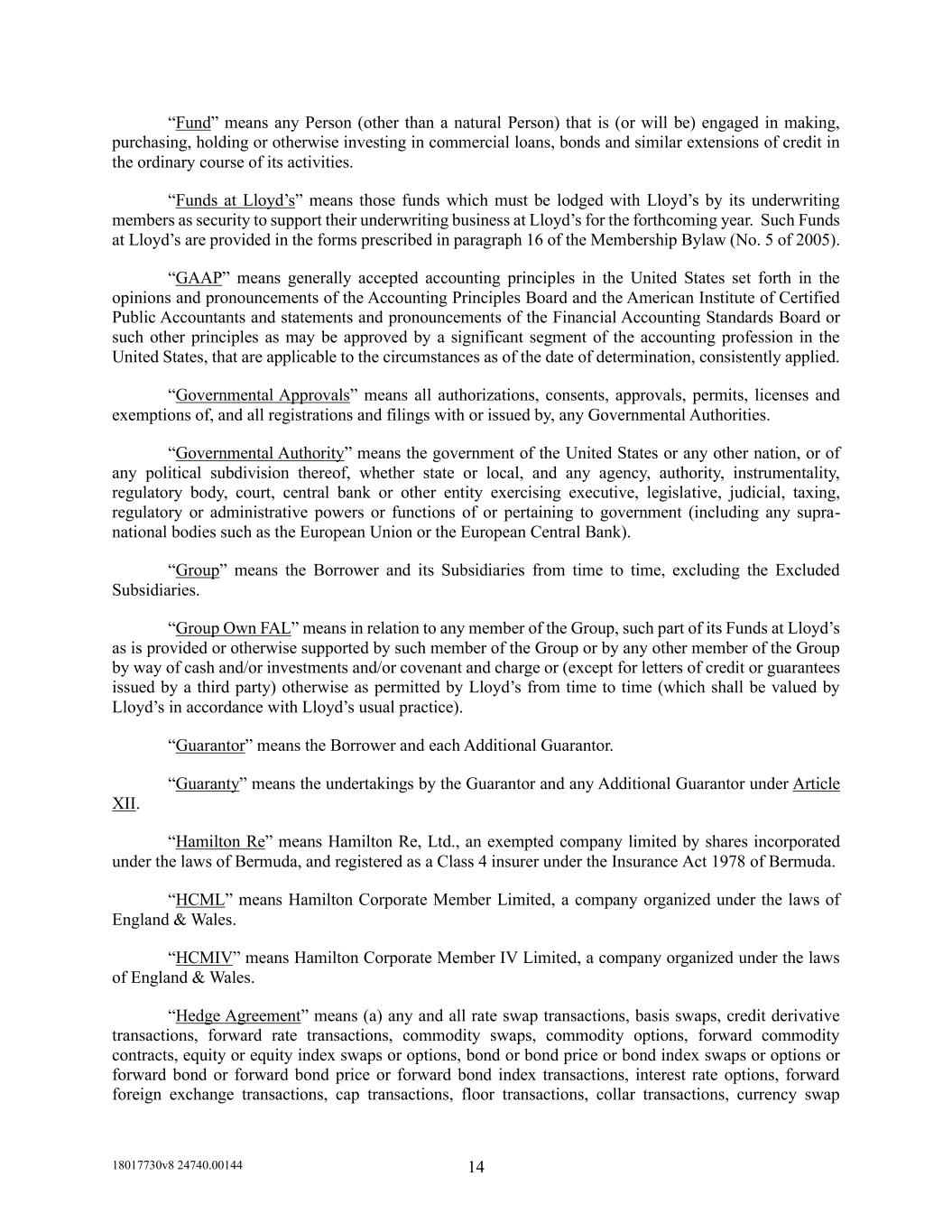 18017730v8 24740.00144 14 “Fund” means any Person (other than a natural Person) that is (or will be) engaged in making, purchasing, holding or otherwise investing in commercial loans, bonds and similar extensions of credit in the ordinary course of its activities. “Funds at Lloyd’s” means those funds which must be lodged with Lloyd’s by its underwriting members as security to support their underwriting business at Lloyd’s for the forthcoming year. Such Funds at Lloyd’s are provided in the forms prescribed in paragraph 16 of the Membership Bylaw (No. 5 of 2005). “GAAP” means generally accepted accounting principles in the United States set forth in the opinions and pronouncements of the Accounting Principles Board and the American Institute of Certified Public Accountants and statements and pronouncements of the Financial Accounting Standards Board or such other principles as may be approved by a significant segment of the accounting profession in the United States, that are applicable to the circumstances as of the date of determination, consistently applied. “Governmental Approvals” means all authorizations, consents, approvals, permits, licenses and exemptions of, and all registrations and filings with or issued by, any Governmental Authorities. “Governmental Authority” means the government of the United States or any other nation, or of any political subdivision thereof, whether state or local, and any agency, authority, instrumentality, regulatory body, court, central bank or other entity exercising executive, legislative, judicial, taxing, regulatory or administrative powers or functions of or pertaining to government (including any supra- national bodies such as the European Union or the European Central Bank). “Group” means the Borrower and its Subsidiaries from time to time, excluding the Excluded Subsidiaries. “Group Own FAL” means in relation to any member of the Group, such part of its Funds at Lloyd’s as is provided or otherwise supported by such member of the Group or by any other member of the Group by way of cash and/or investments and/or covenant and charge or (except for letters of credit or guarantees issued by a third party) otherwise as permitted by Lloyd’s from time to time (which shall be valued by Lloyd’s in accordance with Lloyd’s usual practice). “Guarantor” means the Borrower and each Additional Guarantor. “Guaranty” means the undertakings by the Guarantor and any Additional Guarantor under Article XII. “Hamilton Re” means Hamilton Re, Ltd., an exempted company limited by shares incorporated under the laws of Bermuda, and registered as a Class 4 insurer under the Insurance Act 1978 of Bermuda. “HCML” means Hamilton Corporate Member Limited, a company organized under the laws of England & Wales. “HCMIV” means Hamilton Corporate Member IV Limited, a company organized under the laws of England & Wales. “Hedge Agreement” means (a) any and all rate swap transactions, basis swaps, credit derivative transactions, forward rate transactions, commodity swaps, commodity options, forward commodity contracts, equity or equity index swaps or options, bond or bond price or bond index swaps or options or forward bond or forward bond price or forward bond index transactions, interest rate options, forward foreign exchange transactions, cap transactions, floor transactions, collar transactions, currency swap