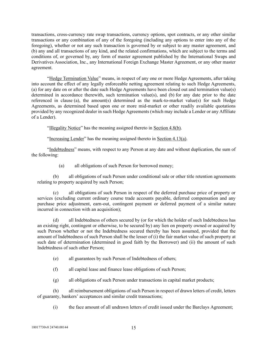 18017730v8 24740.00144 15 transactions, cross-currency rate swap transactions, currency options, spot contracts, or any other similar transactions or any combination of any of the foregoing (including any options to enter into any of the foregoing), whether or not any such transaction is governed by or subject to any master agreement, and (b) any and all transactions of any kind, and the related confirmations, which are subject to the terms and conditions of, or governed by, any form of master agreement published by the International Swaps and Derivatives Association, Inc., any International Foreign Exchange Master Agreement, or any other master agreement. “Hedge Termination Value” means, in respect of any one or more Hedge Agreements, after taking into account the effect of any legally enforceable netting agreement relating to such Hedge Agreements, (a) for any date on or after the date such Hedge Agreements have been closed out and termination value(s) determined in accordance therewith, such termination value(s), and (b) for any date prior to the date referenced in clause (a), the amount(s) determined as the mark-to-market value(s) for such Hedge Agreements, as determined based upon one or more mid-market or other readily available quotations provided by any recognized dealer in such Hedge Agreements (which may include a Lender or any Affiliate of a Lender). “Illegality Notice” has the meaning assigned thereto in Section 4.8(b). “Increasing Lender” has the meaning assigned thereto in Section 4.13(a). “Indebtedness” means, with respect to any Person at any date and without duplication, the sum of the following: (a) all obligations of such Person for borrowed money; (b) all obligations of such Person under conditional sale or other title retention agreements relating to property acquired by such Person; (c) all obligations of such Person in respect of the deferred purchase price of property or services (excluding current ordinary course trade accounts payable, deferred compensation and any purchase price adjustment, earn-out, contingent payment or deferred payment of a similar nature incurred in connection with an acquisition); (d) all Indebtedness of others secured by (or for which the holder of such Indebtedness has an existing right, contingent or otherwise, to be secured by) any lien on property owned or acquired by such Person whether or not the Indebtedness secured thereby has been assumed, provided that the amount of Indebtedness of such Person shall be the lesser of (i) the fair market value of such property at such date of determination (determined in good faith by the Borrower) and (ii) the amount of such Indebtedness of such other Person; (e) all guarantees by such Person of Indebtedness of others; (f) all capital lease and finance lease obligations of such Person; (g) all obligations of such Person under transactions in capital market products; (h) all reimbursement obligations of such Person in respect of drawn letters of credit, letters of guaranty, bankers’ acceptances and similar credit transactions; (i) the face amount of all undrawn letters of credit issued under the Barclays Agreement;