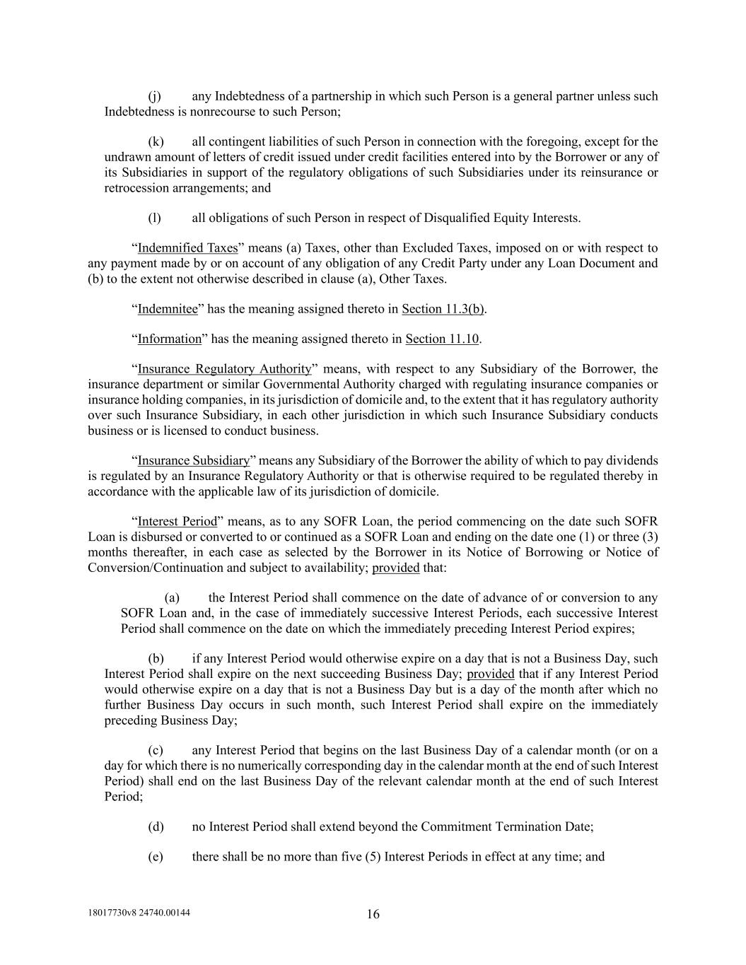 18017730v8 24740.00144 16 (j) any Indebtedness of a partnership in which such Person is a general partner unless such Indebtedness is nonrecourse to such Person; (k) all contingent liabilities of such Person in connection with the foregoing, except for the undrawn amount of letters of credit issued under credit facilities entered into by the Borrower or any of its Subsidiaries in support of the regulatory obligations of such Subsidiaries under its reinsurance or retrocession arrangements; and (l) all obligations of such Person in respect of Disqualified Equity Interests. “Indemnified Taxes” means (a) Taxes, other than Excluded Taxes, imposed on or with respect to any payment made by or on account of any obligation of any Credit Party under any Loan Document and (b) to the extent not otherwise described in clause (a), Other Taxes. “Indemnitee” has the meaning assigned thereto in Section 11.3(b). “Information” has the meaning assigned thereto in Section 11.10. “Insurance Regulatory Authority” means, with respect to any Subsidiary of the Borrower, the insurance department or similar Governmental Authority charged with regulating insurance companies or insurance holding companies, in its jurisdiction of domicile and, to the extent that it has regulatory authority over such Insurance Subsidiary, in each other jurisdiction in which such Insurance Subsidiary conducts business or is licensed to conduct business. “Insurance Subsidiary” means any Subsidiary of the Borrower the ability of which to pay dividends is regulated by an Insurance Regulatory Authority or that is otherwise required to be regulated thereby in accordance with the applicable law of its jurisdiction of domicile. “Interest Period” means, as to any SOFR Loan, the period commencing on the date such SOFR Loan is disbursed or converted to or continued as a SOFR Loan and ending on the date one (1) or three (3) months thereafter, in each case as selected by the Borrower in its Notice of Borrowing or Notice of Conversion/Continuation and subject to availability; provided that: (a) the Interest Period shall commence on the date of advance of or conversion to any SOFR Loan and, in the case of immediately successive Interest Periods, each successive Interest Period shall commence on the date on which the immediately preceding Interest Period expires; (b) if any Interest Period would otherwise expire on a day that is not a Business Day, such Interest Period shall expire on the next succeeding Business Day; provided that if any Interest Period would otherwise expire on a day that is not a Business Day but is a day of the month after which no further Business Day occurs in such month, such Interest Period shall expire on the immediately preceding Business Day; (c) any Interest Period that begins on the last Business Day of a calendar month (or on a day for which there is no numerically corresponding day in the calendar month at the end of such Interest Period) shall end on the last Business Day of the relevant calendar month at the end of such Interest Period; (d) no Interest Period shall extend beyond the Commitment Termination Date; (e) there shall be no more than five (5) Interest Periods in effect at any time; and