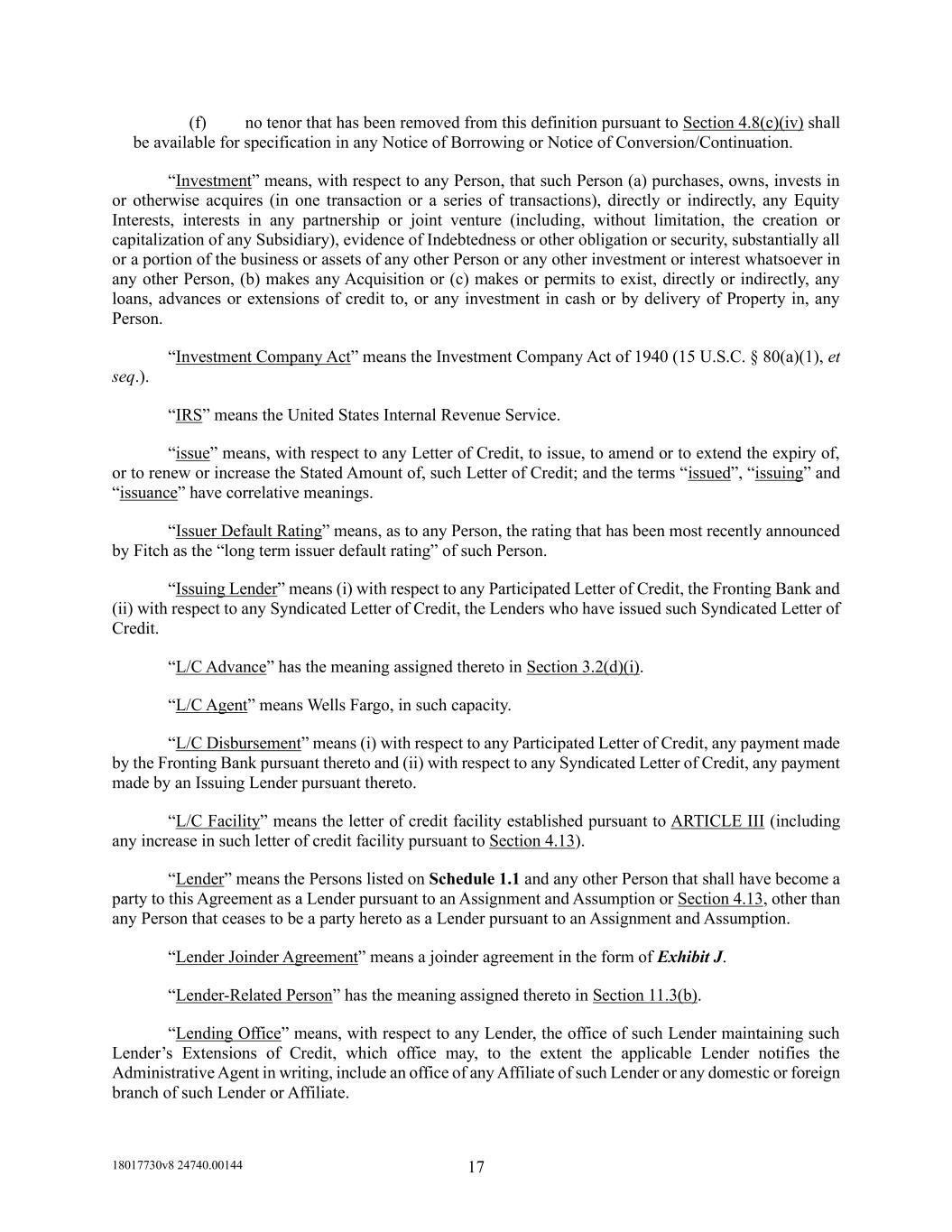 18017730v8 24740.00144 17 (f) no tenor that has been removed from this definition pursuant to Section 4.8(c)(iv) shall be available for specification in any Notice of Borrowing or Notice of Conversion/Continuation. “Investment” means, with respect to any Person, that such Person (a) purchases, owns, invests in or otherwise acquires (in one transaction or a series of transactions), directly or indirectly, any Equity Interests, interests in any partnership or joint venture (including, without limitation, the creation or capitalization of any Subsidiary), evidence of Indebtedness or other obligation or security, substantially all or a portion of the business or assets of any other Person or any other investment or interest whatsoever in any other Person, (b) makes any Acquisition or (c) makes or permits to exist, directly or indirectly, any loans, advances or extensions of credit to, or any investment in cash or by delivery of Property in, any Person. “Investment Company Act” means the Investment Company Act of 1940 (15 U.S.C. § 80(a)(1), et seq.). “IRS” means the United States Internal Revenue Service. “issue” means, with respect to any Letter of Credit, to issue, to amend or to extend the expiry of, or to renew or increase the Stated Amount of, such Letter of Credit; and the terms “issued”, “issuing” and “issuance” have correlative meanings. “Issuer Default Rating” means, as to any Person, the rating that has been most recently announced by Fitch as the “long term issuer default rating” of such Person. “Issuing Lender” means (i) with respect to any Participated Letter of Credit, the Fronting Bank and (ii) with respect to any Syndicated Letter of Credit, the Lenders who have issued such Syndicated Letter of Credit. “L/C Advance” has the meaning assigned thereto in Section 3.2(d)(i). “L/C Agent” means Wells Fargo, in such capacity. “L/C Disbursement” means (i) with respect to any Participated Letter of Credit, any payment made by the Fronting Bank pursuant thereto and (ii) with respect to any Syndicated Letter of Credit, any payment made by an Issuing Lender pursuant thereto. “L/C Facility” means the letter of credit facility established pursuant to ARTICLE III (including any increase in such letter of credit facility pursuant to Section 4.13). “Lender” means the Persons listed on Schedule 1.1 and any other Person that shall have become a party to this Agreement as a Lender pursuant to an Assignment and Assumption or Section 4.13, other than any Person that ceases to be a party hereto as a Lender pursuant to an Assignment and Assumption. “Lender Joinder Agreement” means a joinder agreement in the form of Exhibit J. “Lender-Related Person” has the meaning assigned thereto in Section 11.3(b). “Lending Office” means, with respect to any Lender, the office of such Lender maintaining such Lender’s Extensions of Credit, which office may, to the extent the applicable Lender notifies the Administrative Agent in writing, include an office of any Affiliate of such Lender or any domestic or foreign branch of such Lender or Affiliate.