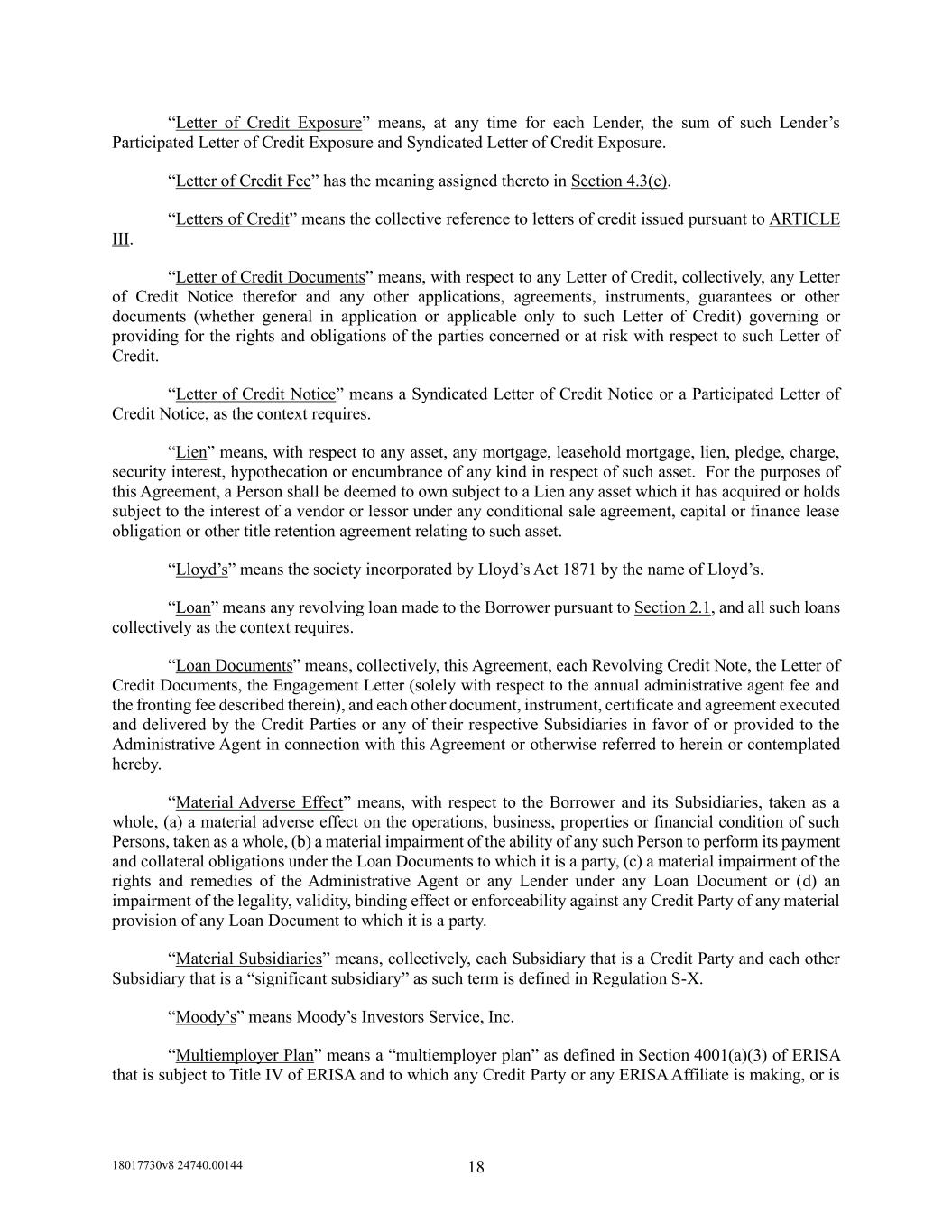 18017730v8 24740.00144 18 “Letter of Credit Exposure” means, at any time for each Lender, the sum of such Lender’s Participated Letter of Credit Exposure and Syndicated Letter of Credit Exposure. “Letter of Credit Fee” has the meaning assigned thereto in Section 4.3(c). “Letters of Credit” means the collective reference to letters of credit issued pursuant to ARTICLE III. “Letter of Credit Documents” means, with respect to any Letter of Credit, collectively, any Letter of Credit Notice therefor and any other applications, agreements, instruments, guarantees or other documents (whether general in application or applicable only to such Letter of Credit) governing or providing for the rights and obligations of the parties concerned or at risk with respect to such Letter of Credit. “Letter of Credit Notice” means a Syndicated Letter of Credit Notice or a Participated Letter of Credit Notice, as the context requires. “Lien” means, with respect to any asset, any mortgage, leasehold mortgage, lien, pledge, charge, security interest, hypothecation or encumbrance of any kind in respect of such asset. For the purposes of this Agreement, a Person shall be deemed to own subject to a Lien any asset which it has acquired or holds subject to the interest of a vendor or lessor under any conditional sale agreement, capital or finance lease obligation or other title retention agreement relating to such asset. “Lloyd’s” means the society incorporated by Lloyd’s Act 1871 by the name of Lloyd’s. “Loan” means any revolving loan made to the Borrower pursuant to Section 2.1, and all such loans collectively as the context requires. “Loan Documents” means, collectively, this Agreement, each Revolving Credit Note, the Letter of Credit Documents, the Engagement Letter (solely with respect to the annual administrative agent fee and the fronting fee described therein), and each other document, instrument, certificate and agreement executed and delivered by the Credit Parties or any of their respective Subsidiaries in favor of or provided to the Administrative Agent in connection with this Agreement or otherwise referred to herein or contemplated hereby. “Material Adverse Effect” means, with respect to the Borrower and its Subsidiaries, taken as a whole, (a) a material adverse effect on the operations, business, properties or financial condition of such Persons, taken as a whole, (b) a material impairment of the ability of any such Person to perform its payment and collateral obligations under the Loan Documents to which it is a party, (c) a material impairment of the rights and remedies of the Administrative Agent or any Lender under any Loan Document or (d) an impairment of the legality, validity, binding effect or enforceability against any Credit Party of any material provision of any Loan Document to which it is a party. “Material Subsidiaries” means, collectively, each Subsidiary that is a Credit Party and each other Subsidiary that is a “significant subsidiary” as such term is defined in Regulation S-X. “Moody’s” means Moody’s Investors Service, Inc. “Multiemployer Plan” means a “multiemployer plan” as defined in Section 4001(a)(3) of ERISA that is subject to Title IV of ERISA and to which any Credit Party or any ERISA Affiliate is making, or is