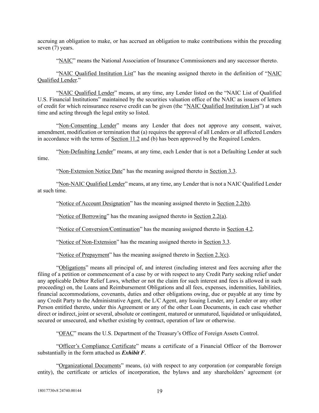 18017730v8 24740.00144 19 accruing an obligation to make, or has accrued an obligation to make contributions within the preceding seven (7) years. “NAIC” means the National Association of Insurance Commissioners and any successor thereto. “NAIC Qualified Institution List” has the meaning assigned thereto in the definition of “NAIC Qualified Lender.” “NAIC Qualified Lender” means, at any time, any Lender listed on the “NAIC List of Qualified U.S. Financial Institutions” maintained by the securities valuation office of the NAIC as issuers of letters of credit for which reinsurance reserve credit can be given (the “NAIC Qualified Institution List”) at such time and acting through the legal entity so listed. “Non-Consenting Lender” means any Lender that does not approve any consent, waiver, amendment, modification or termination that (a) requires the approval of all Lenders or all affected Lenders in accordance with the terms of Section 11.2 and (b) has been approved by the Required Lenders. “Non-Defaulting Lender” means, at any time, each Lender that is not a Defaulting Lender at such time. “Non-Extension Notice Date” has the meaning assigned thereto in Section 3.3. “Non-NAIC Qualified Lender” means, at any time, any Lender that is not a NAIC Qualified Lender at such time. “Notice of Account Designation” has the meaning assigned thereto in Section 2.2(b). “Notice of Borrowing” has the meaning assigned thereto in Section 2.2(a). “Notice of Conversion/Continuation” has the meaning assigned thereto in Section 4.2. “Notice of Non-Extension” has the meaning assigned thereto in Section 3.3. “Notice of Prepayment” has the meaning assigned thereto in Section 2.3(c). “Obligations” means all principal of, and interest (including interest and fees accruing after the filing of a petition or commencement of a case by or with respect to any Credit Party seeking relief under any applicable Debtor Relief Laws, whether or not the claim for such interest and fees is allowed in such proceeding) on, the Loans and Reimbursement Obligations and all fees, expenses, indemnities, liabilities, financial accommodations, covenants, duties and other obligations owing, due or payable at any time by any Credit Party to the Administrative Agent, the L/C Agent, any Issuing Lender, any Lender or any other Person entitled thereto, under this Agreement or any of the other Loan Documents, in each case whether direct or indirect, joint or several, absolute or contingent, matured or unmatured, liquidated or unliquidated, secured or unsecured, and whether existing by contract, operation of law or otherwise. “OFAC” means the U.S. Department of the Treasury’s Office of Foreign Assets Control. “Officer’s Compliance Certificate” means a certificate of a Financial Officer of the Borrower substantially in the form attached as Exhibit F. “Organizational Documents” means, (a) with respect to any corporation (or comparable foreign entity), the certificate or articles of incorporation, the bylaws and any shareholders’ agreement (or